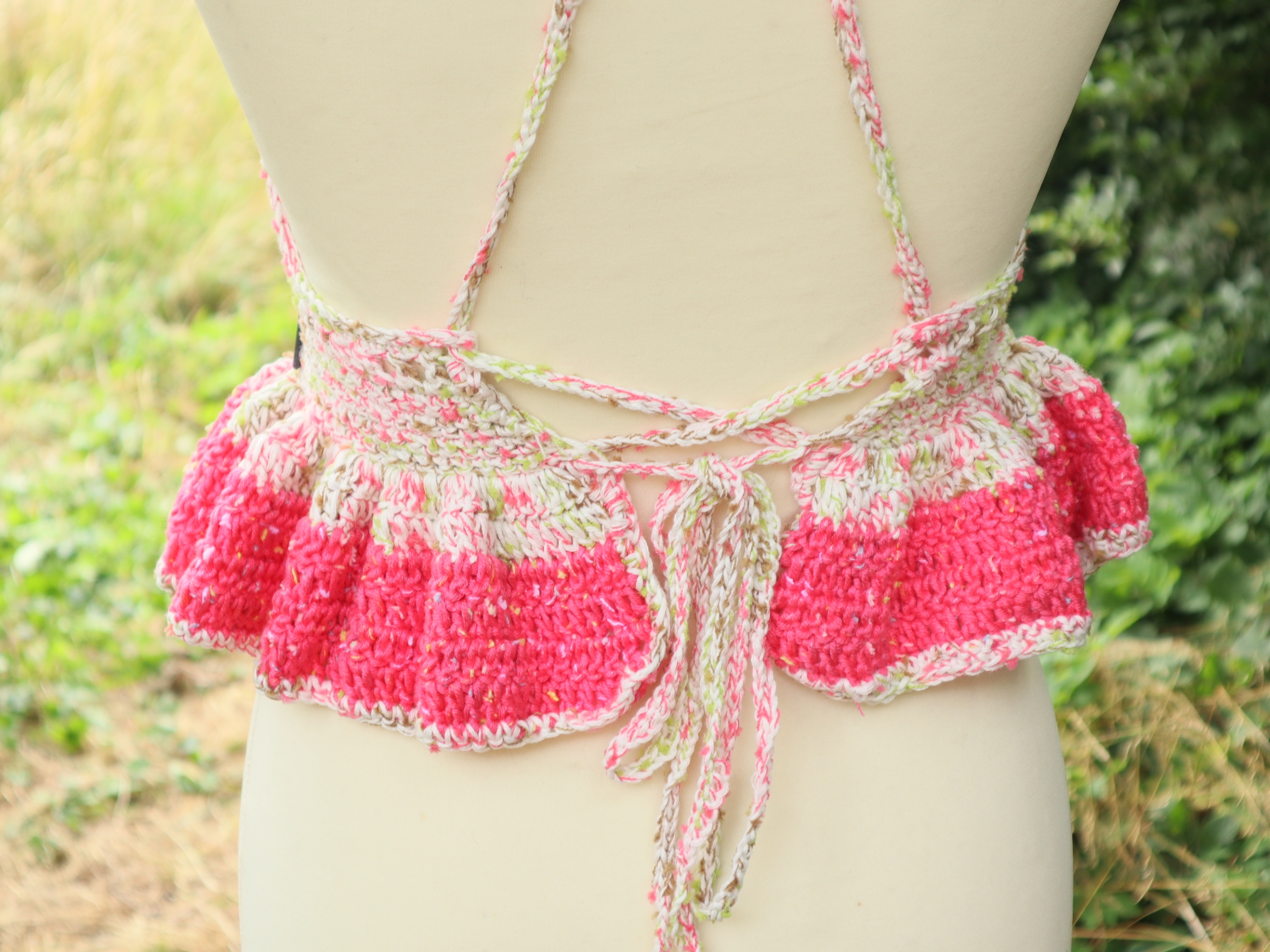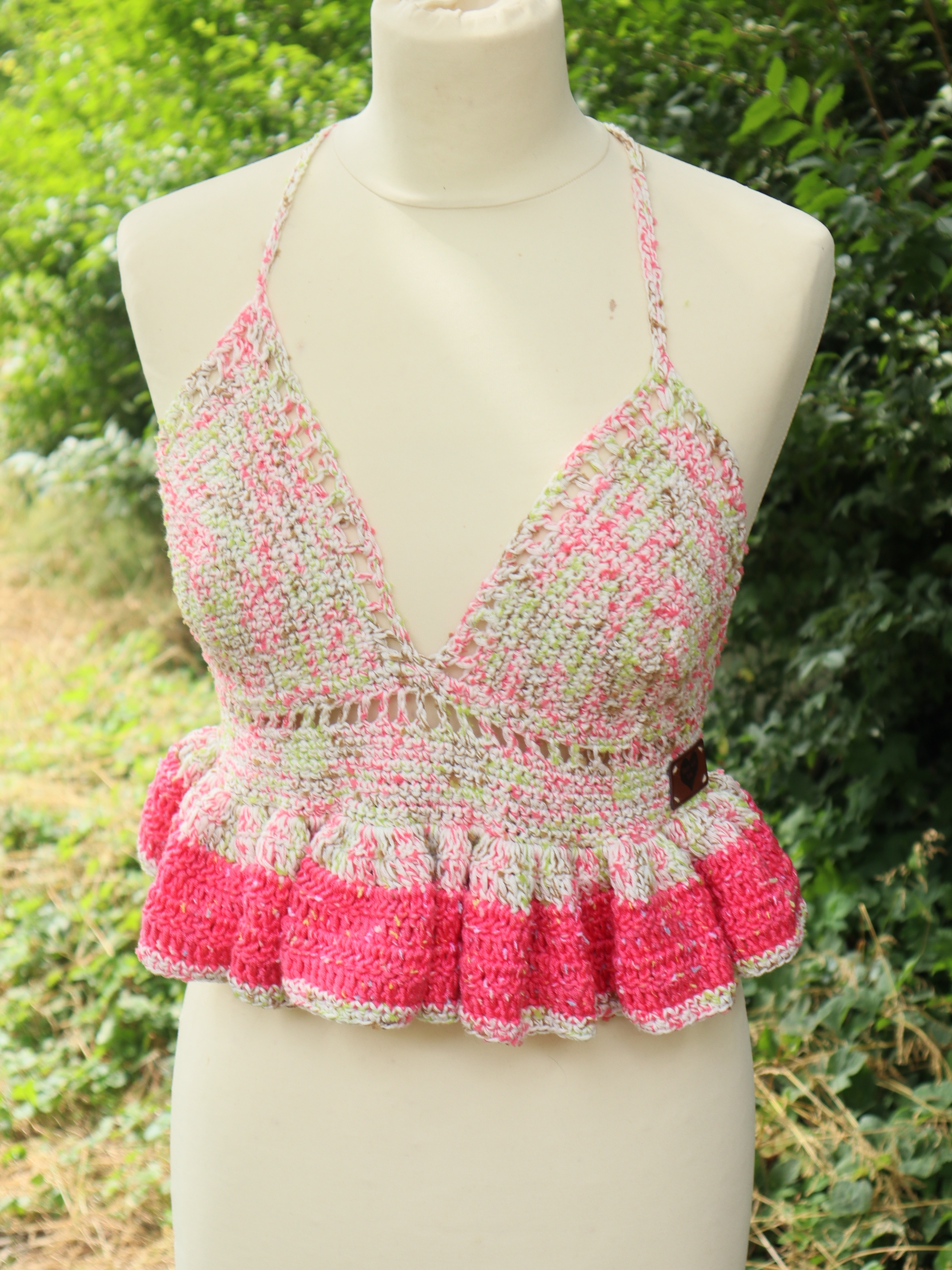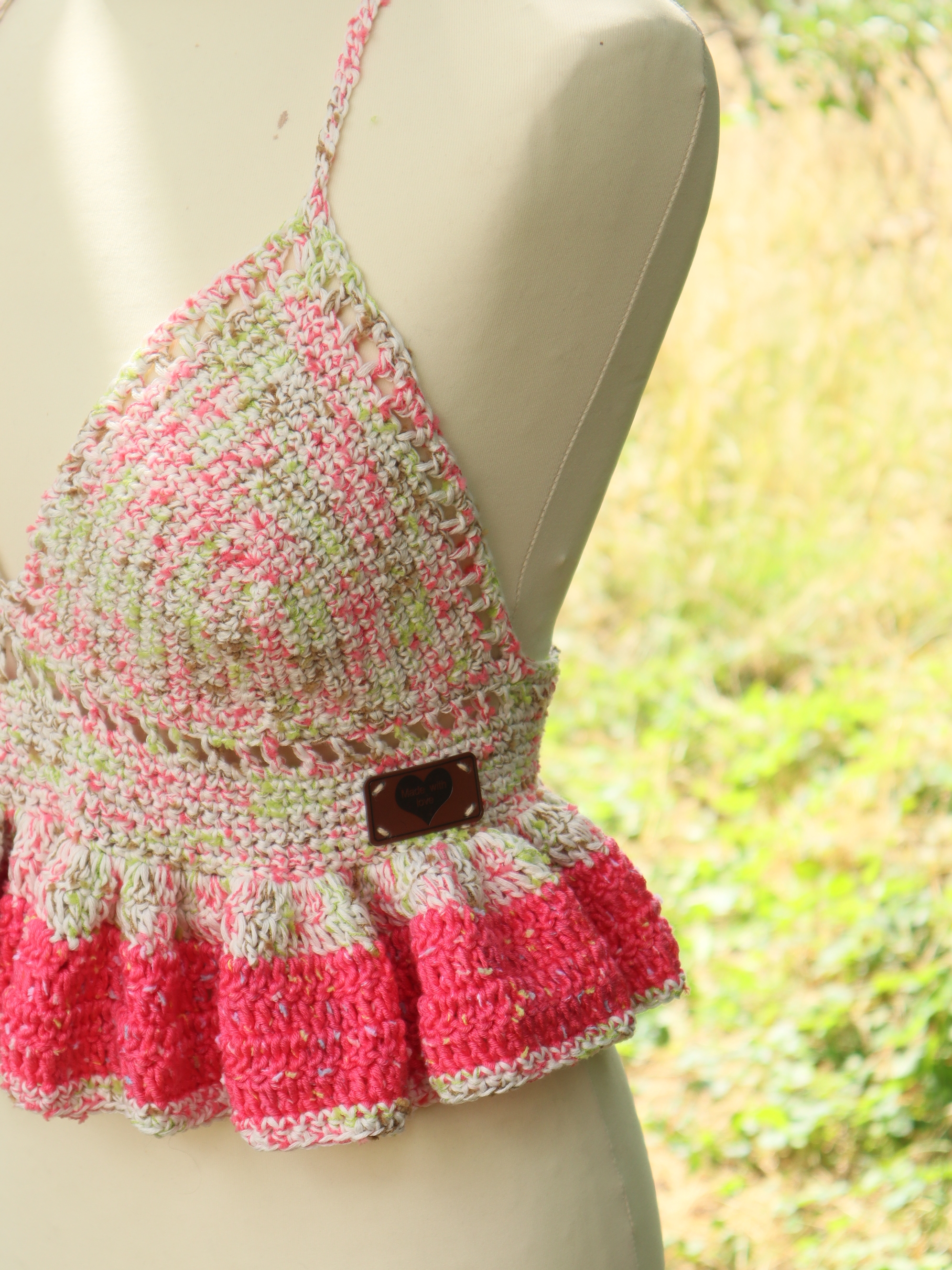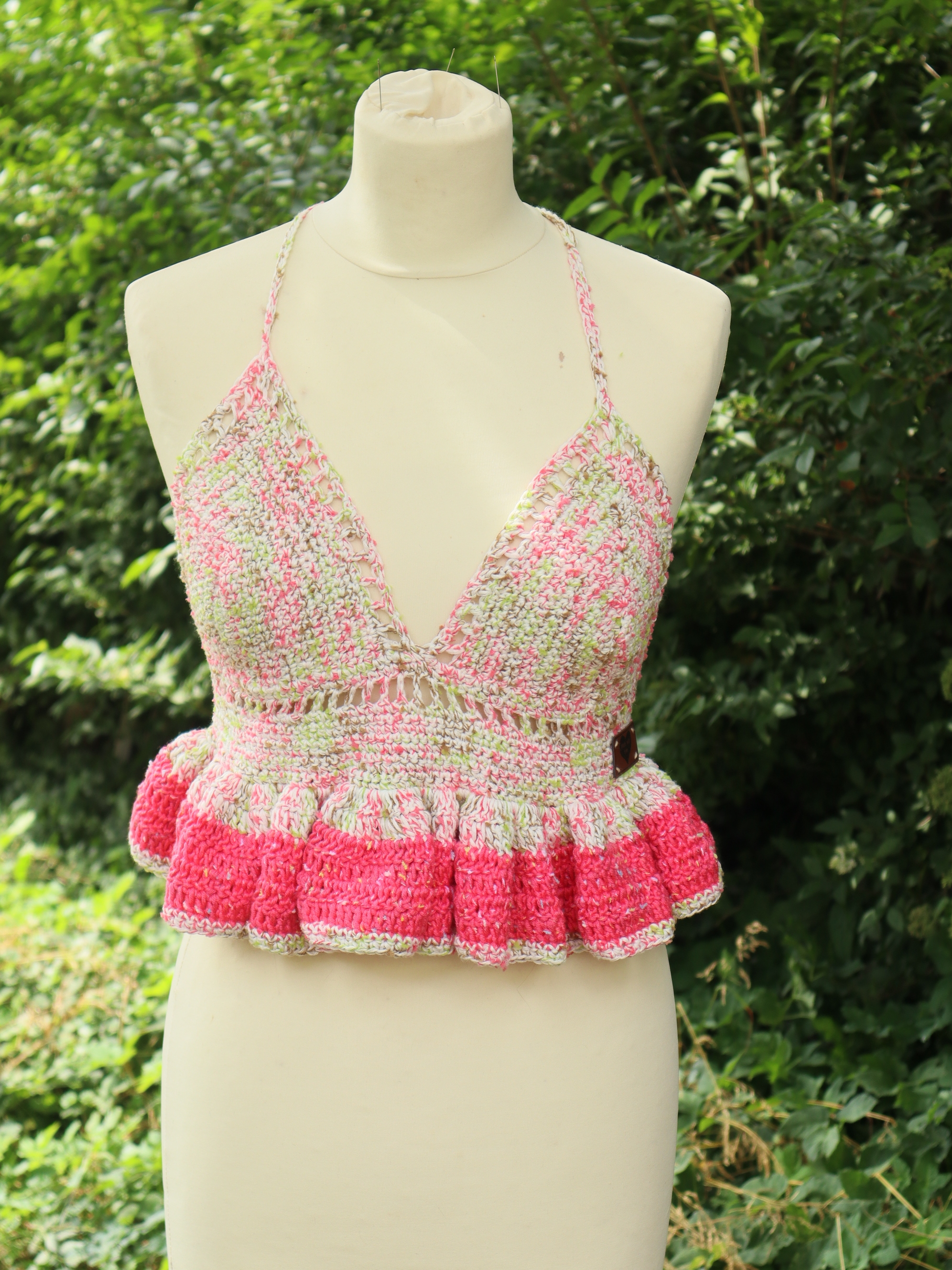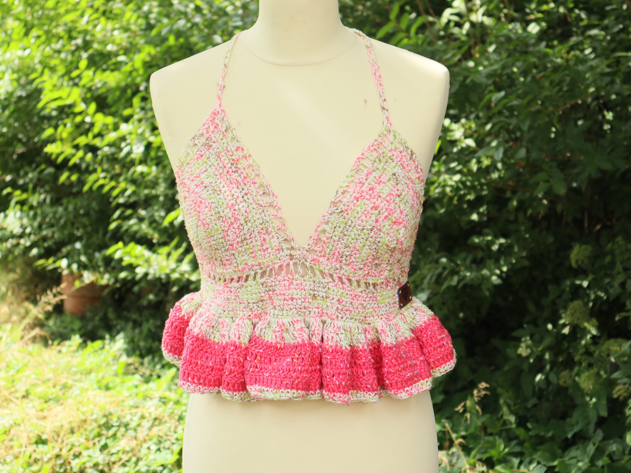Liebevoll von Hand gehäkeltes Sommertop aus Baumwolle und Acrylgarn in sommerlichen Farben. Durch die Schnürung im Rückenbereich kann es individuell angepasst werden.