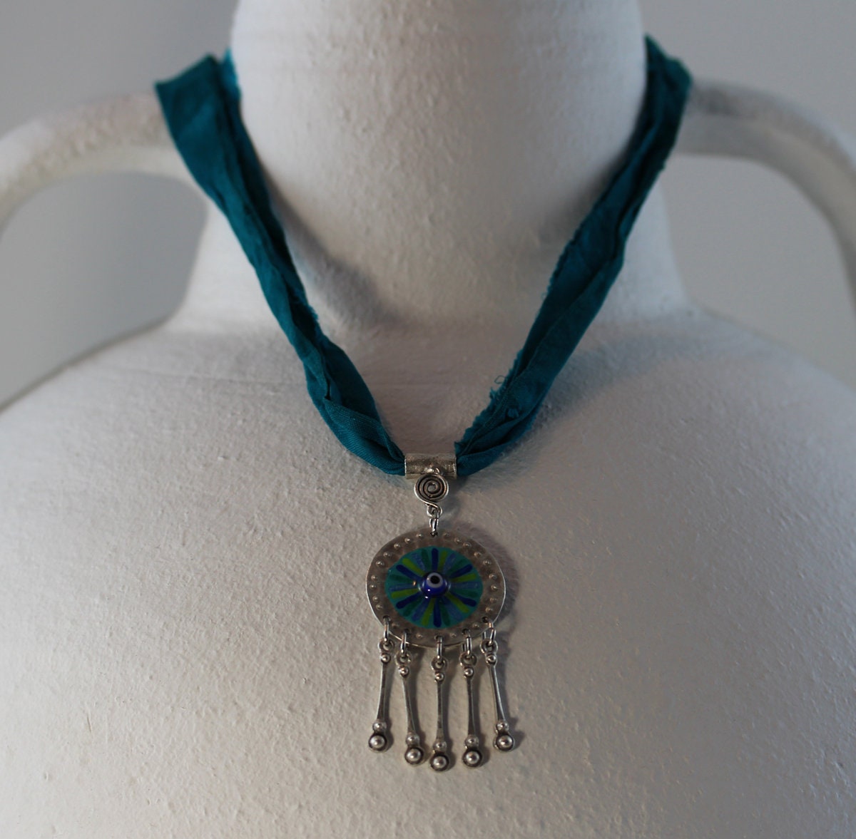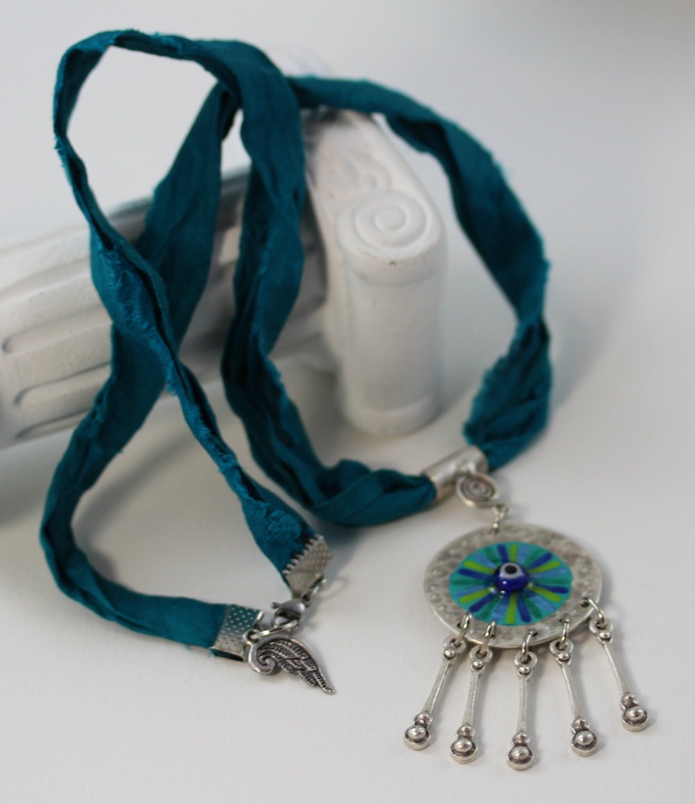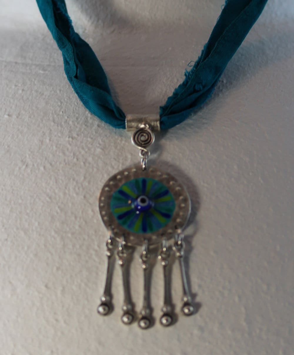 Die Materialien sind antiksilbern legiertes Metall, handgemaltes Eye of Hilarion mit eingelegter Glücksperle, kunstharzversiegelt, die Kette ist aus edlem Sariseidenband gefertigt. Der Anhänger misst insgesamt 7 x 3 cm, und die Kette aus Seide hat eine Länge von 50 cm.