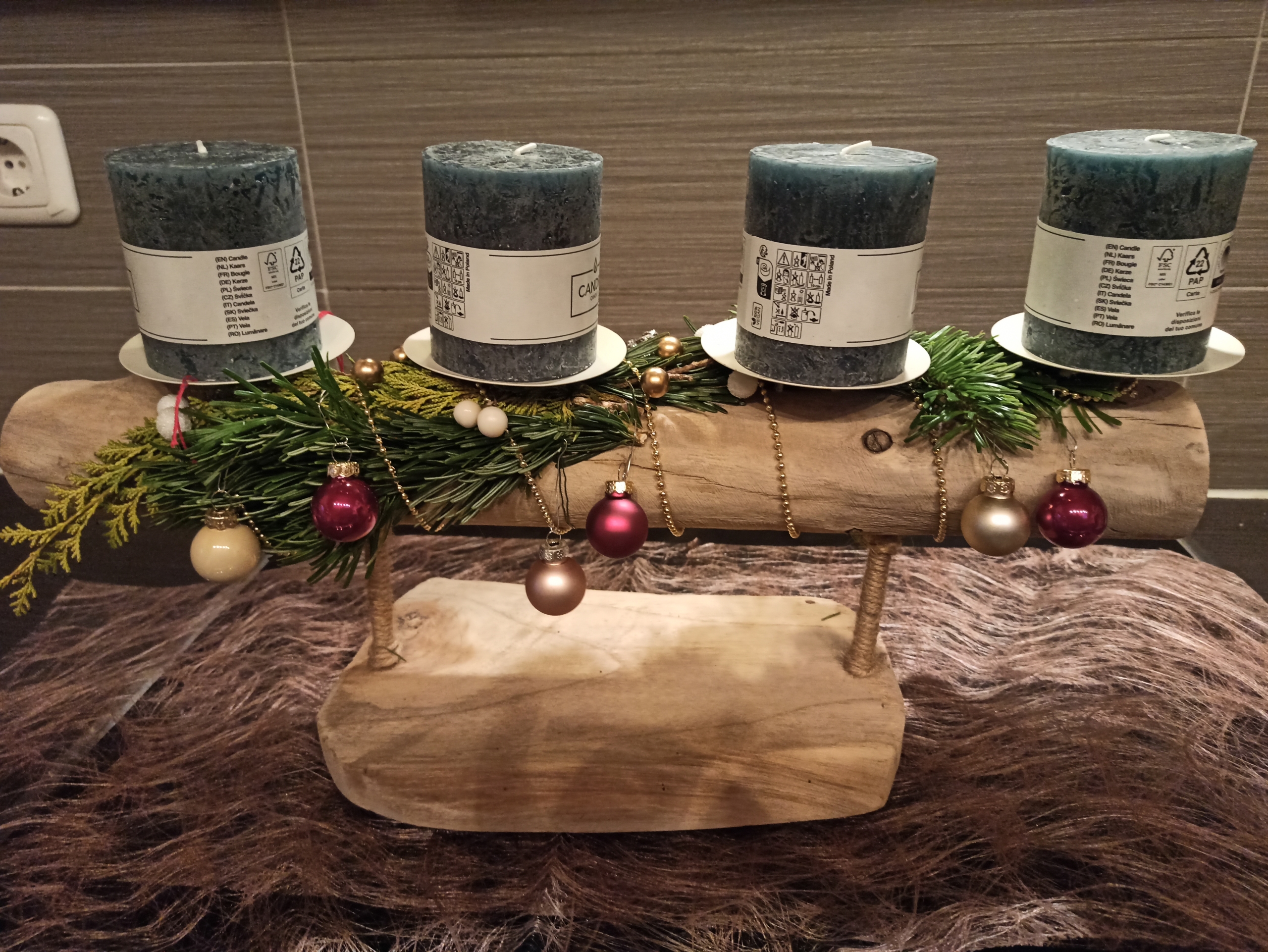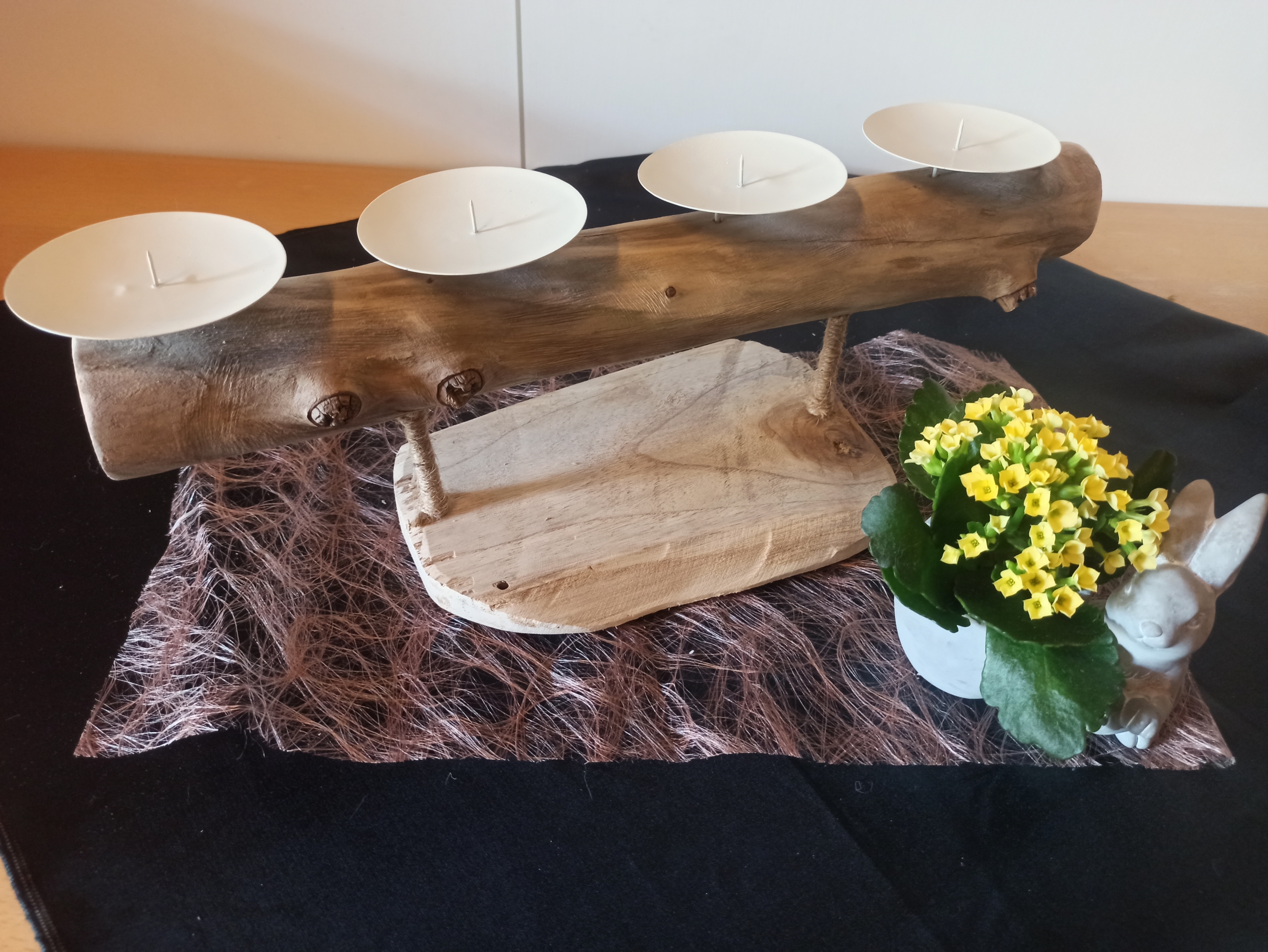 Die Kerzenhalter sind schwebend auf einer Teakholzplatte befestigt und mit 4 Metall-Kerzenhalter bestückt.