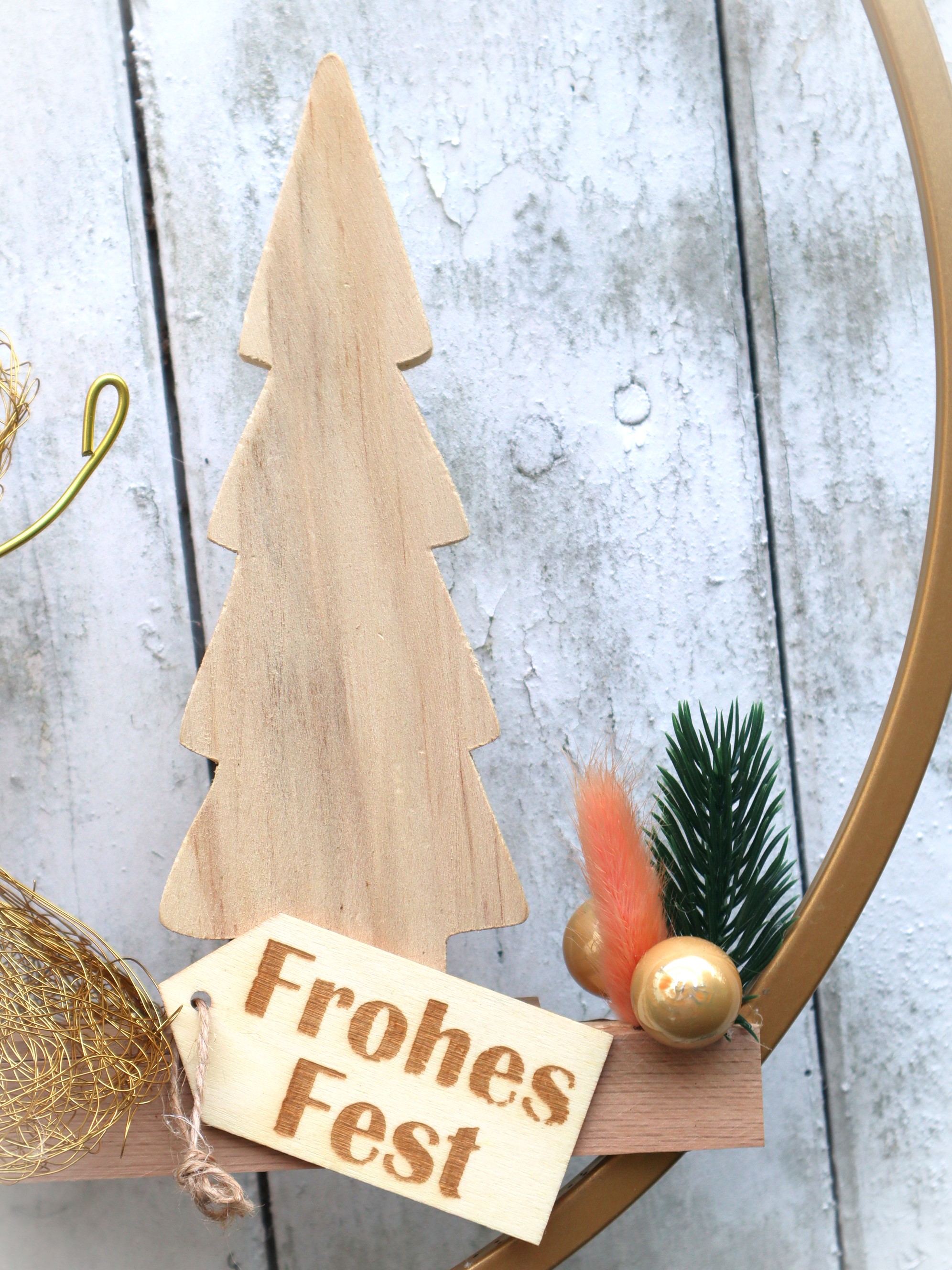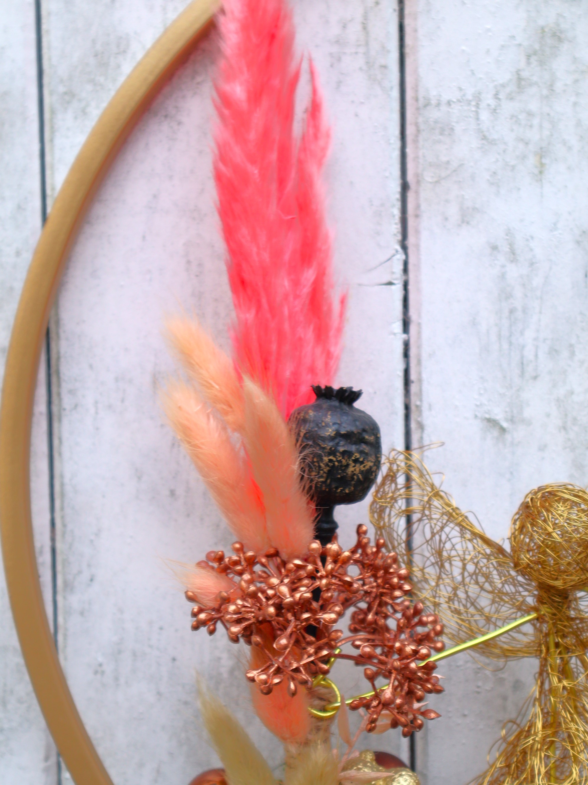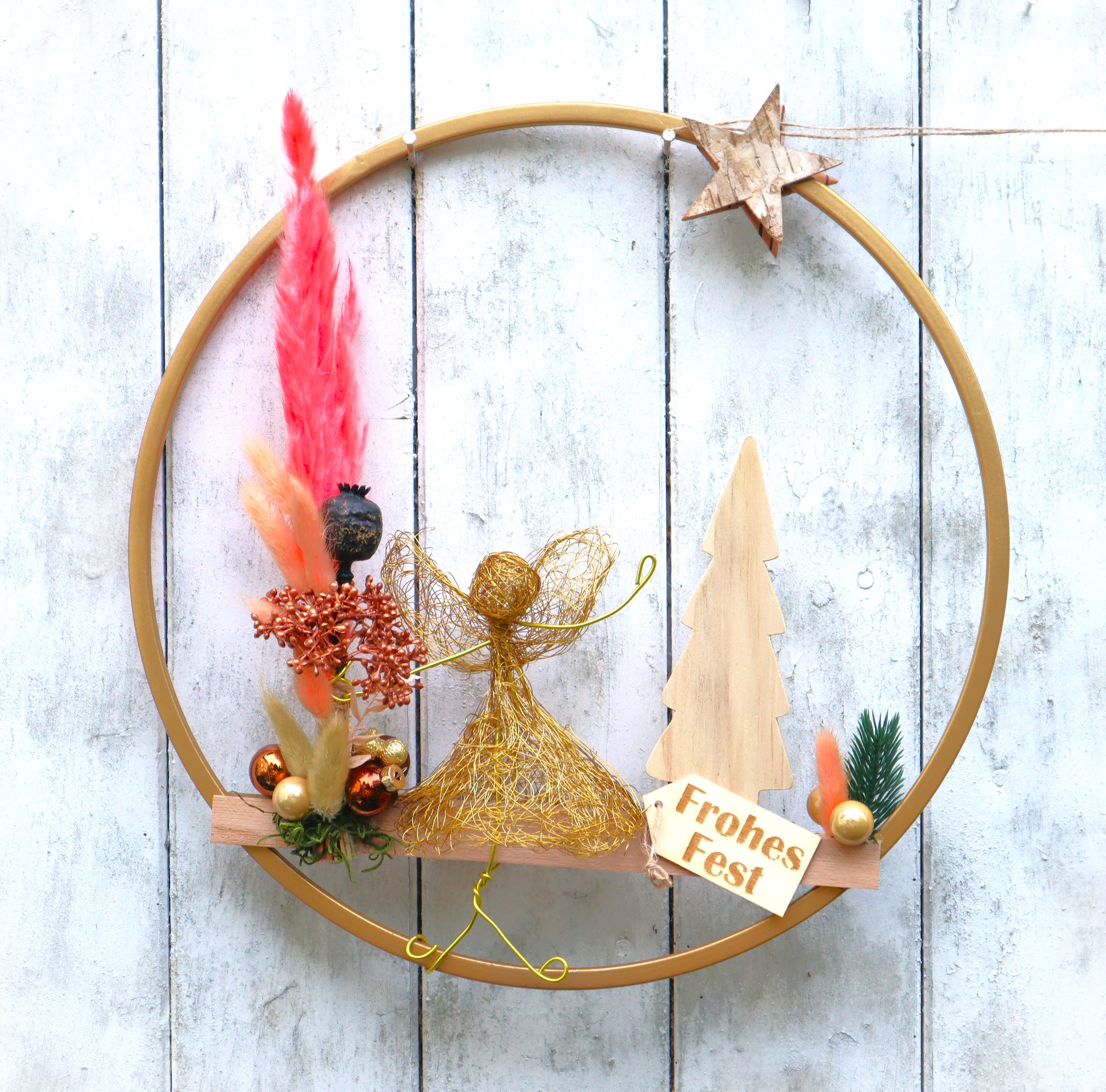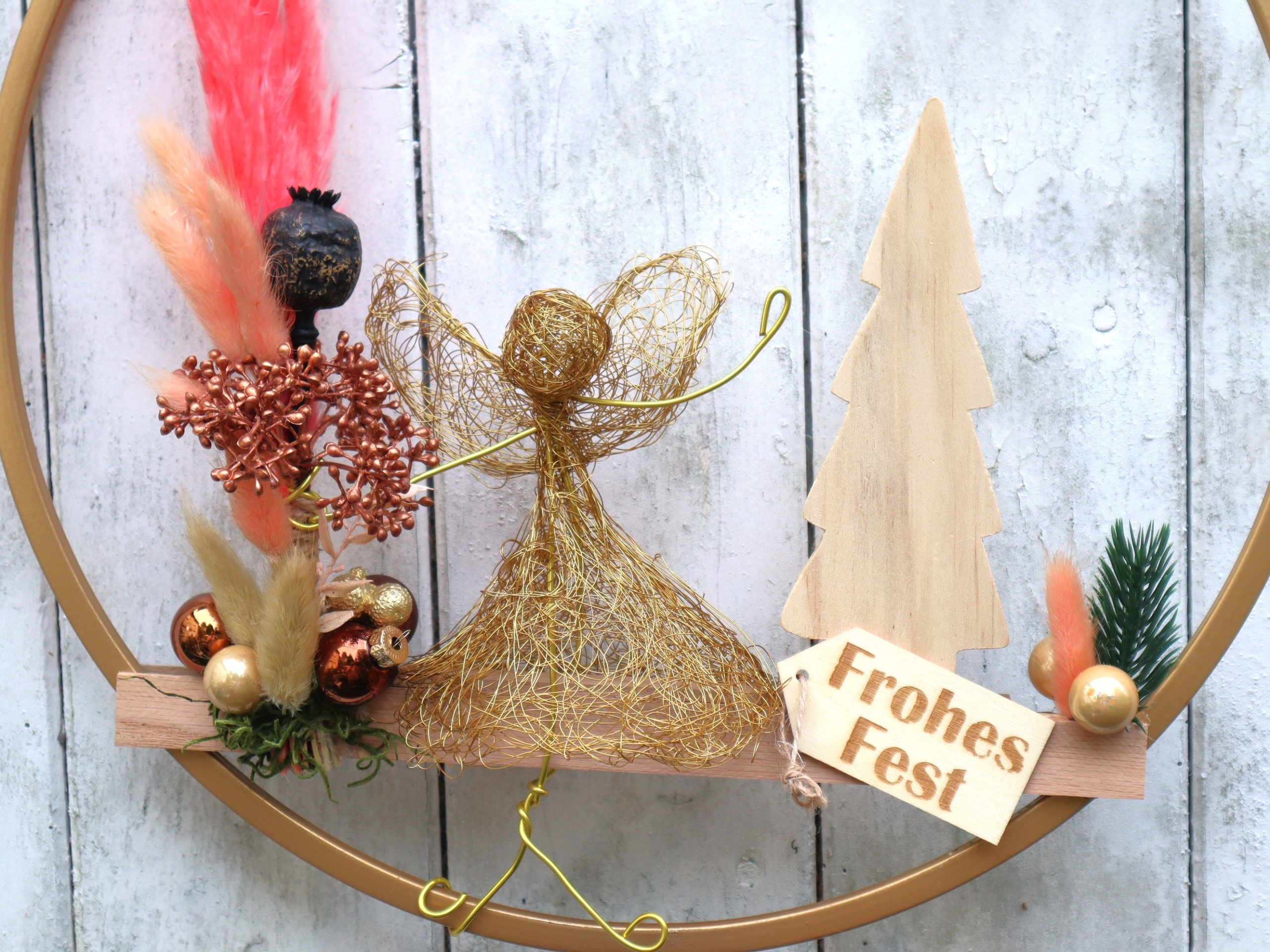 Moderner, schicker Türkranz für Weihnachten und die Adventszeit . Der große,breite Metallring wurde mit verschiedenen natürlichen Materialien dekoriert und in die Mitte wurde ein süßer handgefertigter Drahtengel eingearbeitet.