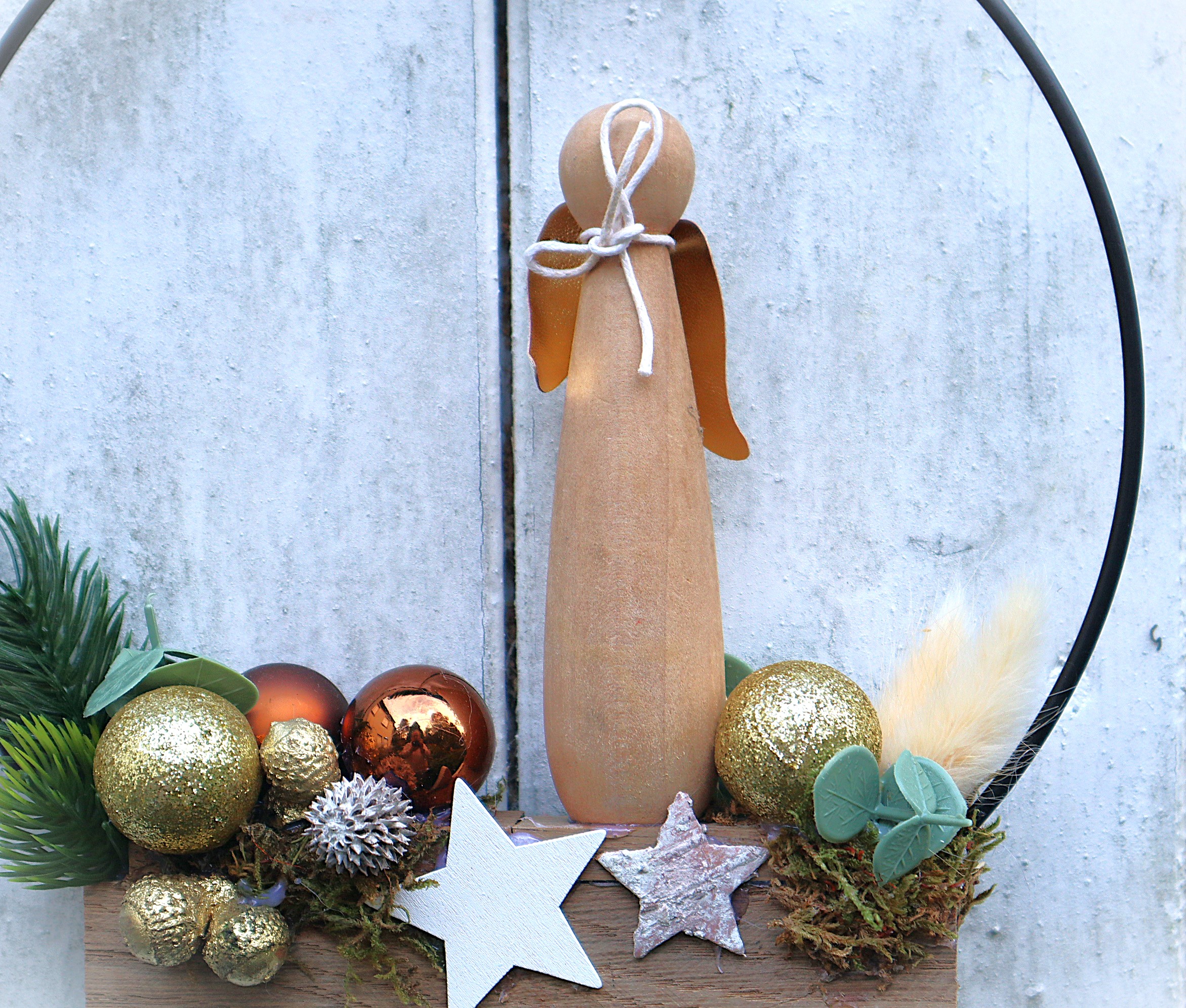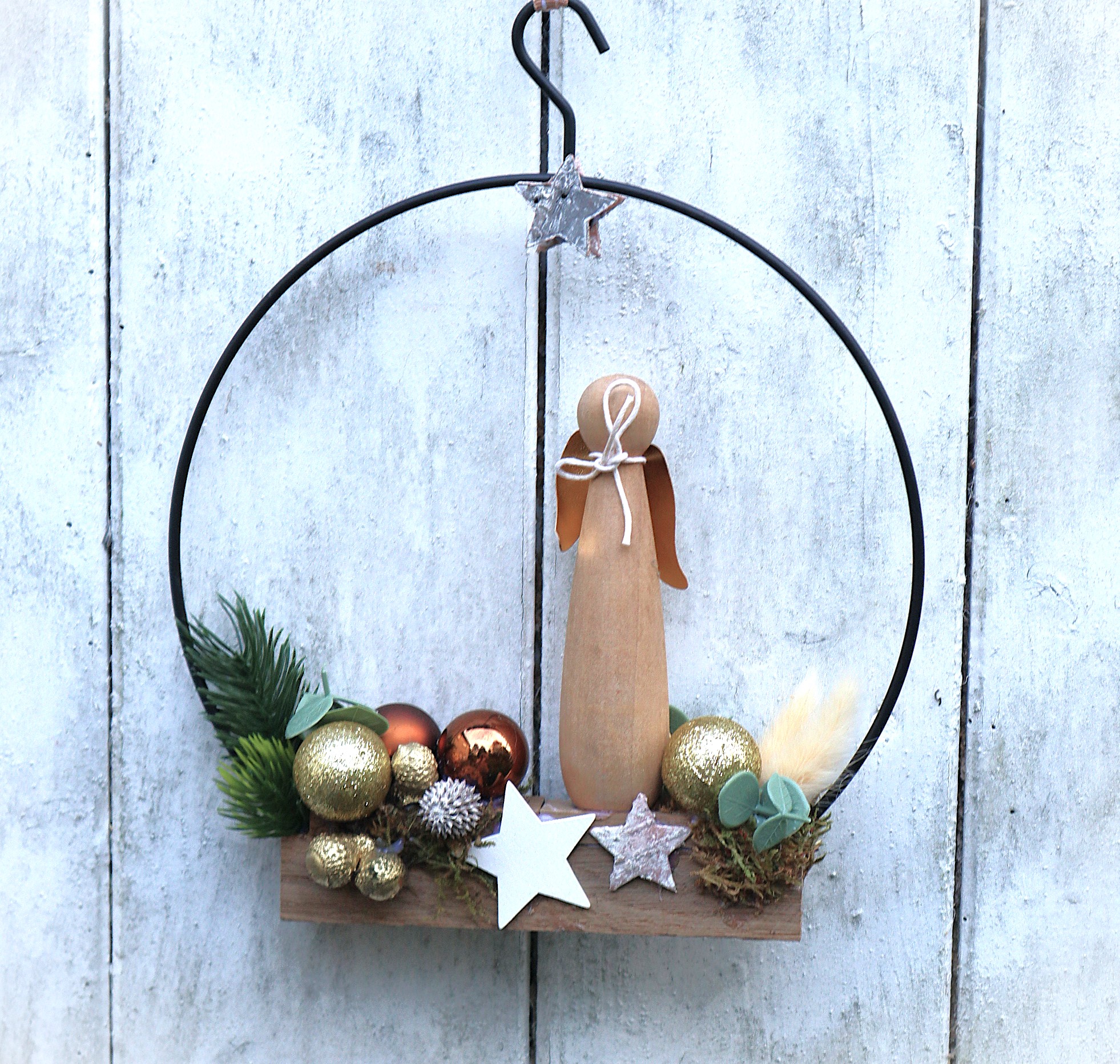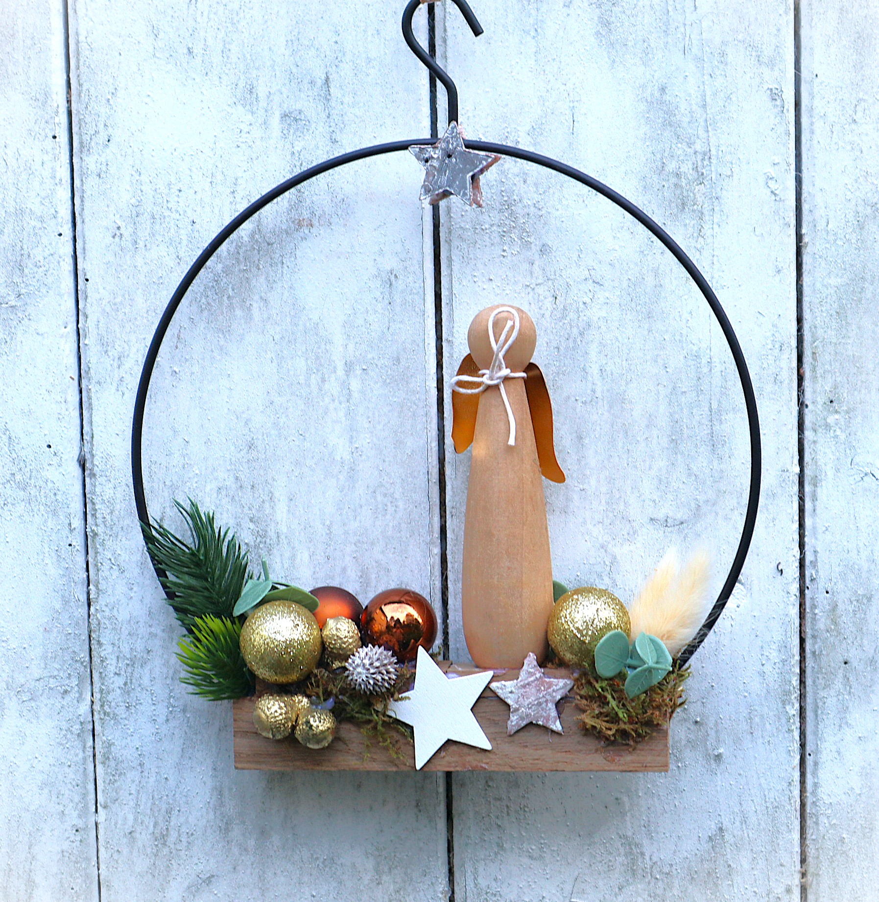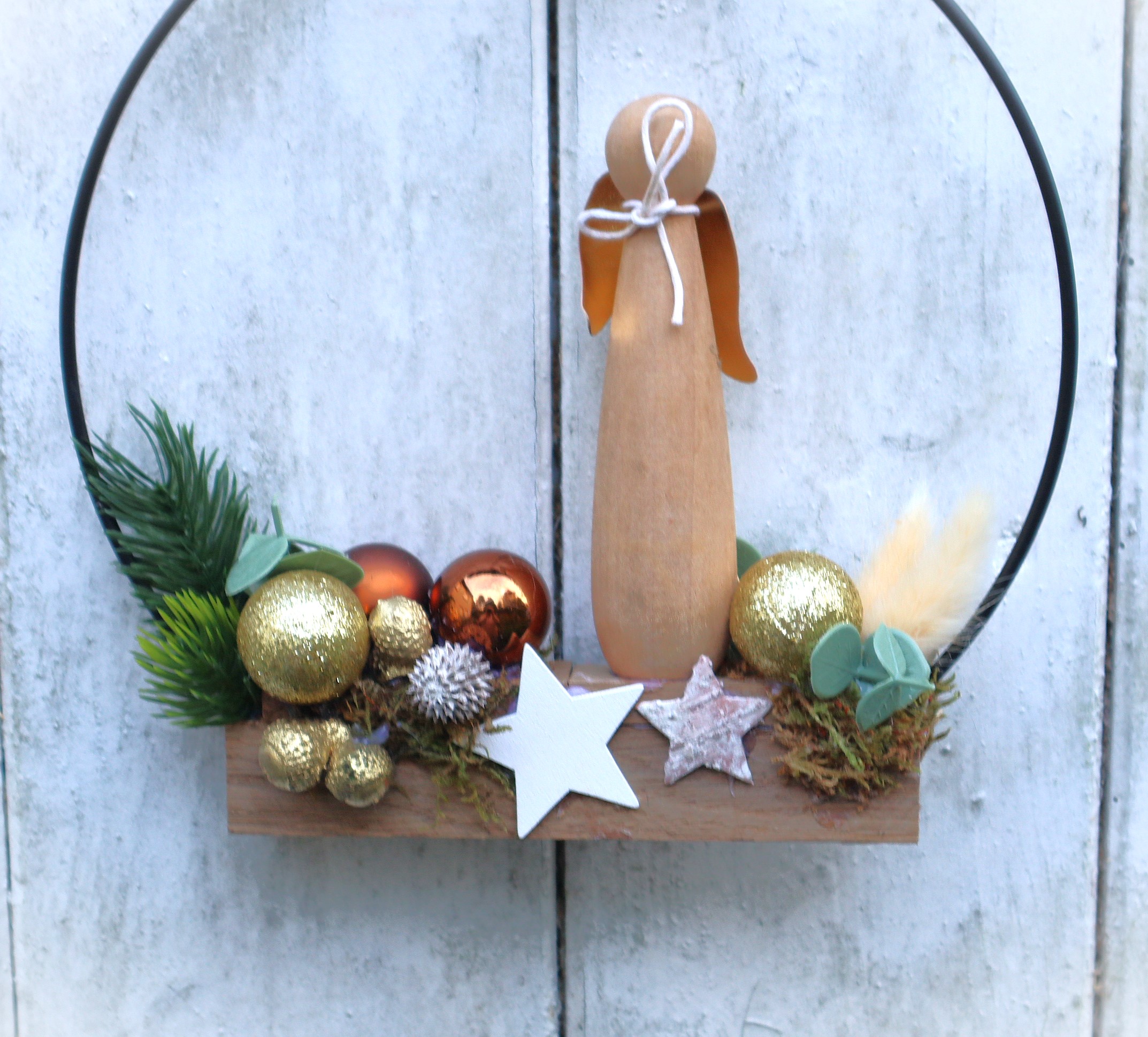 Moderner, süßer Türkranz für Weihnachten und die Adventszeit . Der Metallring wurde mit einem süßen Holzengel und weiteren Dekorationen verziert.