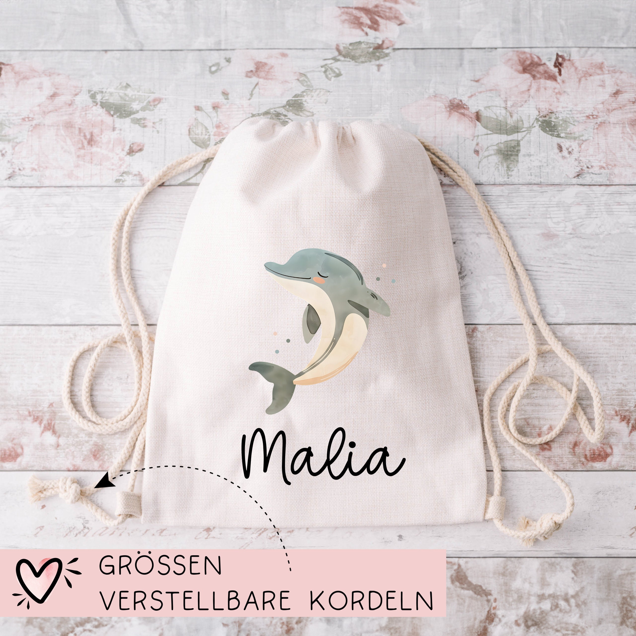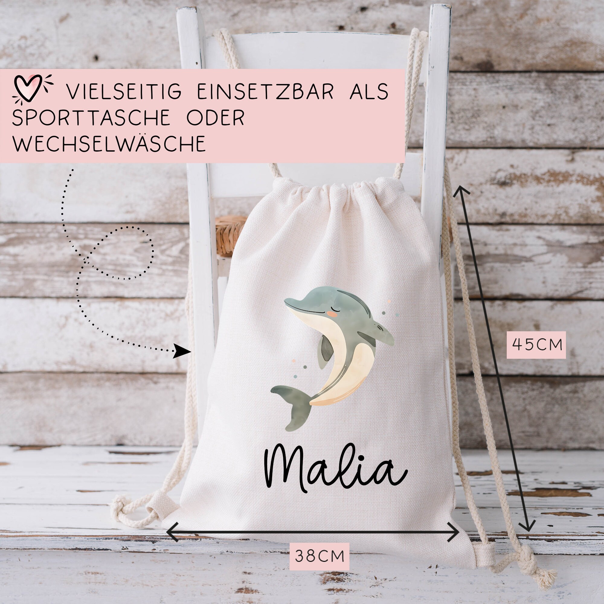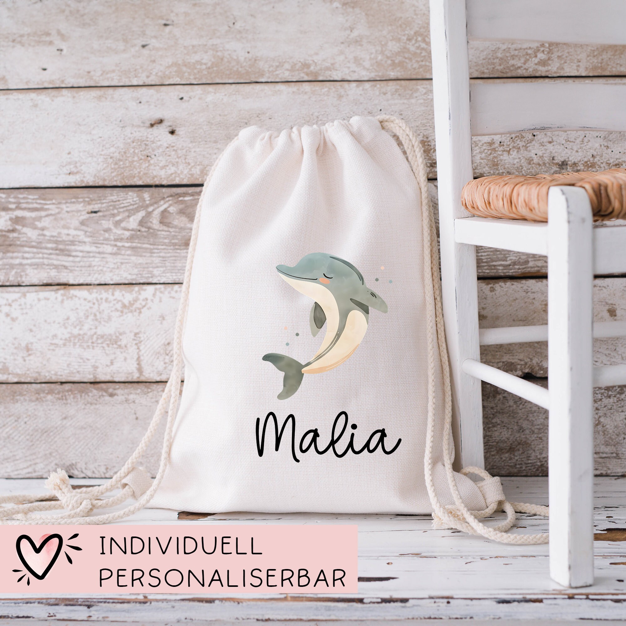 Turnbeutel Delfin Delphin mit Namen personalisiert Personalisierter Turnbeutel | Rucksack als Sportbeutel für Schule, Kindergarten, Wäsche