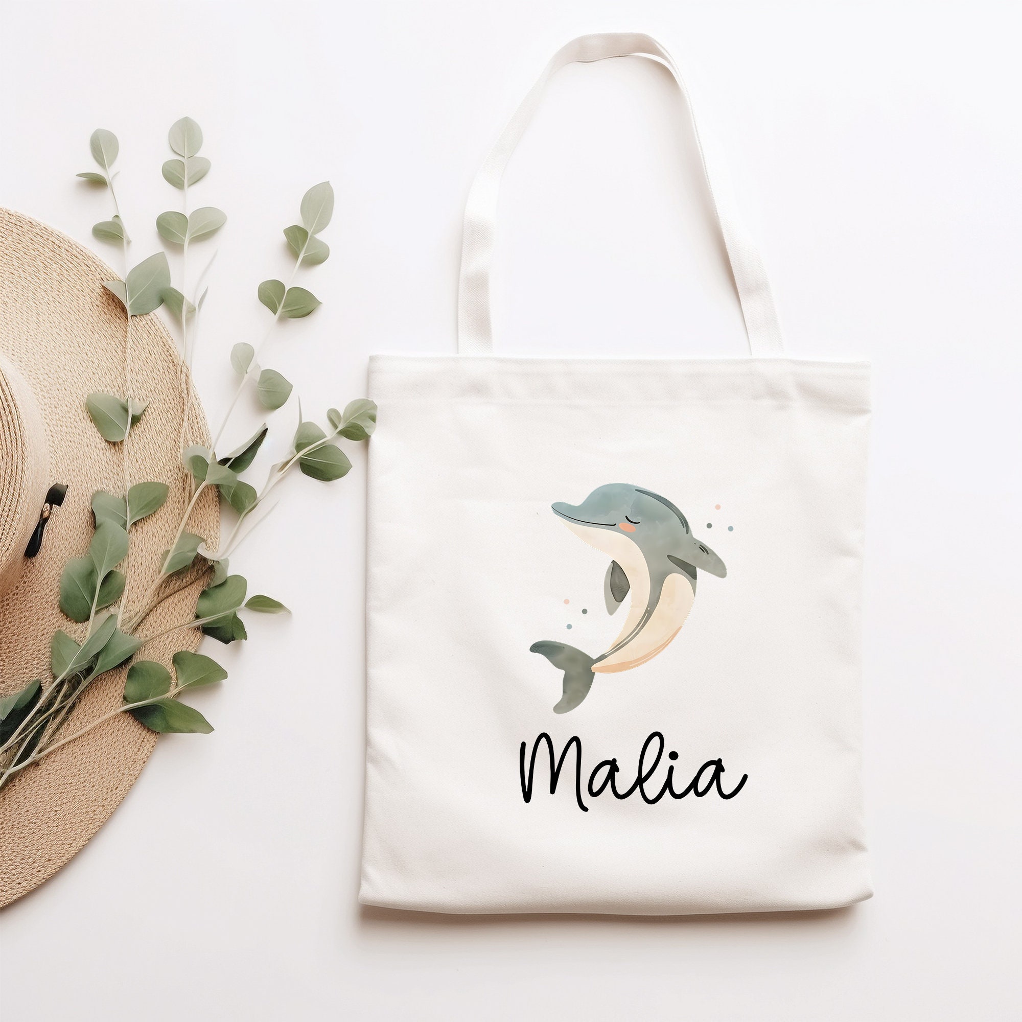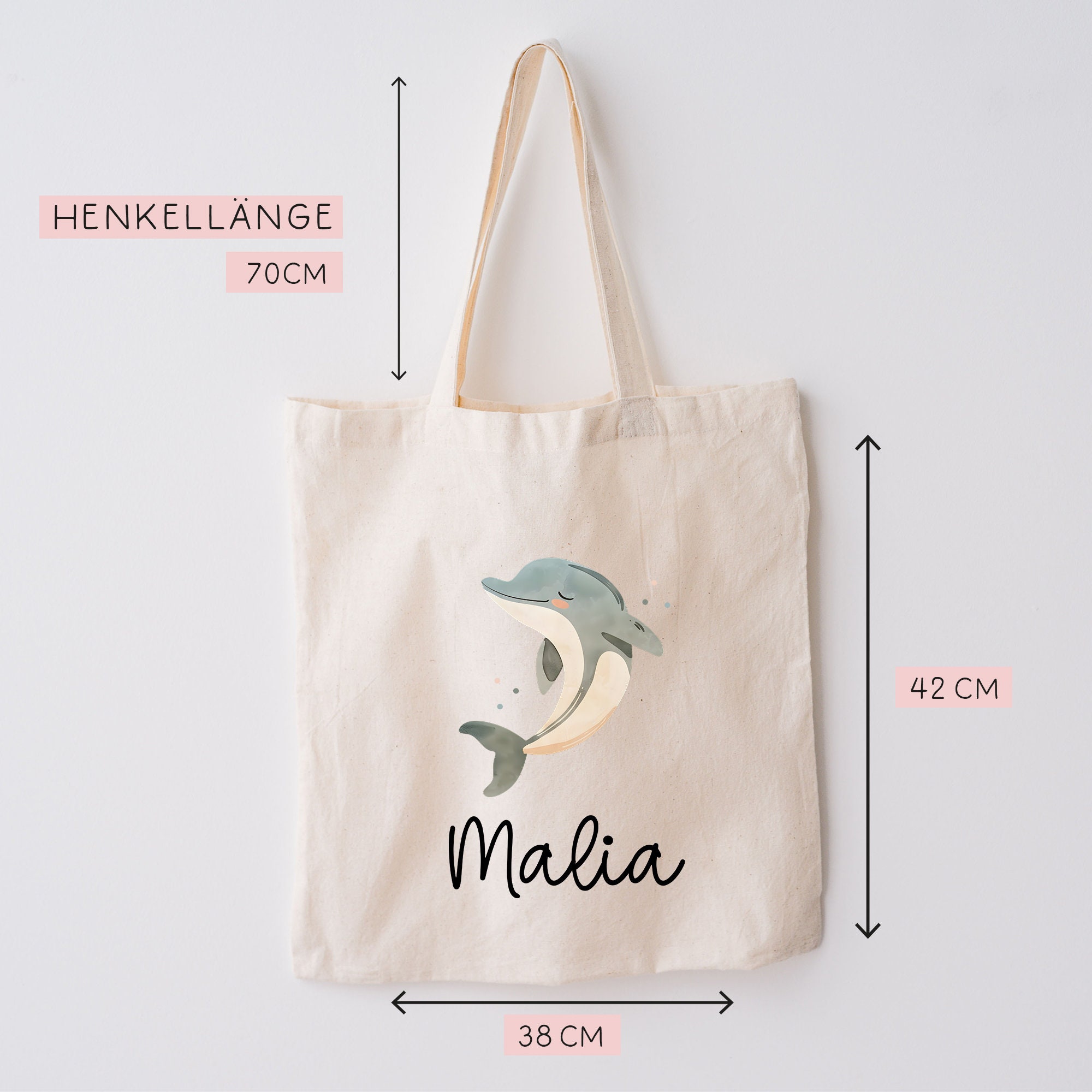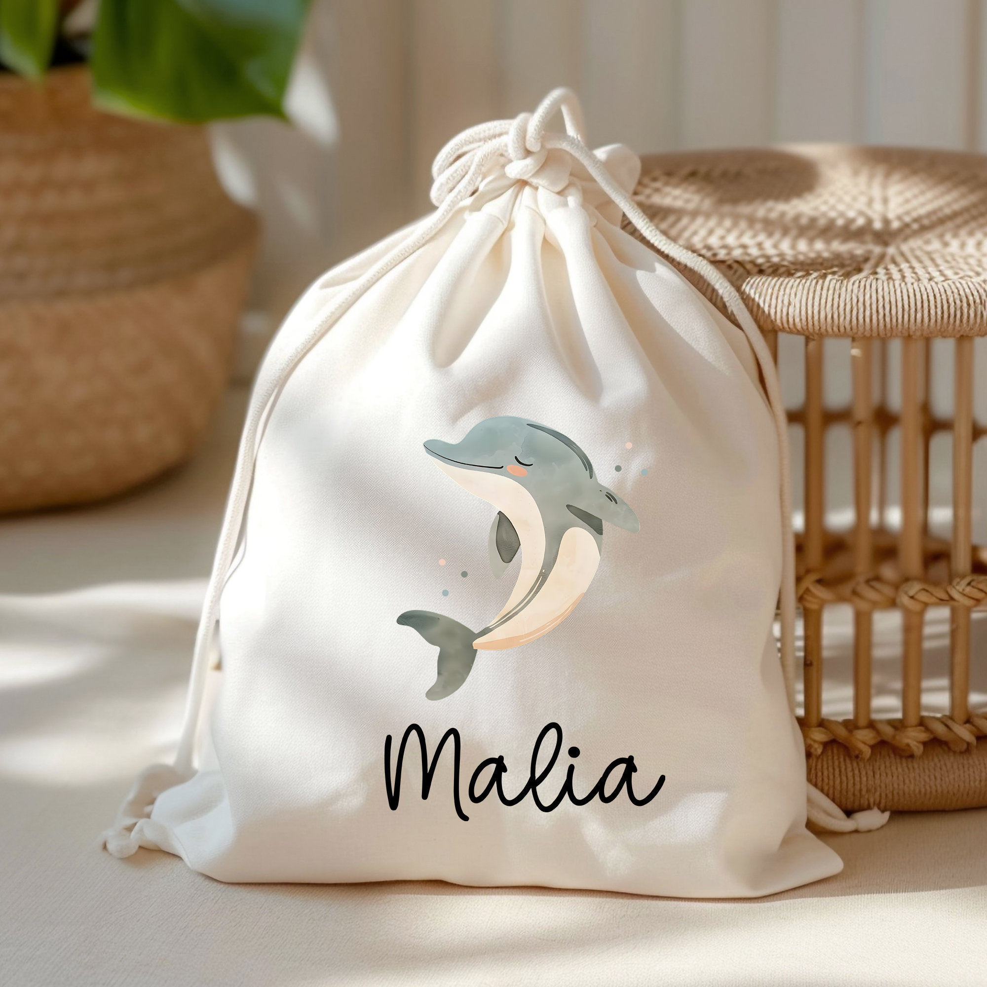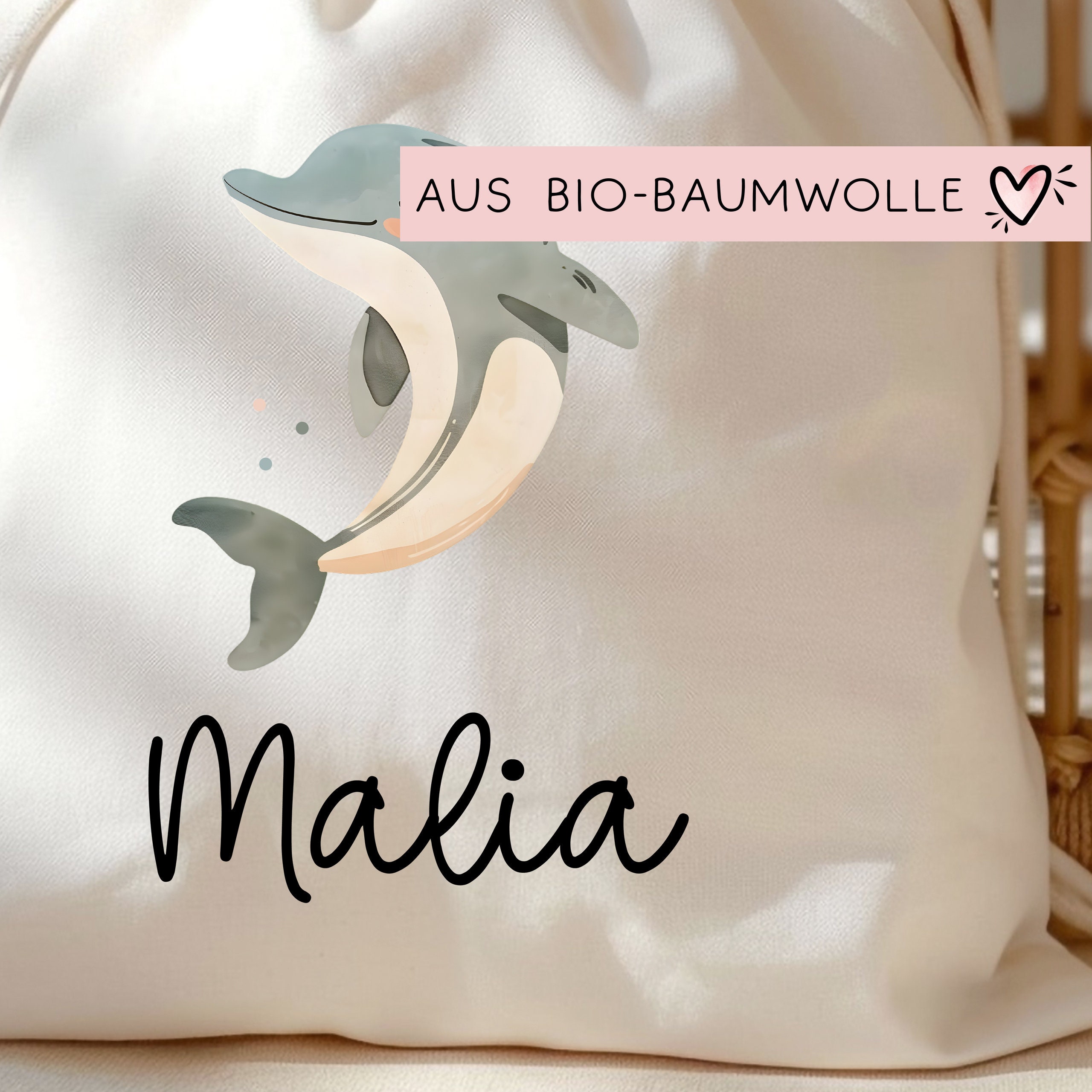 Der personalisierte Turnbeutel für Kinder ist vielseitig einsetzbar, besteht aus robuster Bio-Baumwolle und ist ein treuer Begleiter für unsere Kleinen. Er ist mit einem süßen Delfin oder Delphin und dem Namen des Kindes bedruckt.