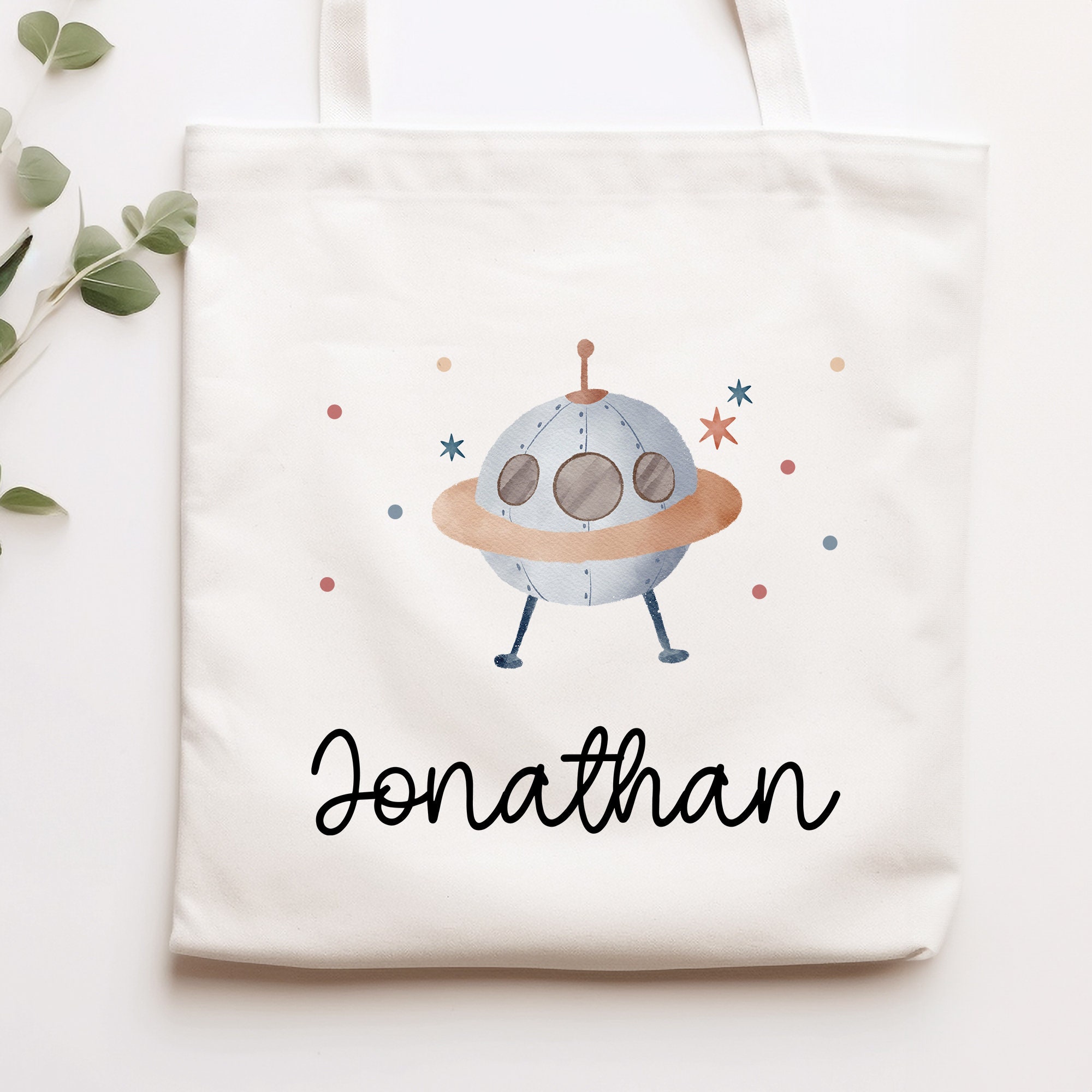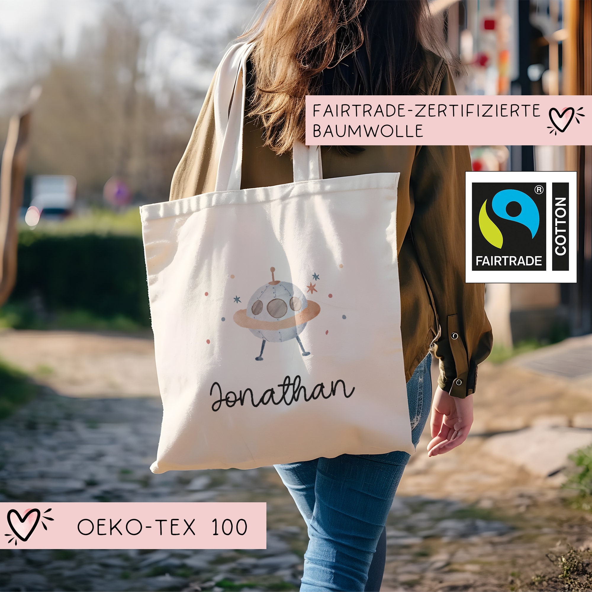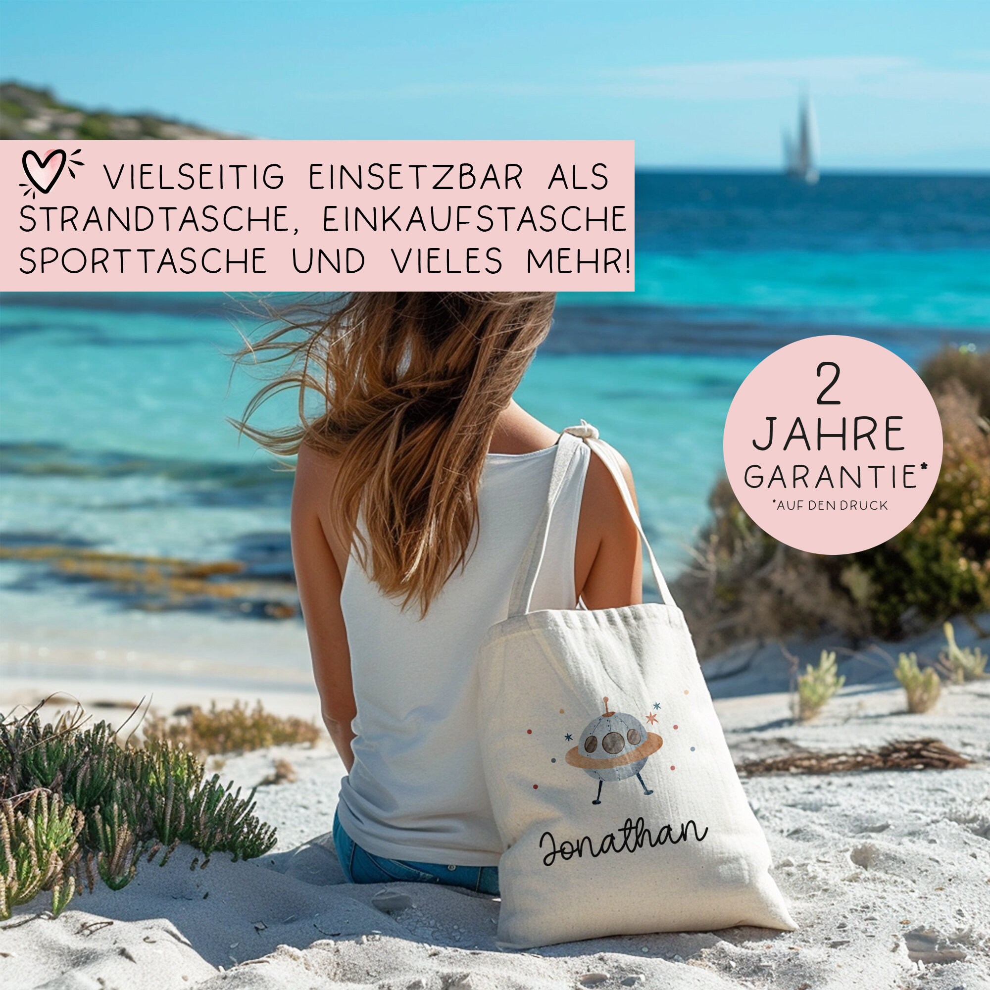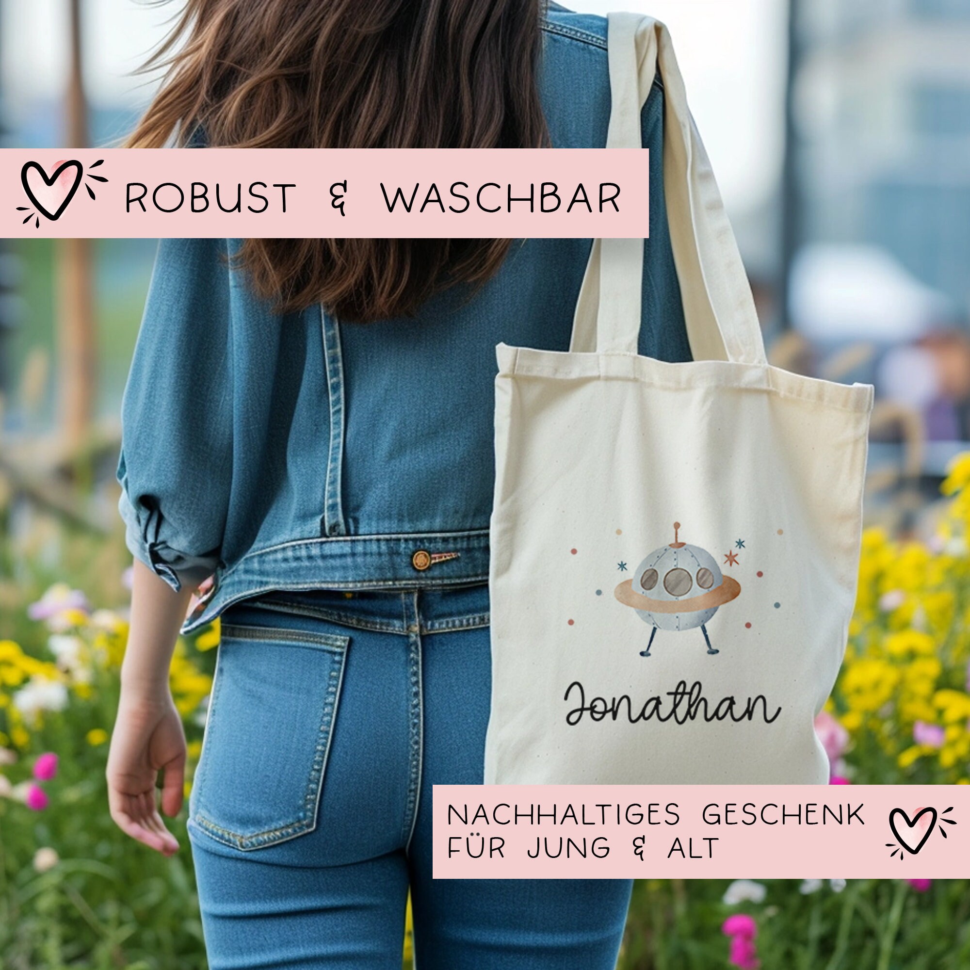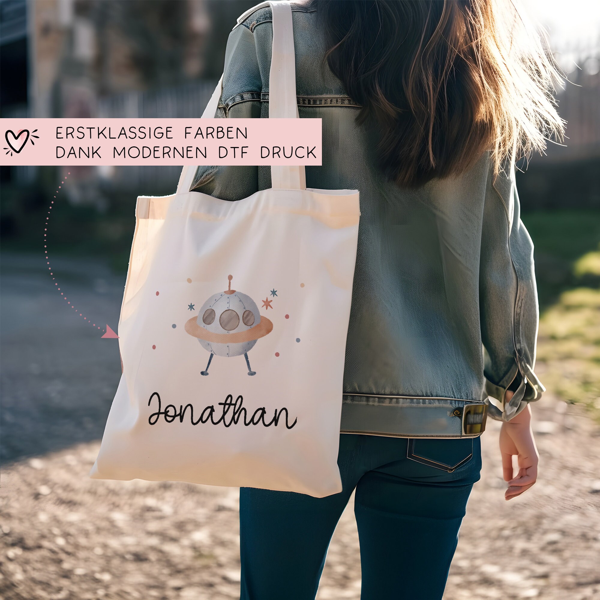Mit der personalisierten Stofftasche, die als Einkaufstasche oder Kinder-Beutel dient, wird der Alltag in Kita, Schule und Kindergarten zum Vergnügen. Diese vielseitige Tragetasche kann auch als Sporttasche für Wechselwäsche genutzt werden. Ein Ufo auf der Tasche macht sie besonders attraktiv für kleine Abenteurer. Der Name des Kindes sorgt dafür, dass die Tasche immer wieder sicher zu ihrem Besitzer zurückfindet. Ob für den Einkauf oder als treuer Begleiter im Alltag – diese Stofftasche ist praktisch und individuell. Perfekt für Kinder, die ihre Sachen stilvoll und ordentlich transportieren möchten. Ideal für Schule und Kita!