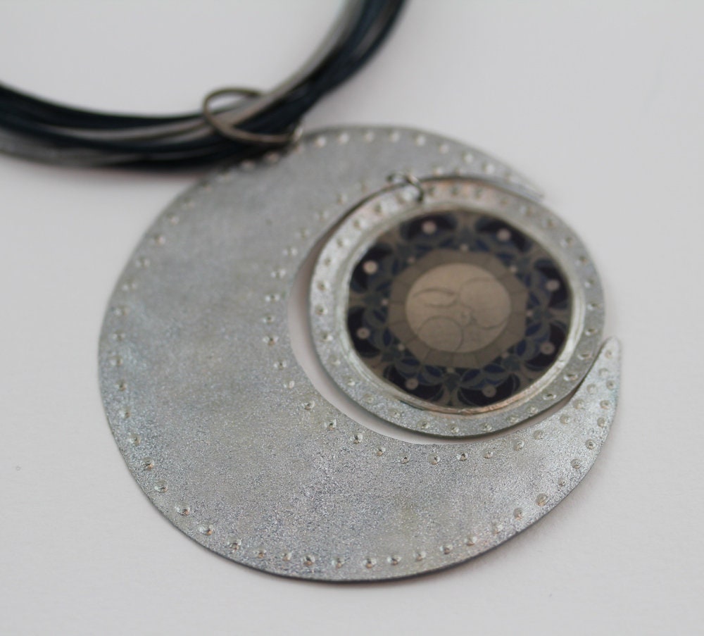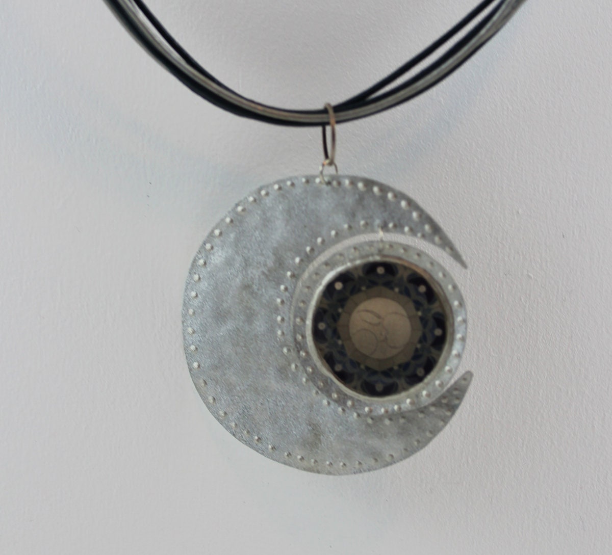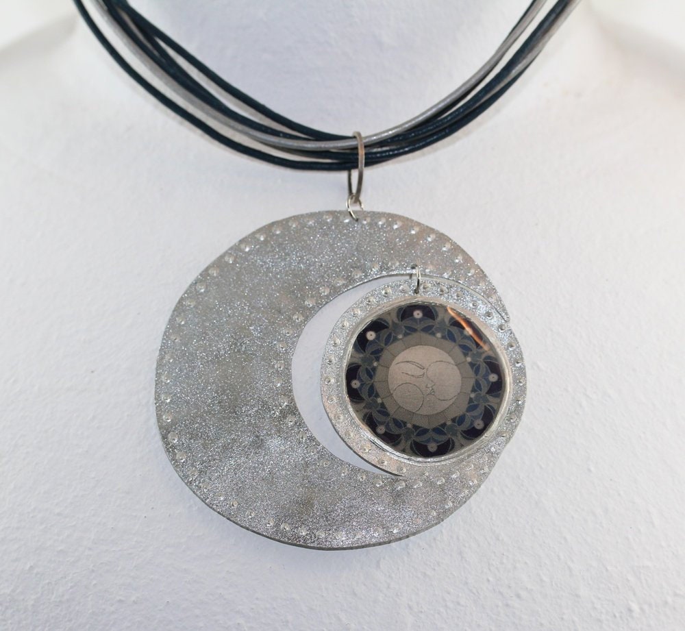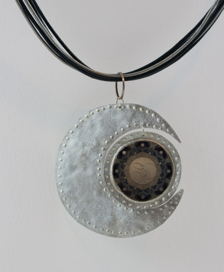 Ein einzigartiges Schmuckstück mit dem schönen Mond Mandala Motiv "Lunasacrada" auf einer beweglichen Scheibe in einer dekorativen Mondsichel an einer edlen Kette aus blauen und silbernen Lederschnüren.