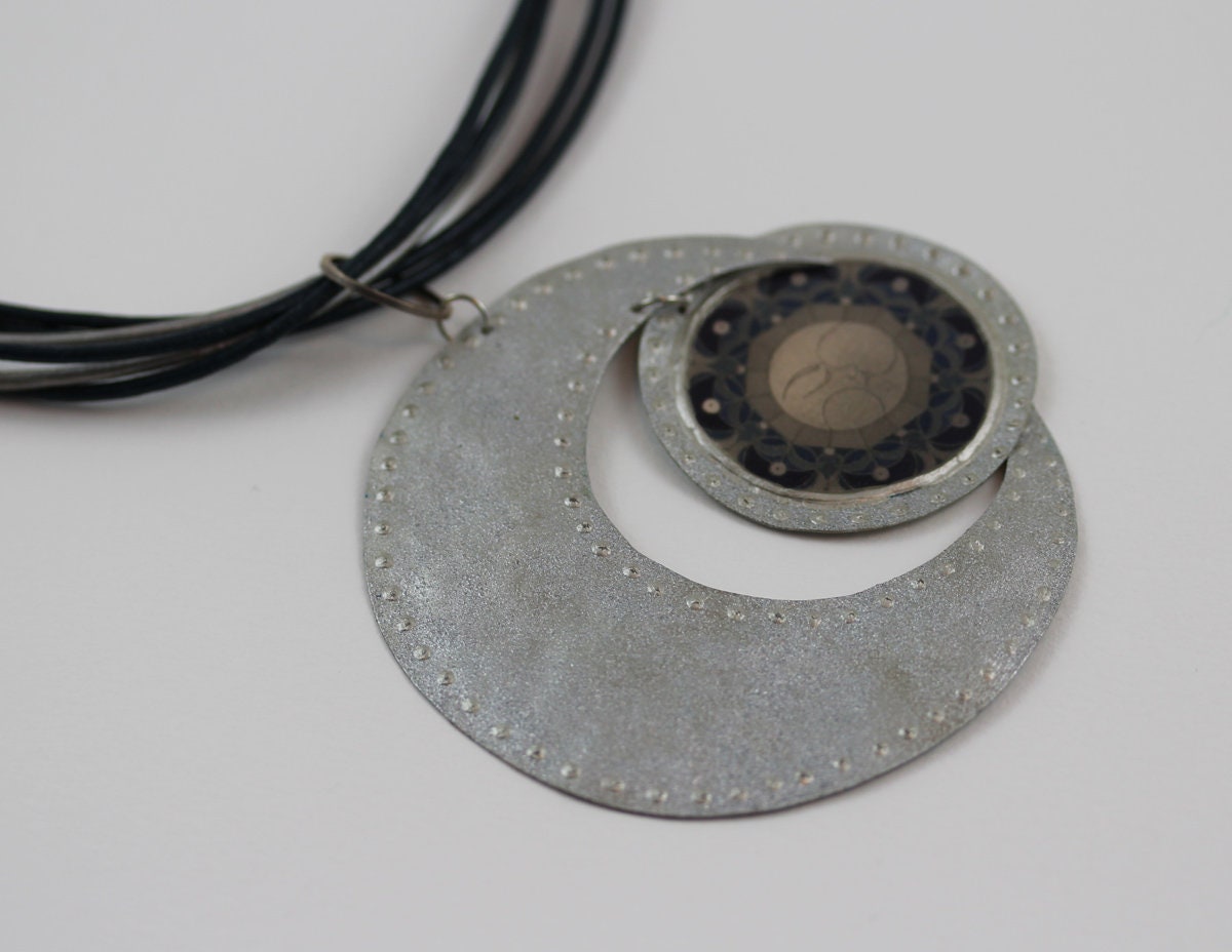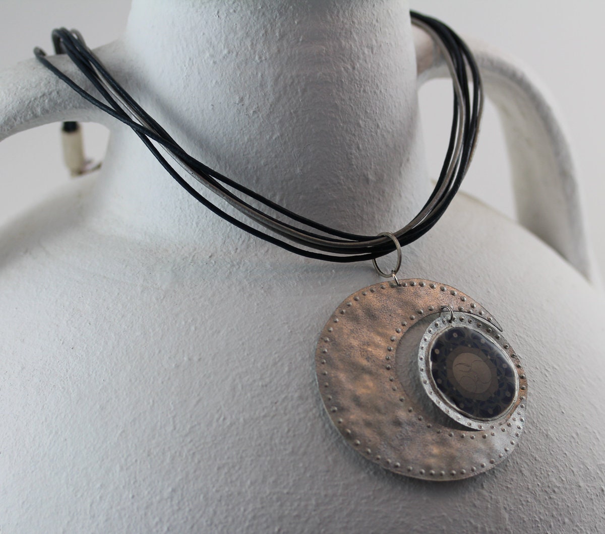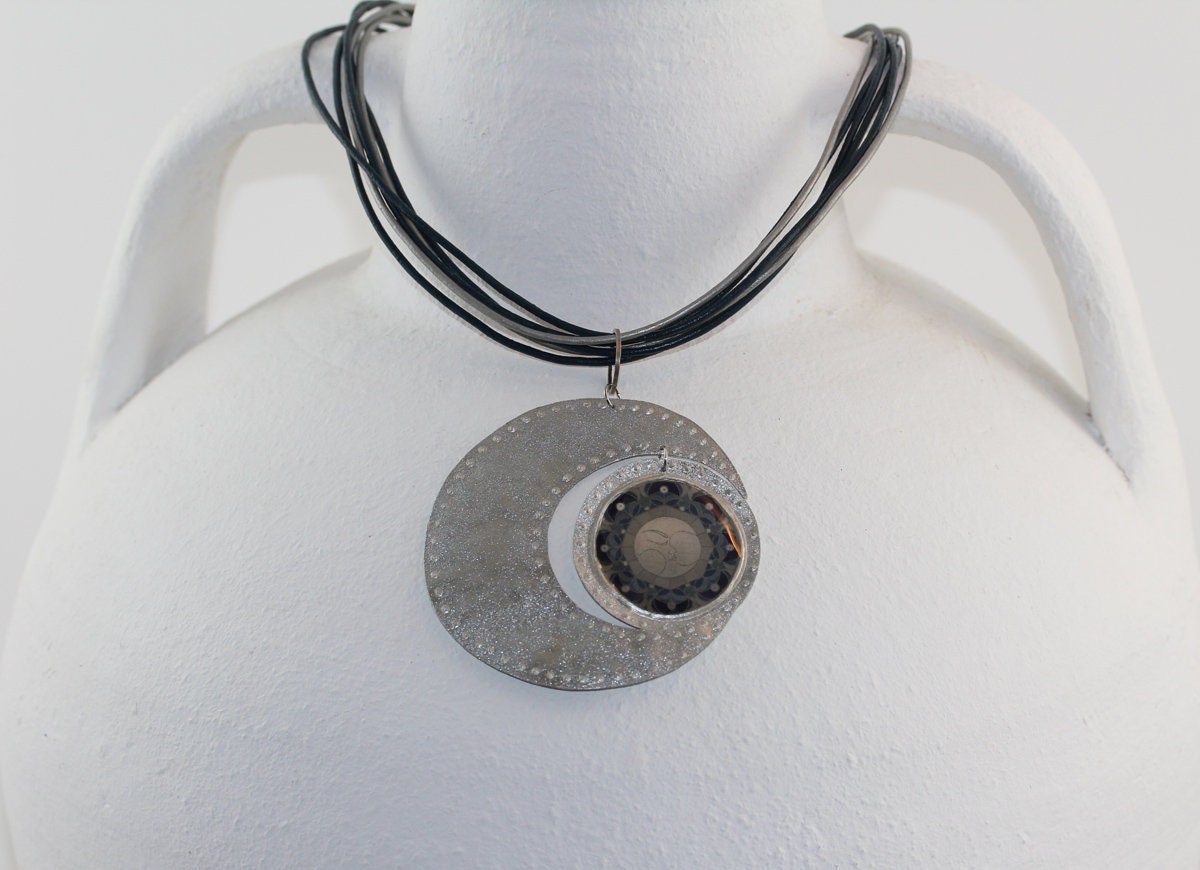 Der Anhänger ist handgearbeitet aus silbern legiertem Metall, patiniert in Stardust Optik, und das in 3D Technik dekorierte Motiv ist in schützendes Kunstharz eingegossen. Die Kordelkette ist aus blauen und silberfarbenen Lederschnüren gearbeitet. Der Anhänger misst insgesamt im Durchmesser 8 cm, die kleinere Scheibe mit dem Motiv hat einen Durchmesser von 4 cm, die Kordelkette hat eine Länge von 54 cm.