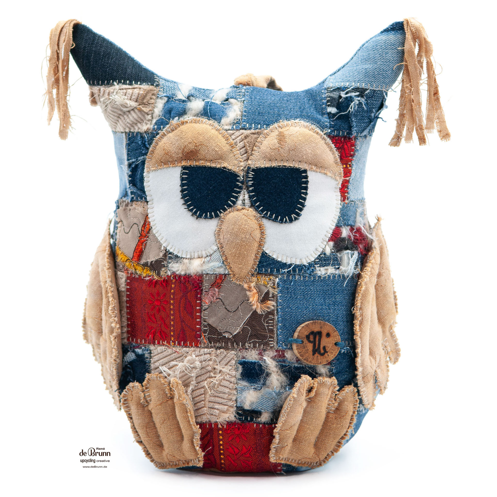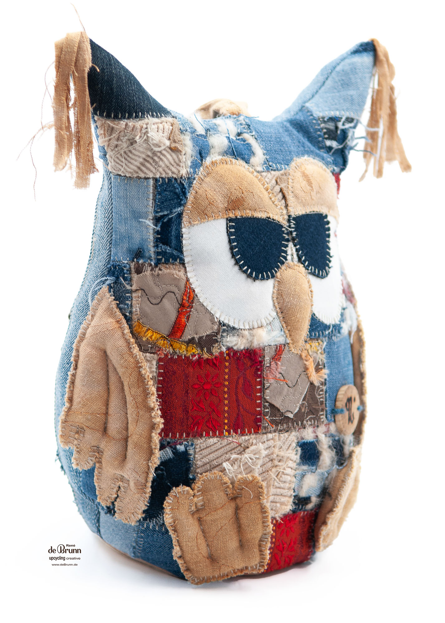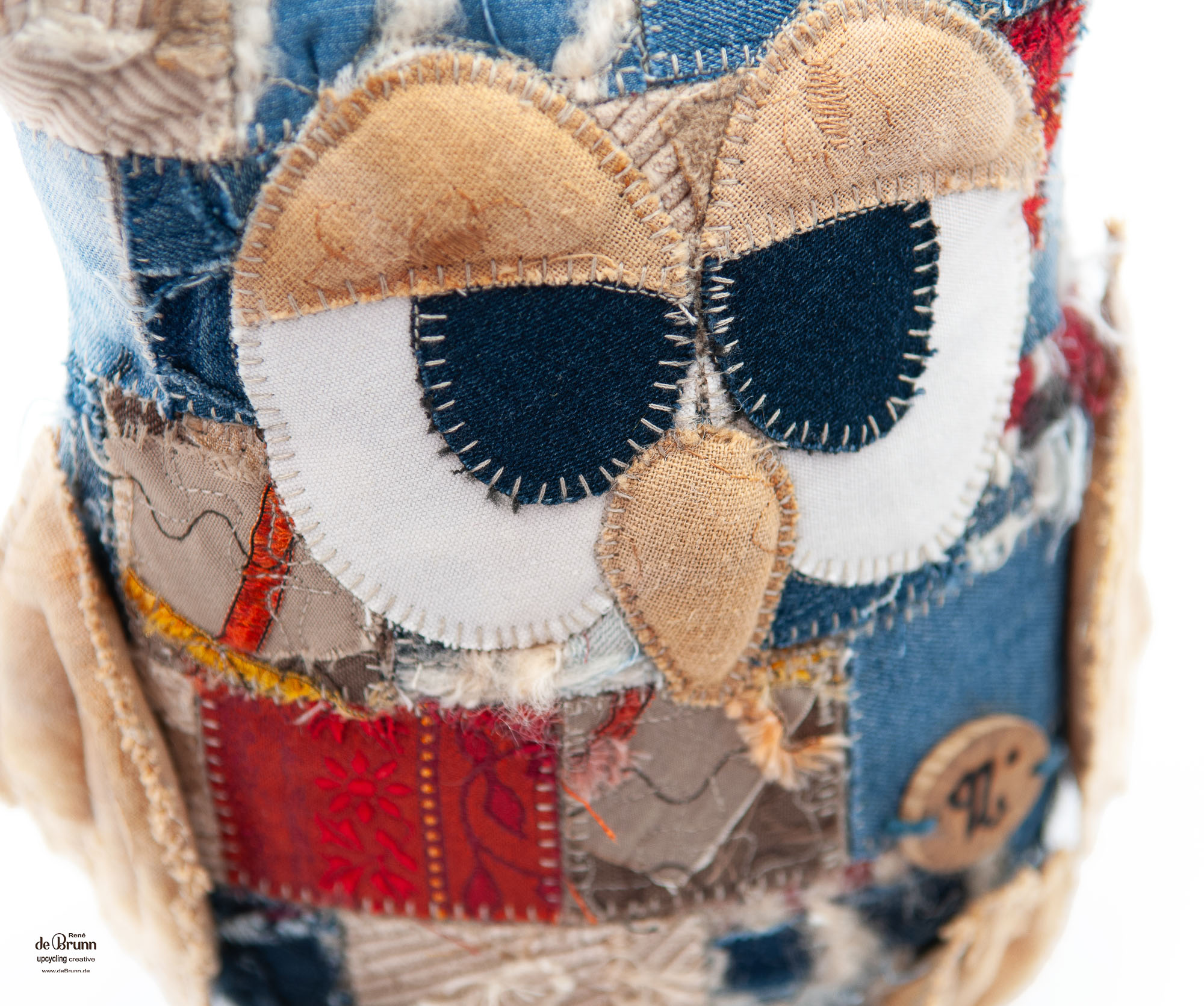 Mit der lustigen Eule verarbeite ich auch die letzten Stoffreste und -schnipsel. Sie ist mit viel Liebe und Leidenschaft aus blauen Jeans- beigen, braunen und roten Stoffresten gefertigt.