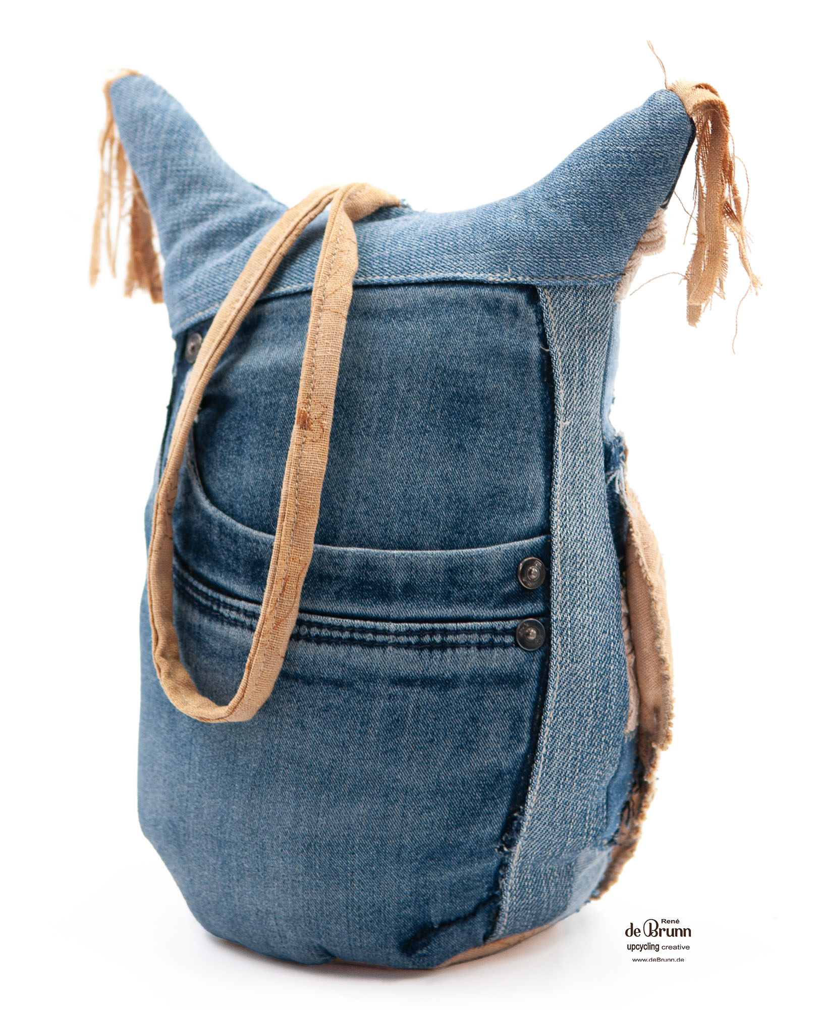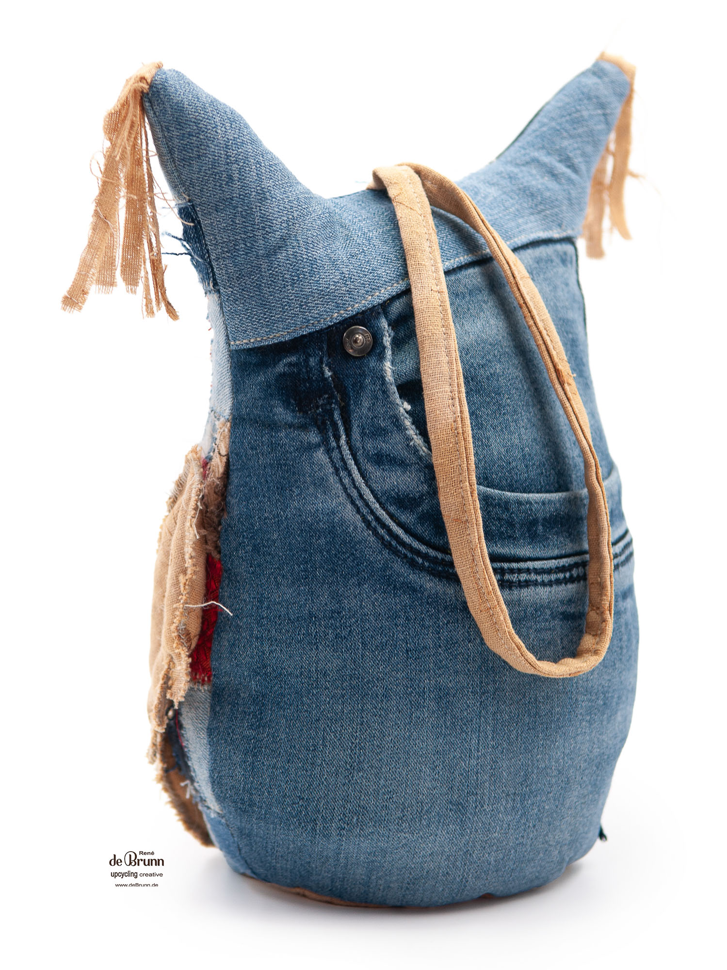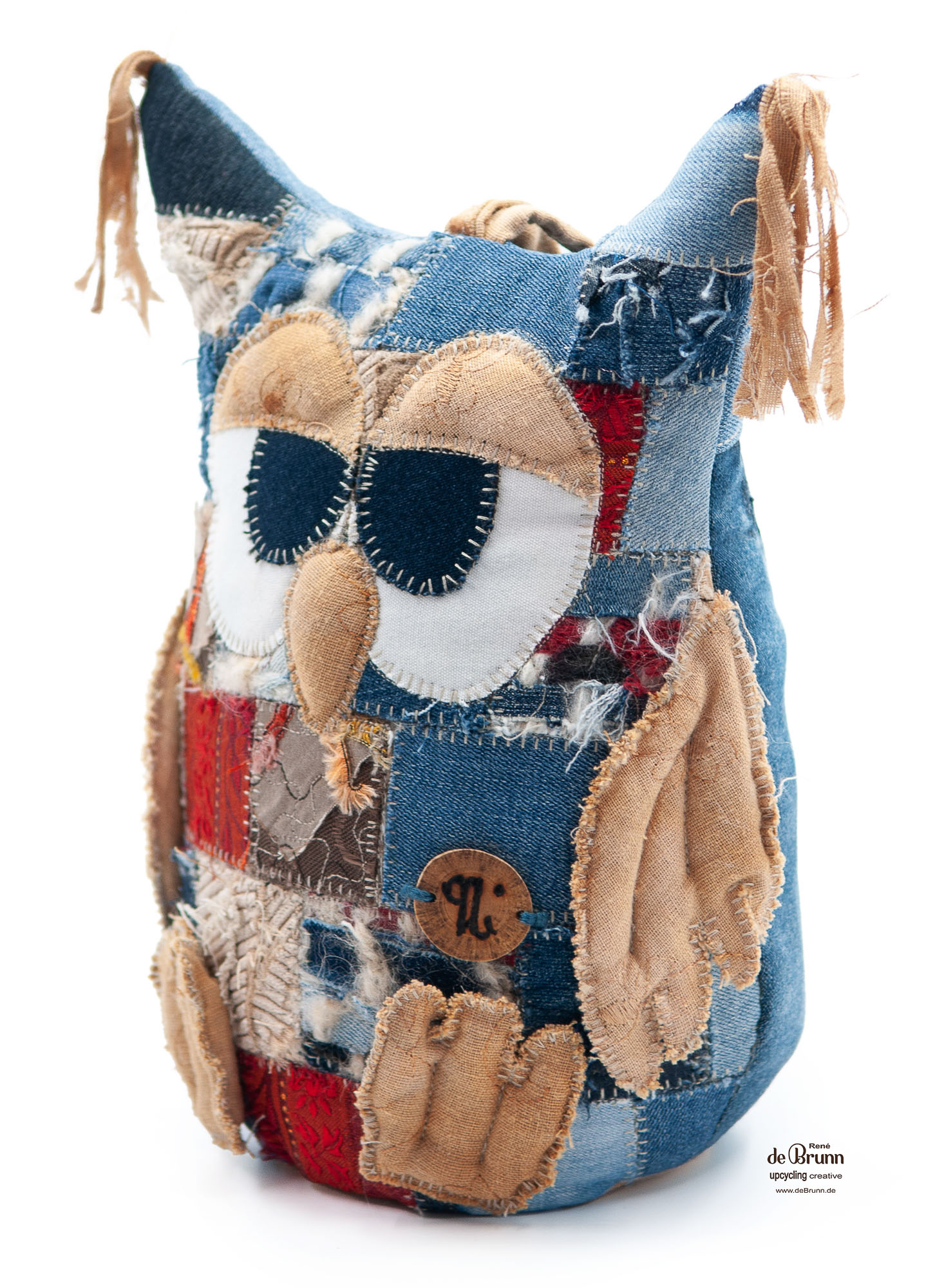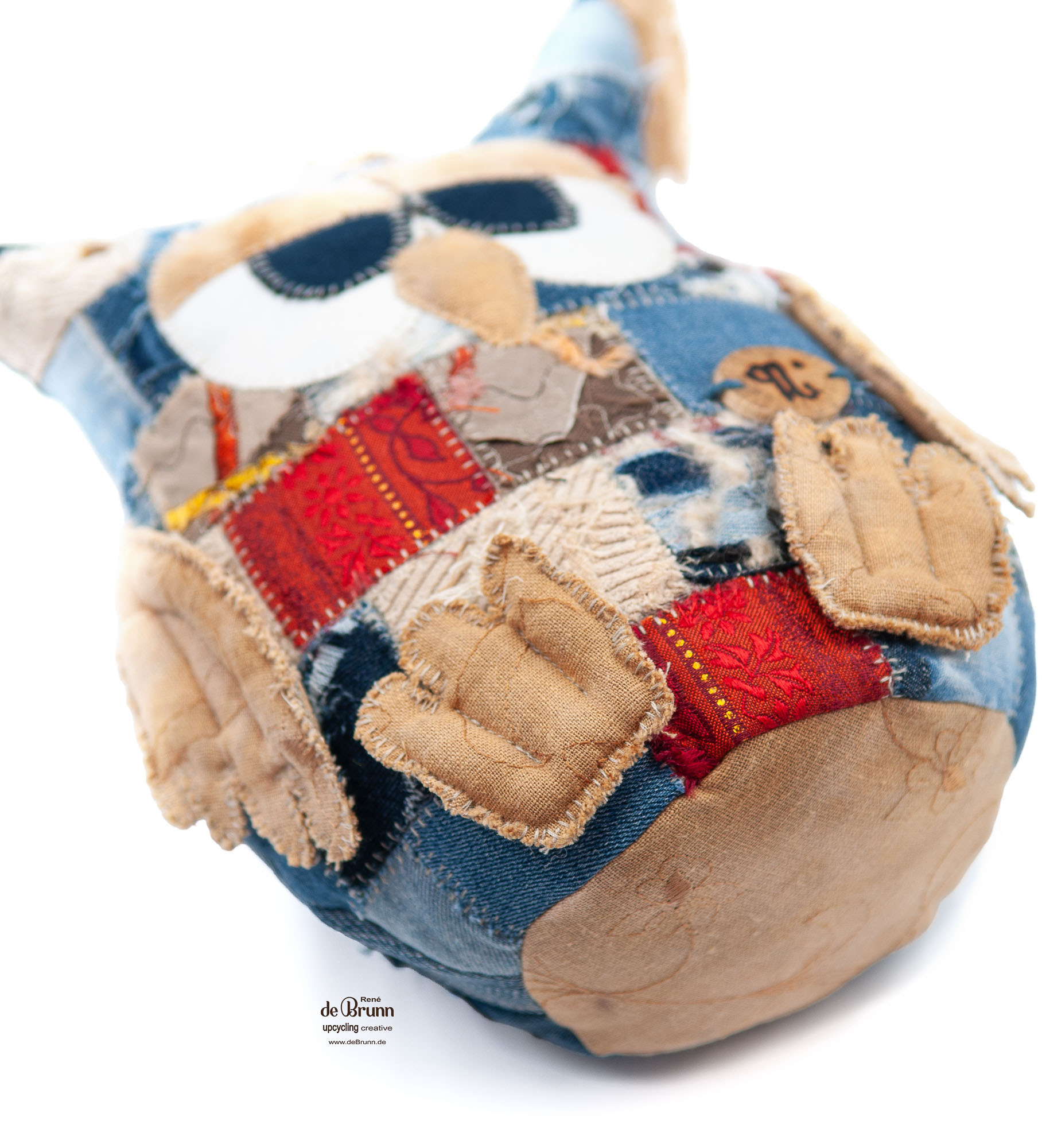 Mit der lustigen Eule verarbeite ich auch die letzten Stoffreste und -schnipsel. Sie ist mit viel Liebe und Leidenschaft aus blauen Jeans- beigen, braunen und roten Stoffresten gefertigt.
