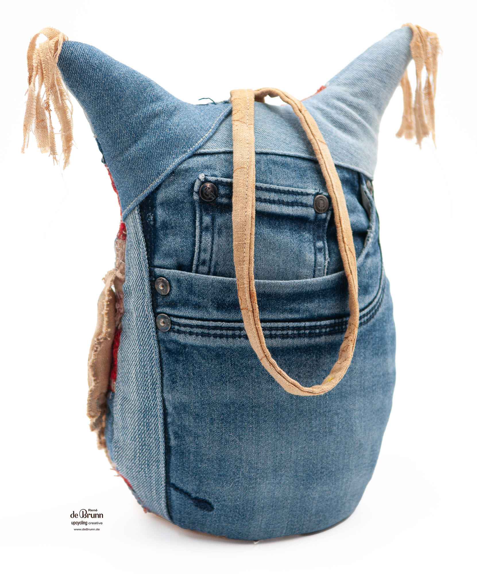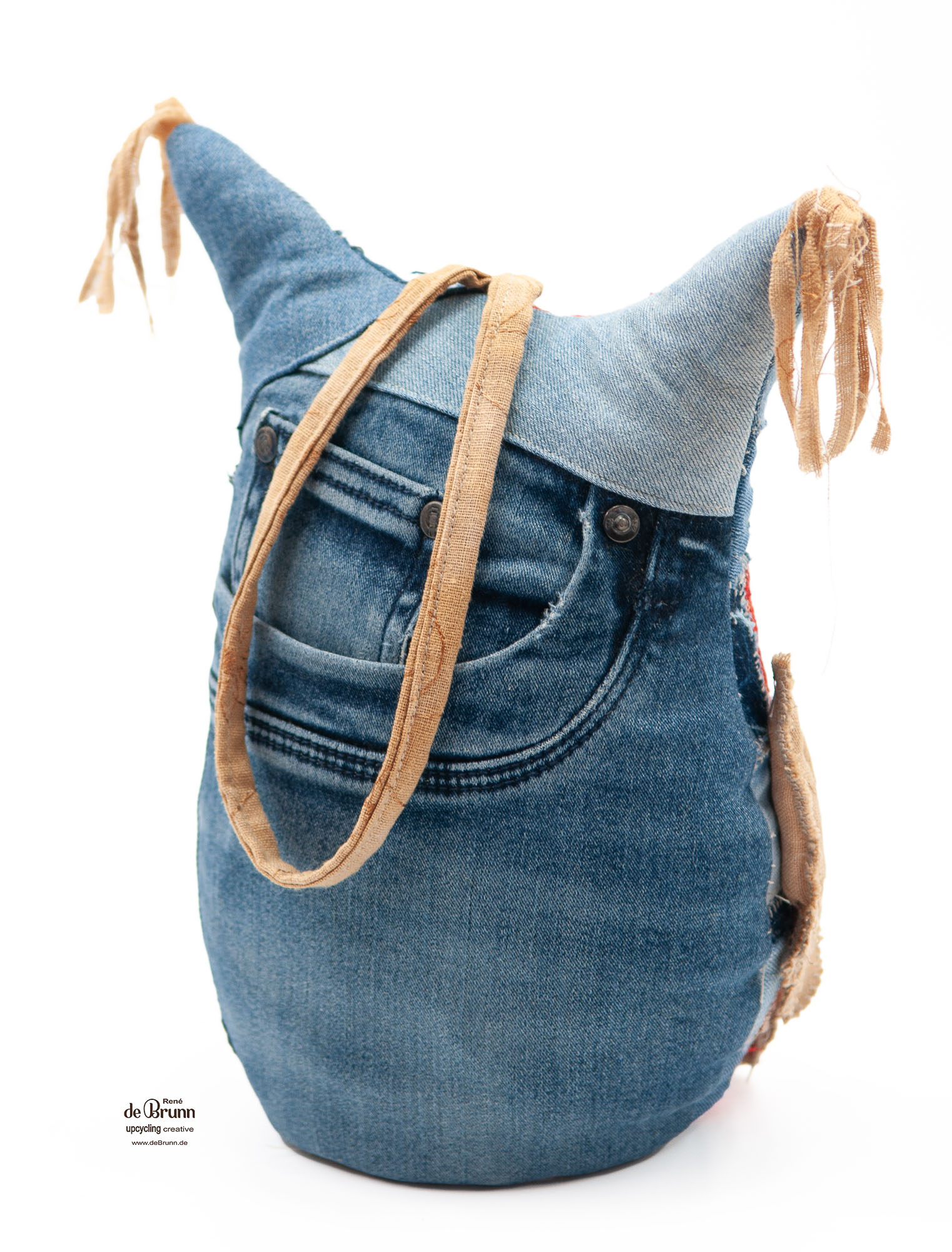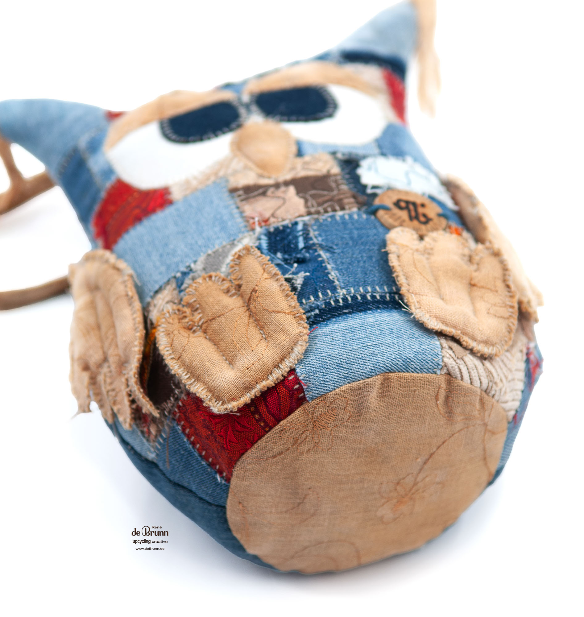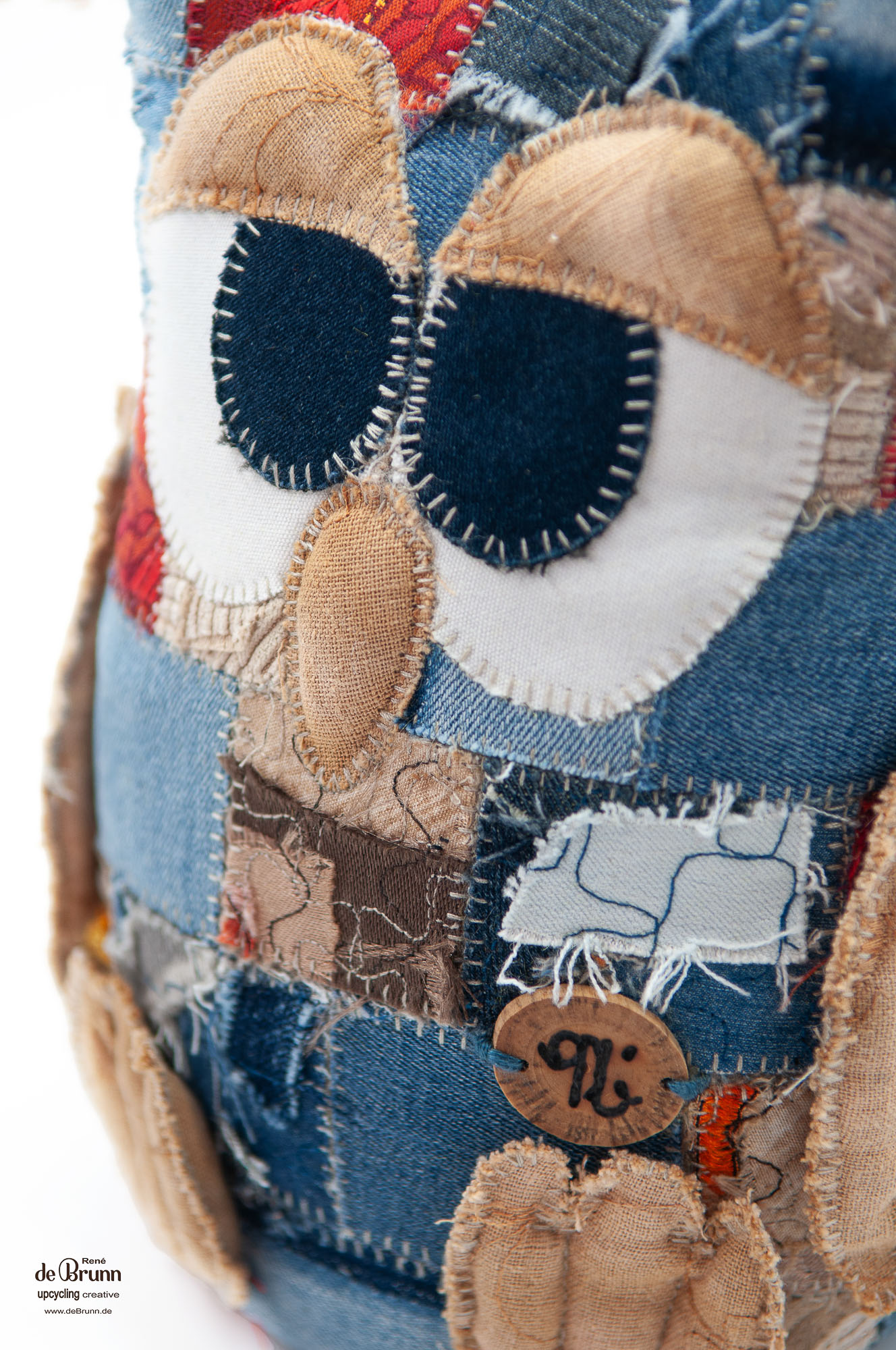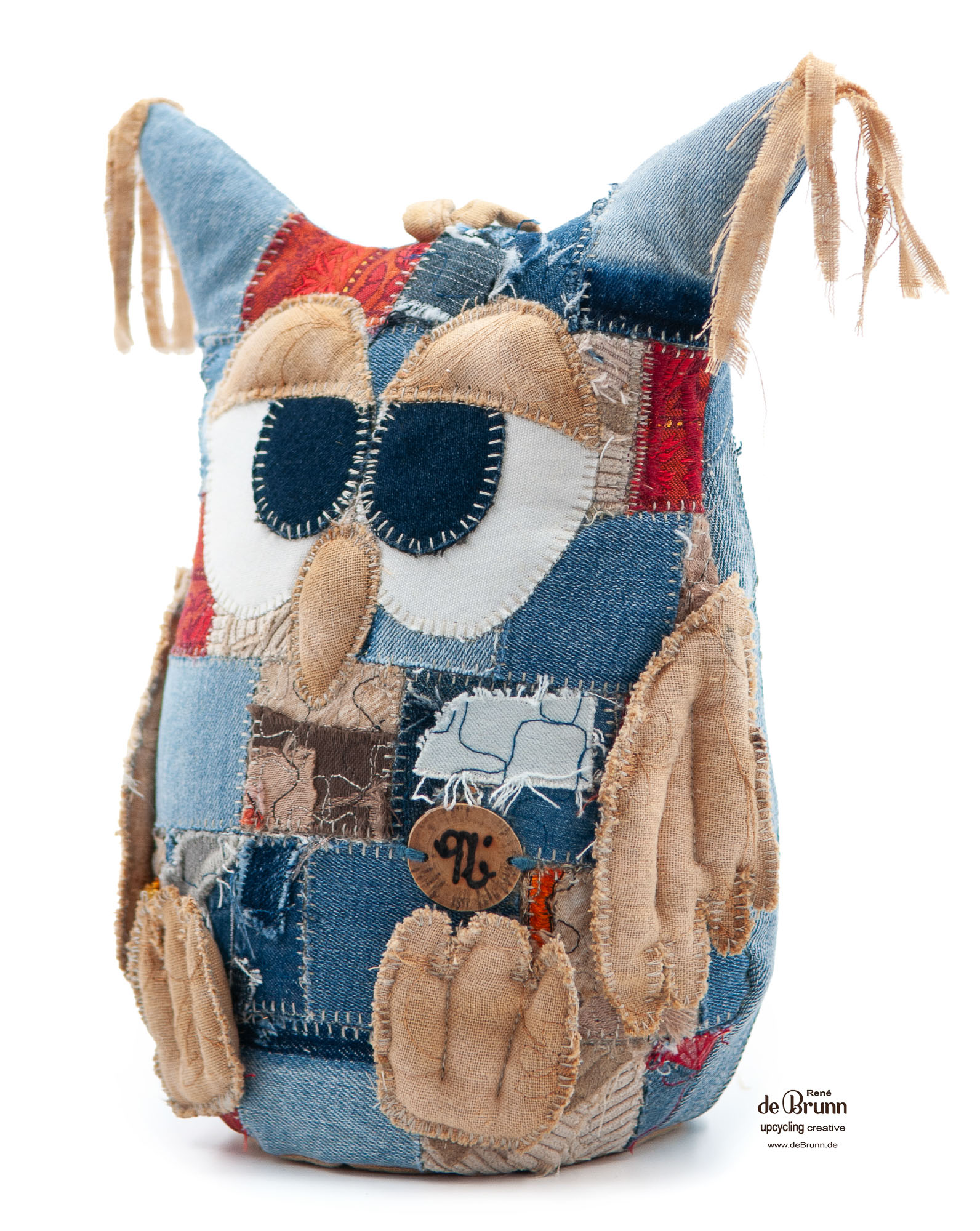 Mit der lustigen Eule verarbeite ich auch die letzten Stoffreste und -schnipsel. Sie ist mit viel Liebe und Leidenschaft aus blauen Jeans- beigen, braunen und roten Stoffresten gefertigt.