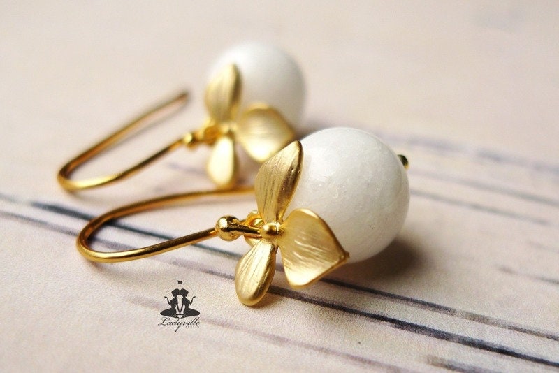 Vergoldete Ohrringe mit weißer Jade Perle und Blüte / Geschenk für Sie