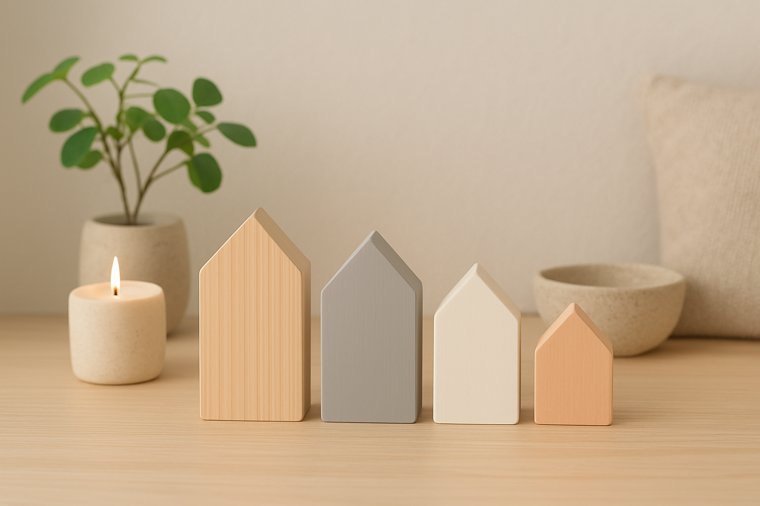 Jedes Haus wird liebevoll von Hand gefertigt, geschliffen und farblich abgestimmt, eine Komposition aus Naturholz, sanftem Grau, Weiß und Karamellton, inspiriert vom ruhigen Rhythmus skandinavischer Wintertage.
