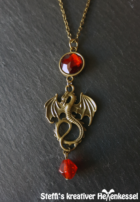 Wunderschöne Kette im Vintage-Stil. Die Kette besteht aus einer feinen bronzefarbenen Gliederkette und einem Drachen-Anhänger. Verbunden werden beide mit einem roten Cabochon in einer Fassung. Zusätzlich hat der kleine süße Drache noch eine rote Glasschliff-Perle am Schwanz hängen.