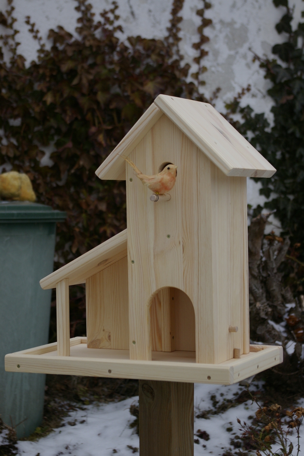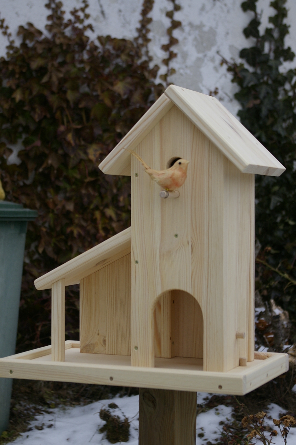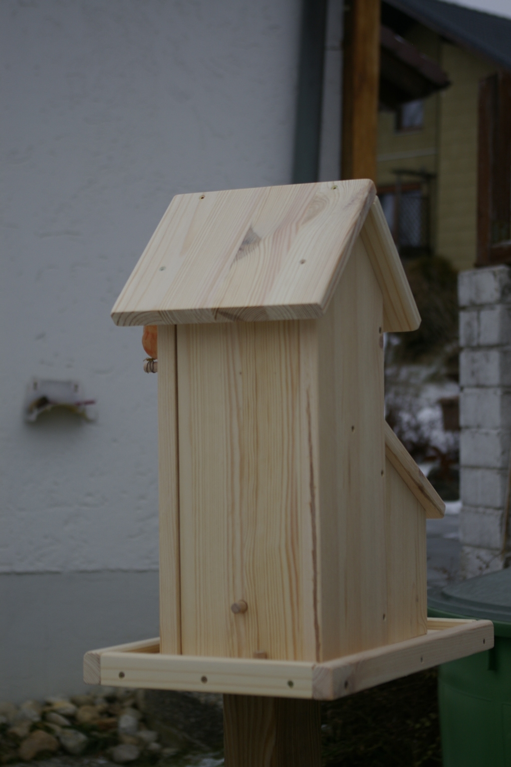 Oben ist der Nistkasten und unten ein großer Futterplatz
