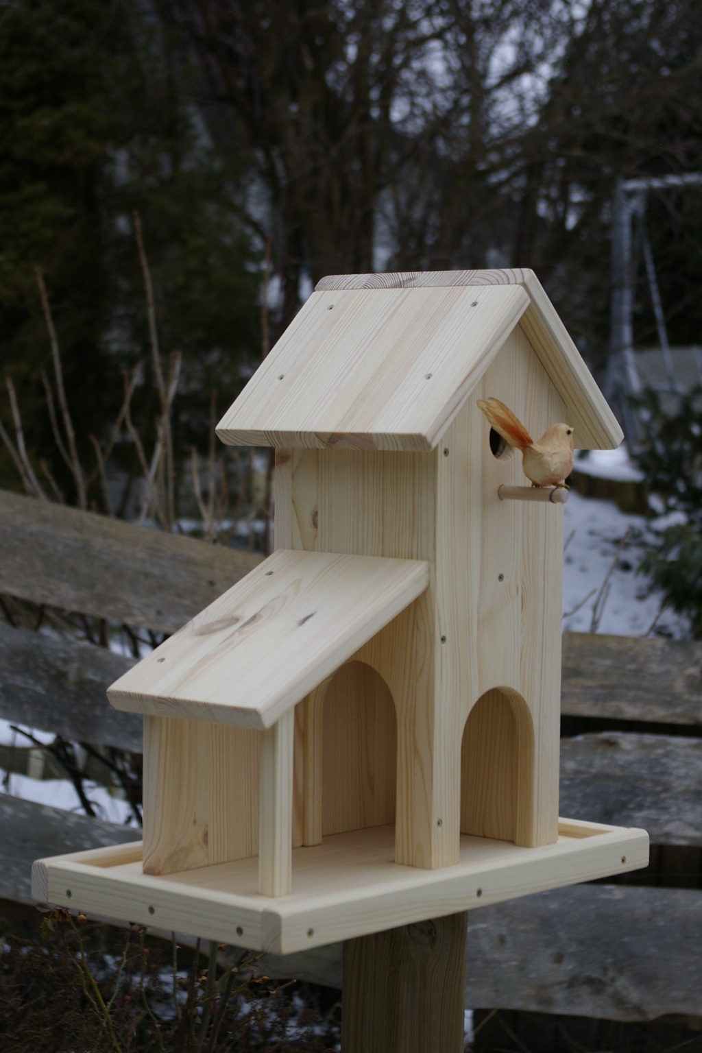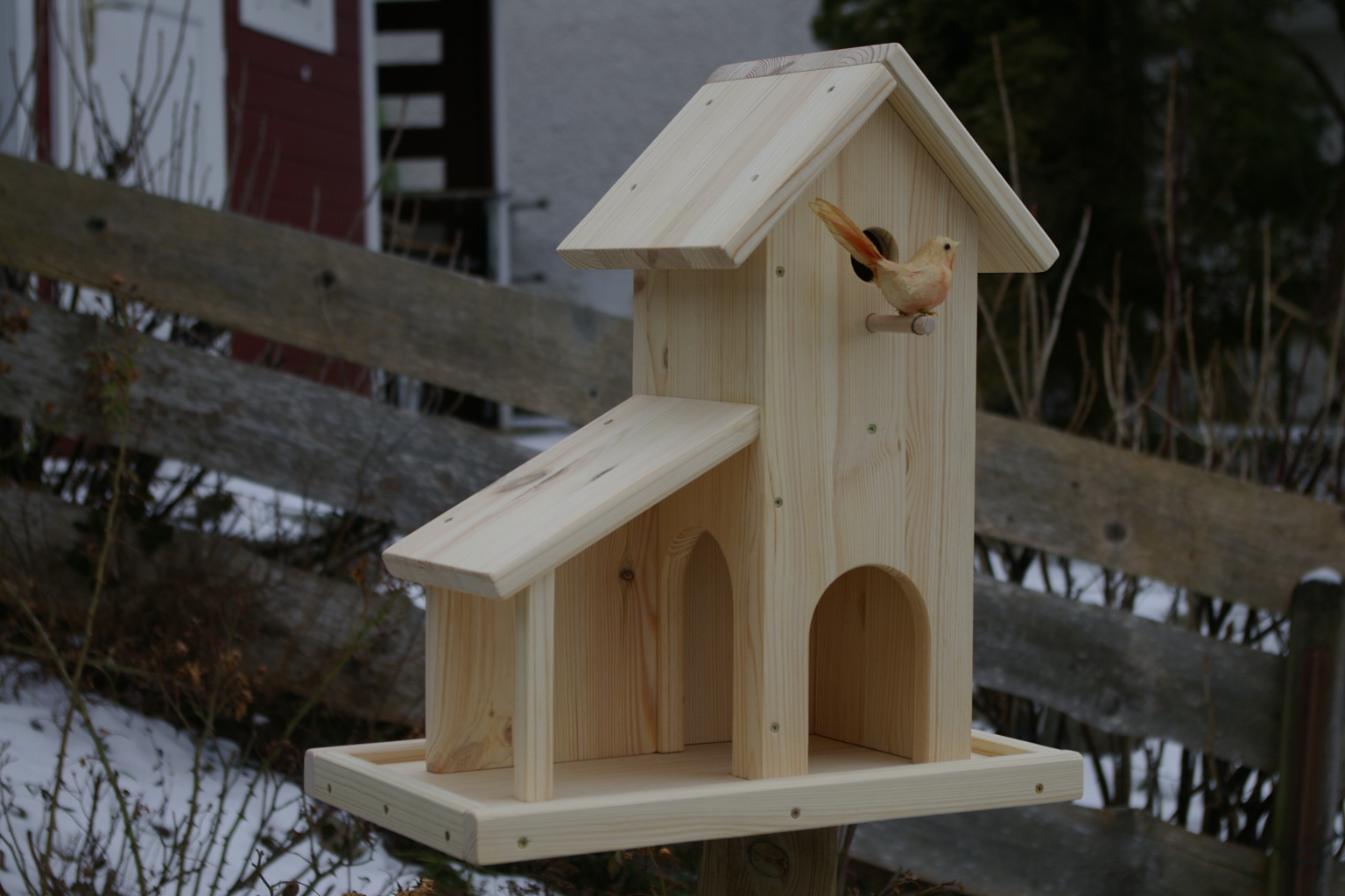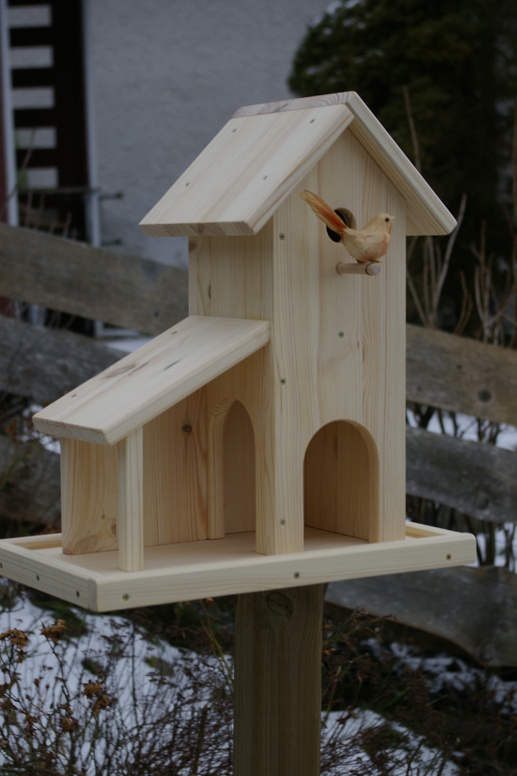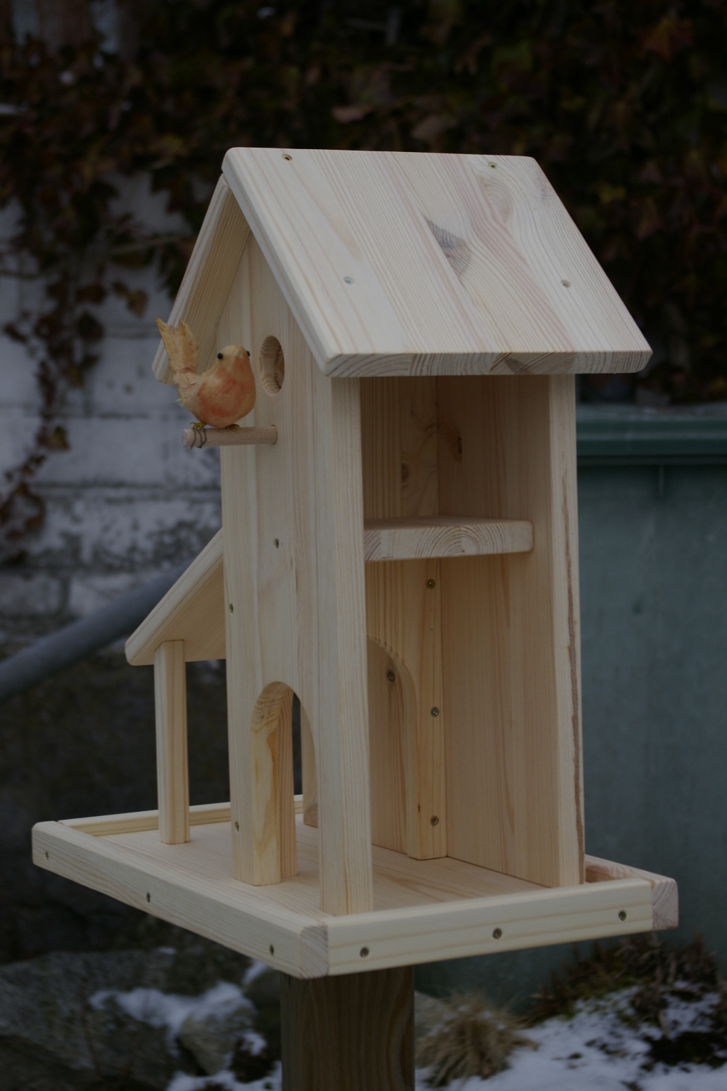 Oben ist der Nistkasten und unten ein großer Futterplatz