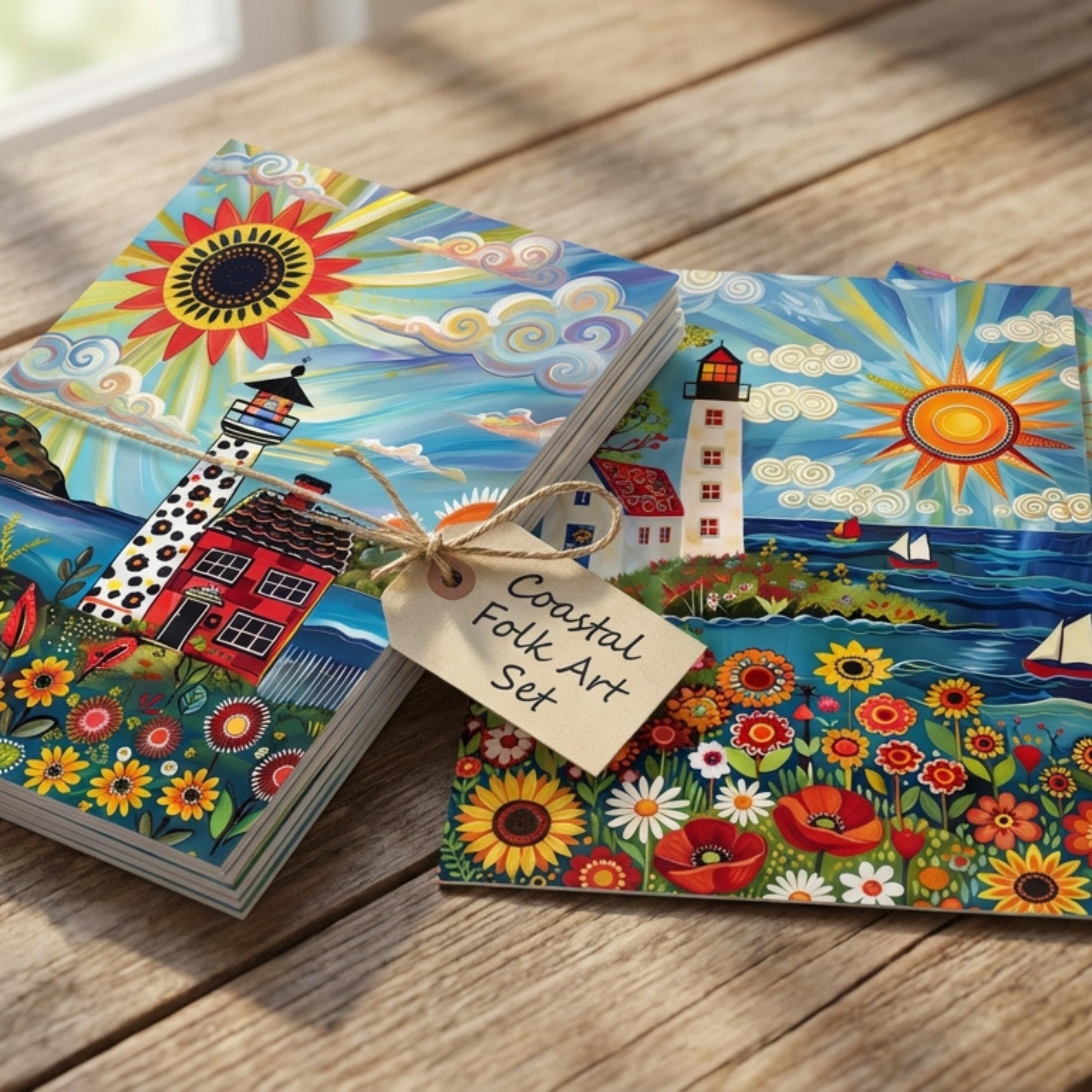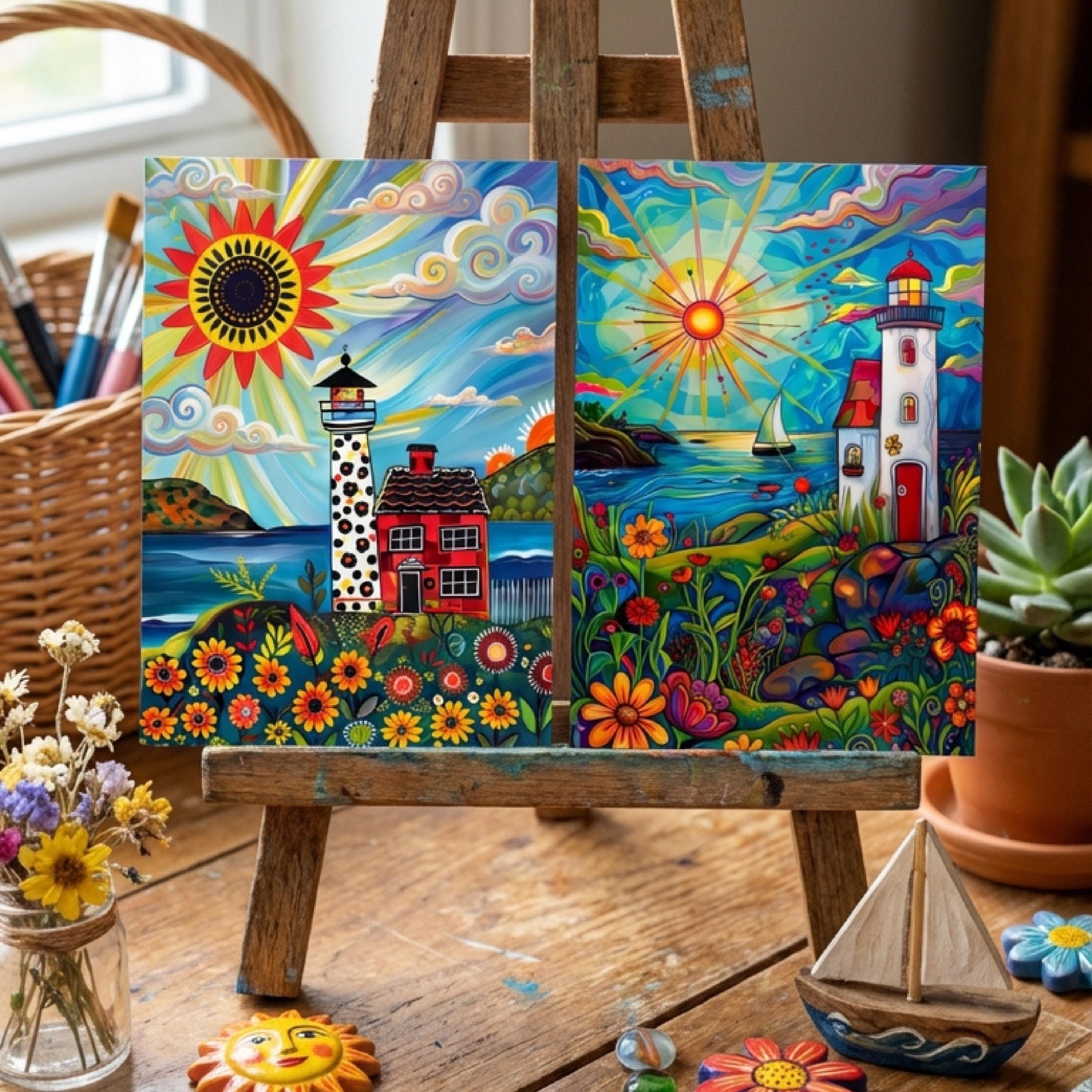 Dieses 4er Mini Print-Set vereint vier kraftvolle Leuchtturm- und Küstenmotive voller Lebensfreude. Strahlende Sonnen, blühende Wiesen, Segelboote und maritime Details machen diese Mini Prints zu echten Blickfängern.