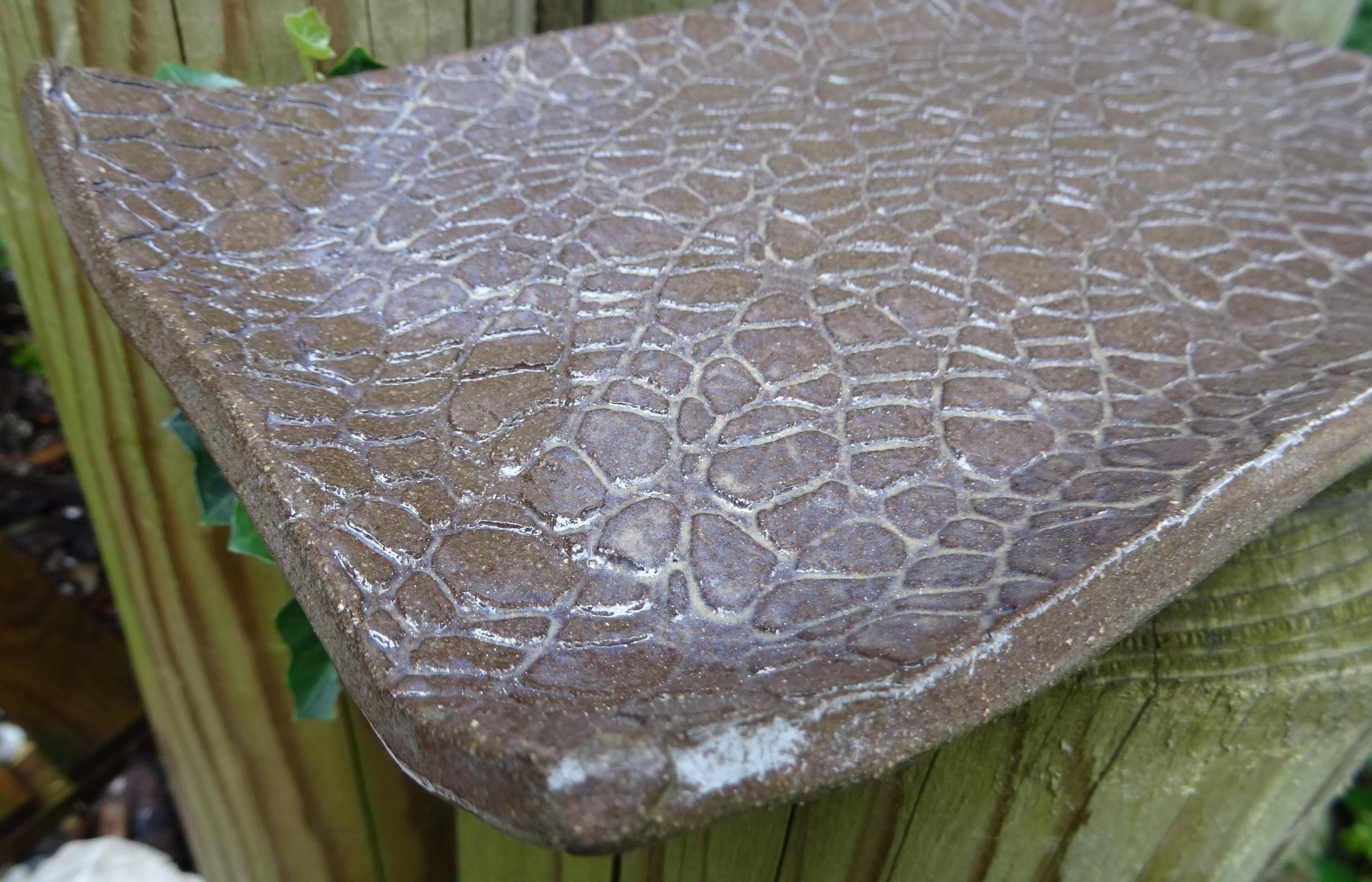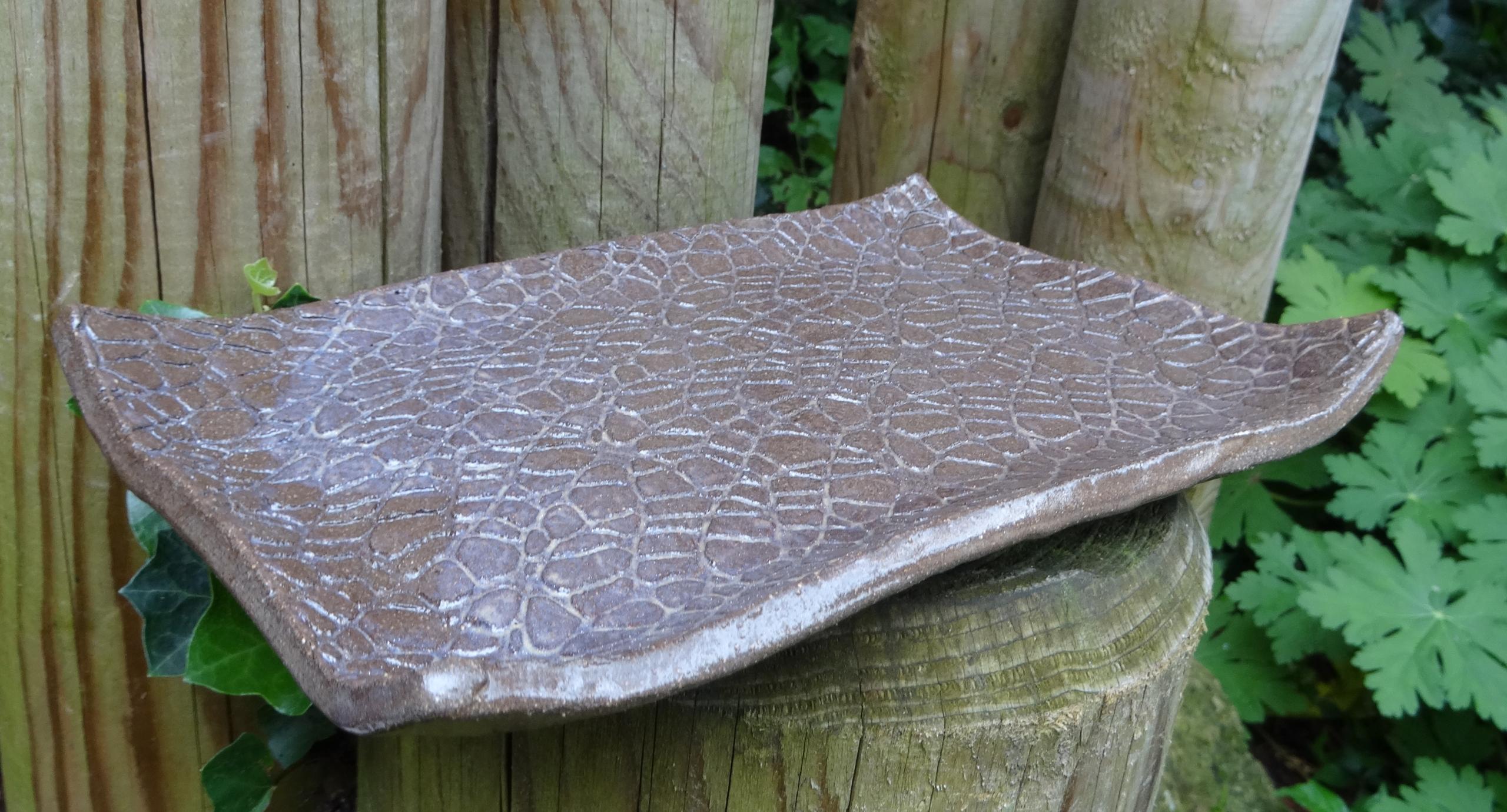 Aus schwarzem Ton modellierte Platte mit aufgestellten Rändern, eingearbeitetes Muster und mit Glasur perlmutt glänzend fertiggestellt. Unterseitig Filzfüßchen angebracht.
