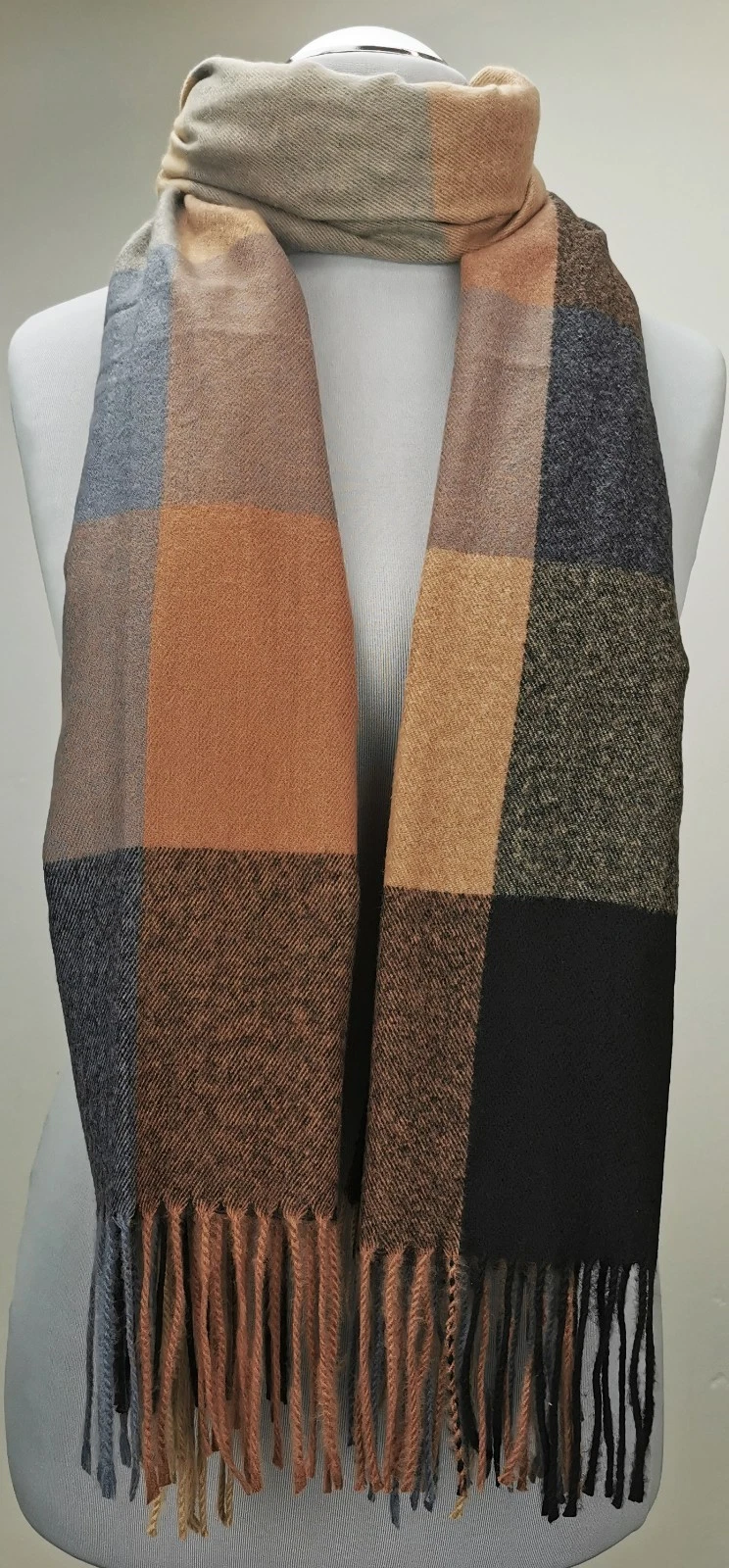 Sie kaufen 1 weichen Karo-Strick-Schal für Damen/Herren mit Fransen, neu und ungetragen in der Originalverpackung. Farbe: schwarz-camel - Maß: ca 200 x 70 cm inclusive Fransen, klassischer Stil, mit Karo-Muster - ein idealer Begleiter für alle Gelegenheiten!