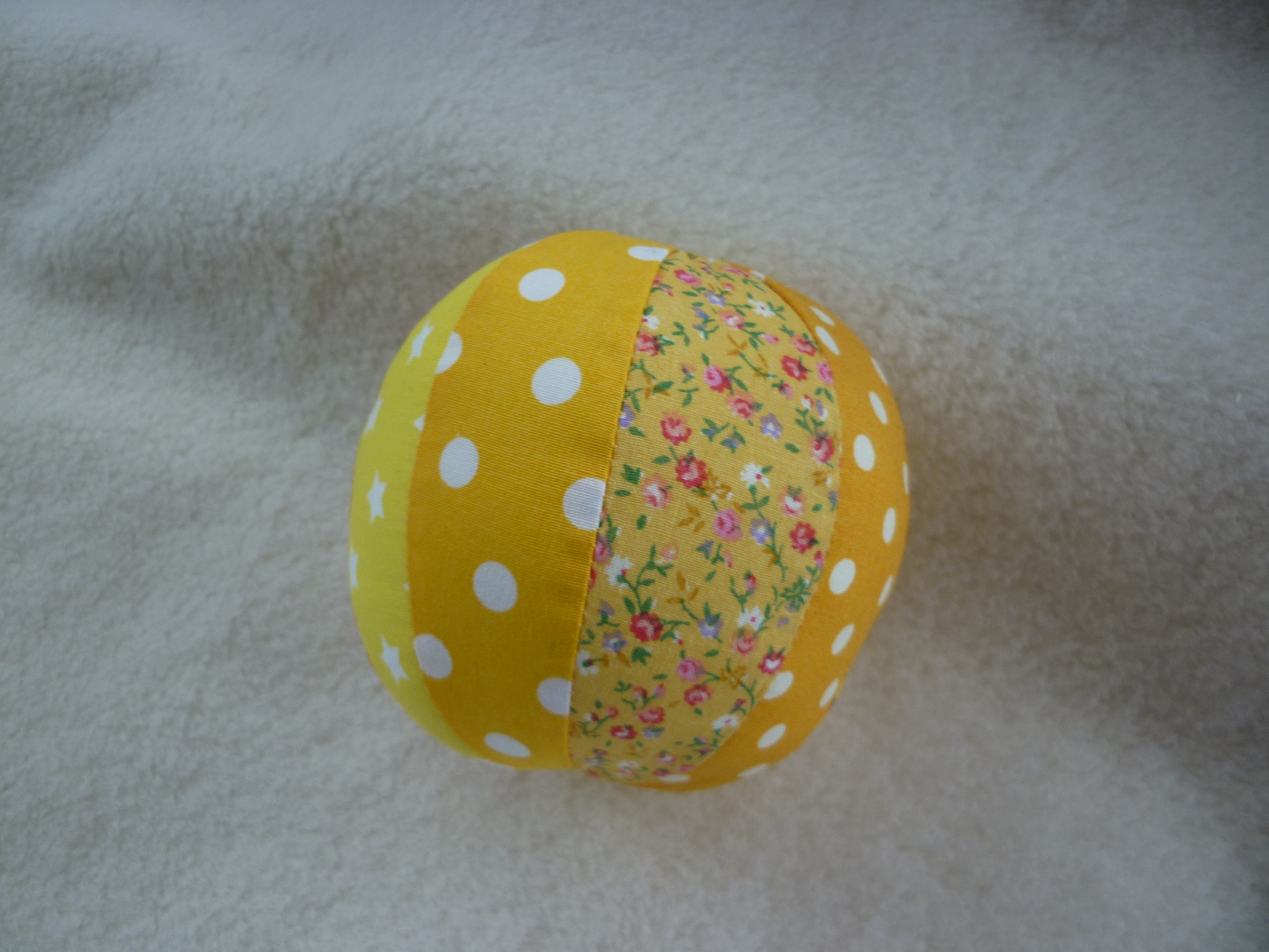 Aus gelben Baumwollstoffen genäht und mit Maiswatte gefüllt. Der Umfang beträgt 30,5 cm, der Durchmesser ca 10 cm.