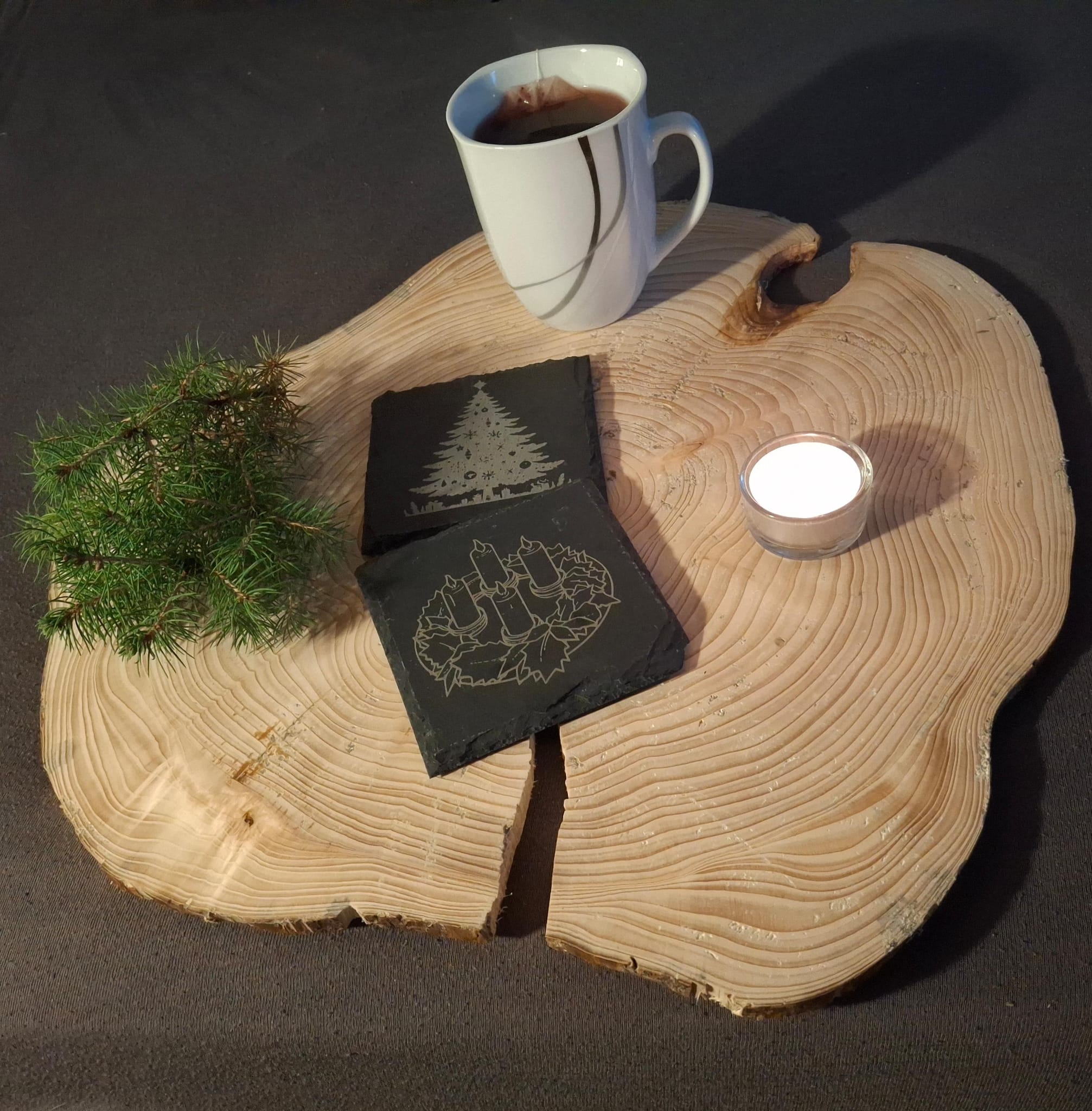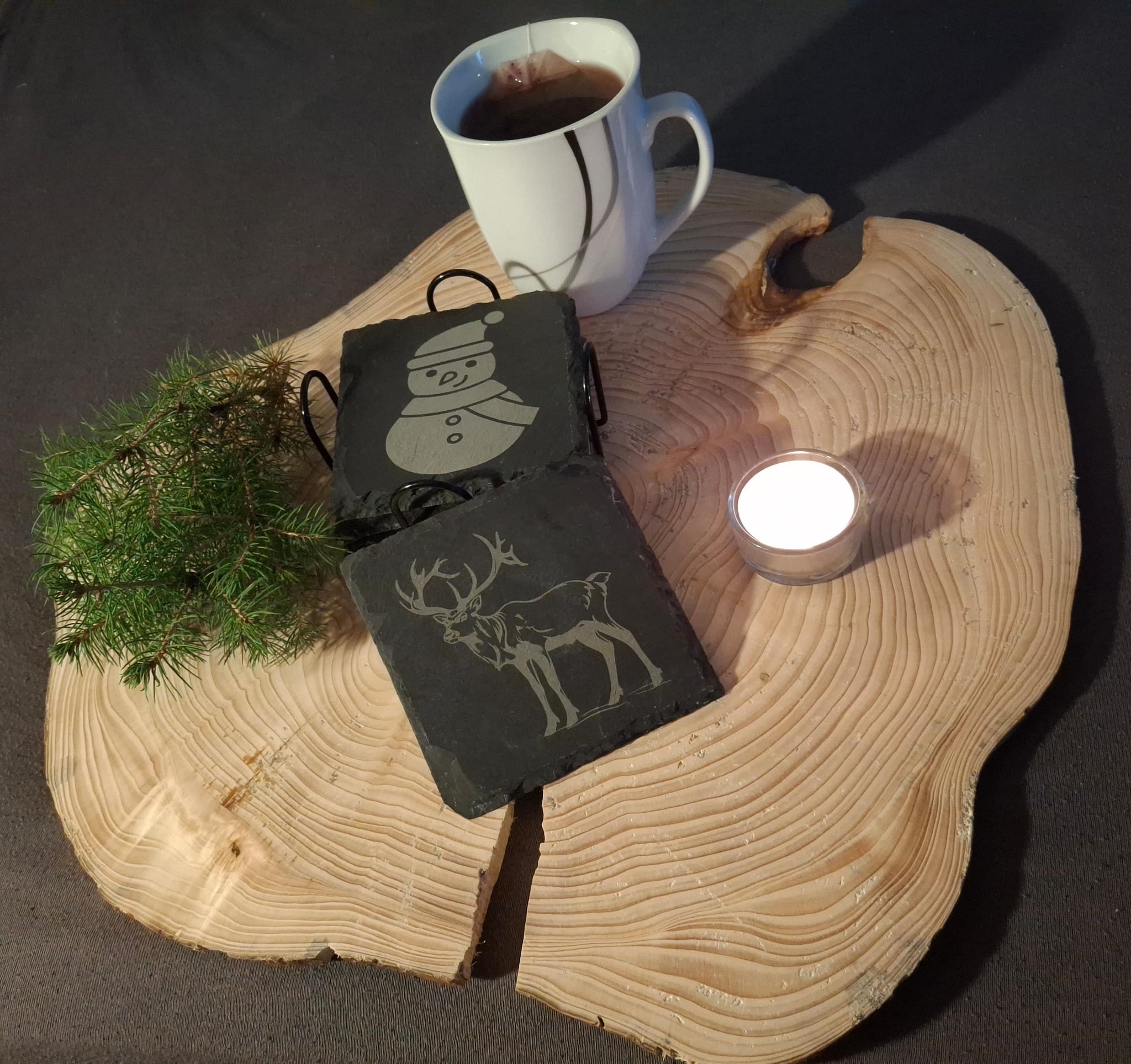 Verleihen Sie Ihrer Festtafel einen ganz besonderen Charme mit unseren edlen Schieferuntersetzern im Weihnachts-Design.