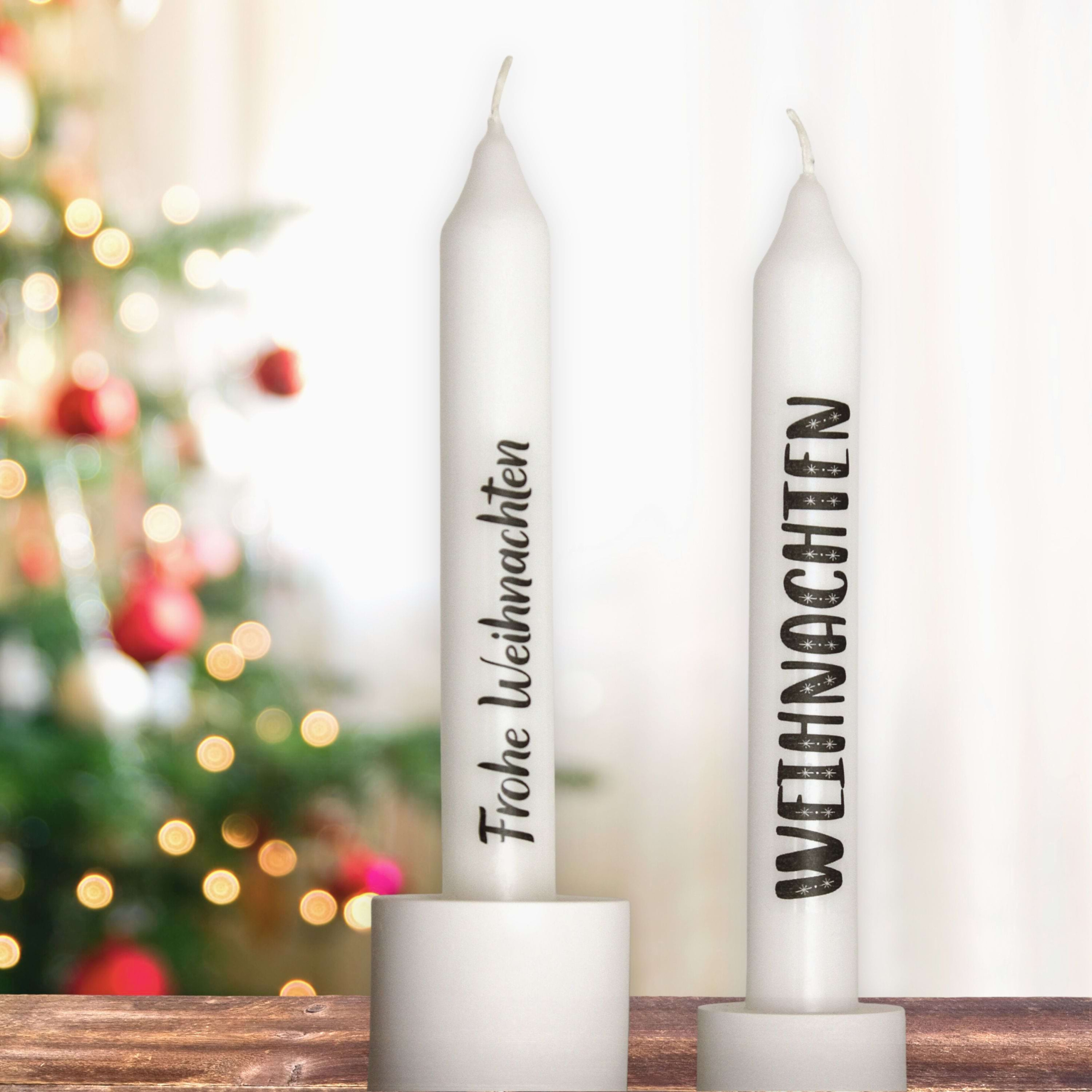 Diese weißen Stabkerzen bringen eine moderne Note in deine Weihnachts- und Winterdeko. Jede Kerze ist mit einem klaren Schriftzug versehen, zum Beispiel Frohe Weihnachten, Winterzeit oder Weihnachtskerze. So kannst du genau die Variante auswählen, die zu deinem Zuhause passt.