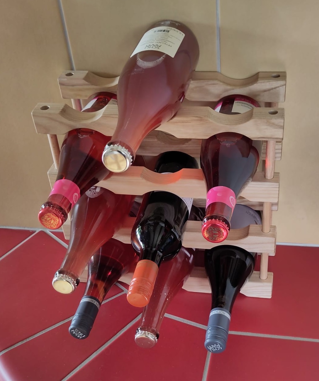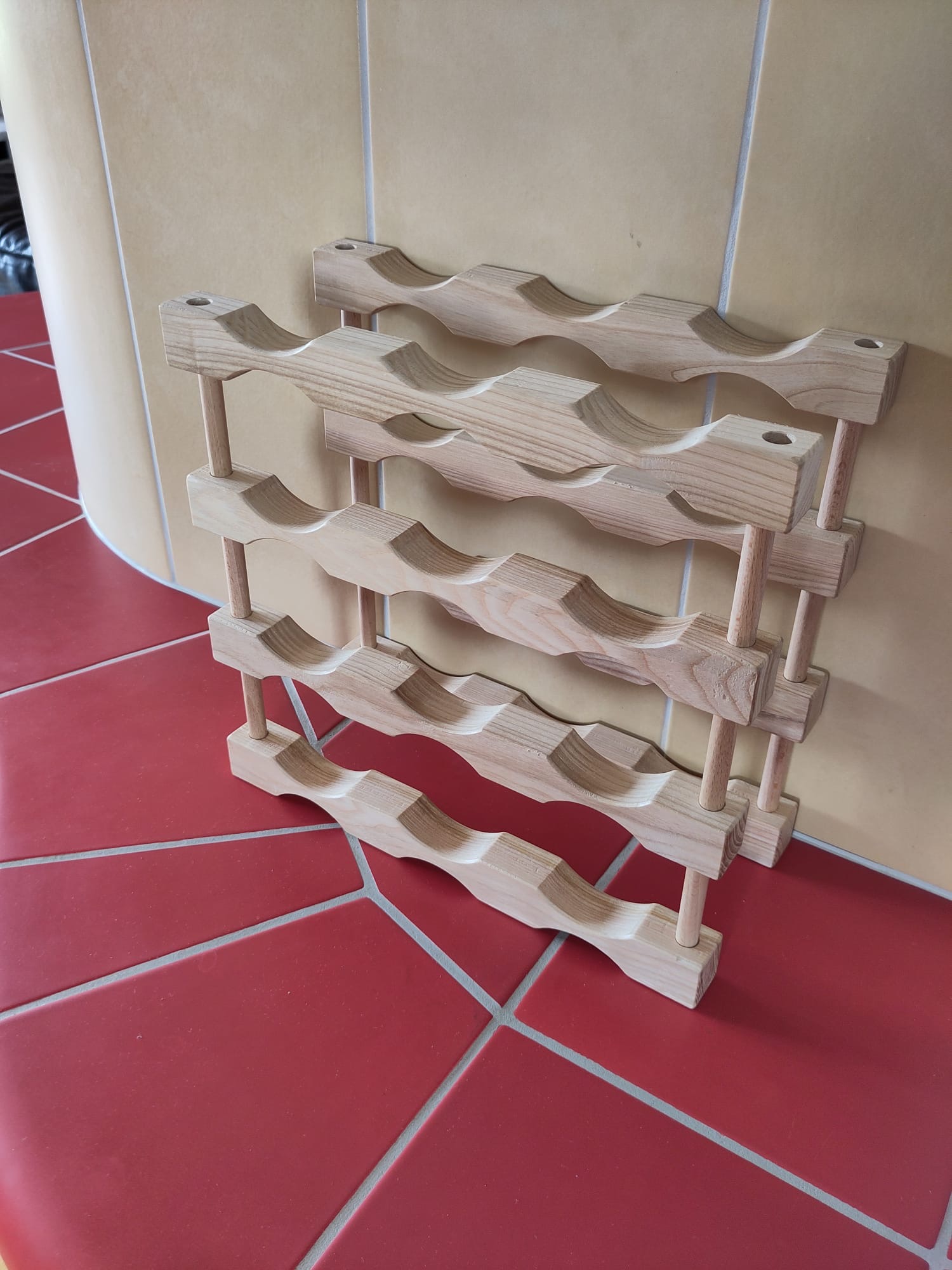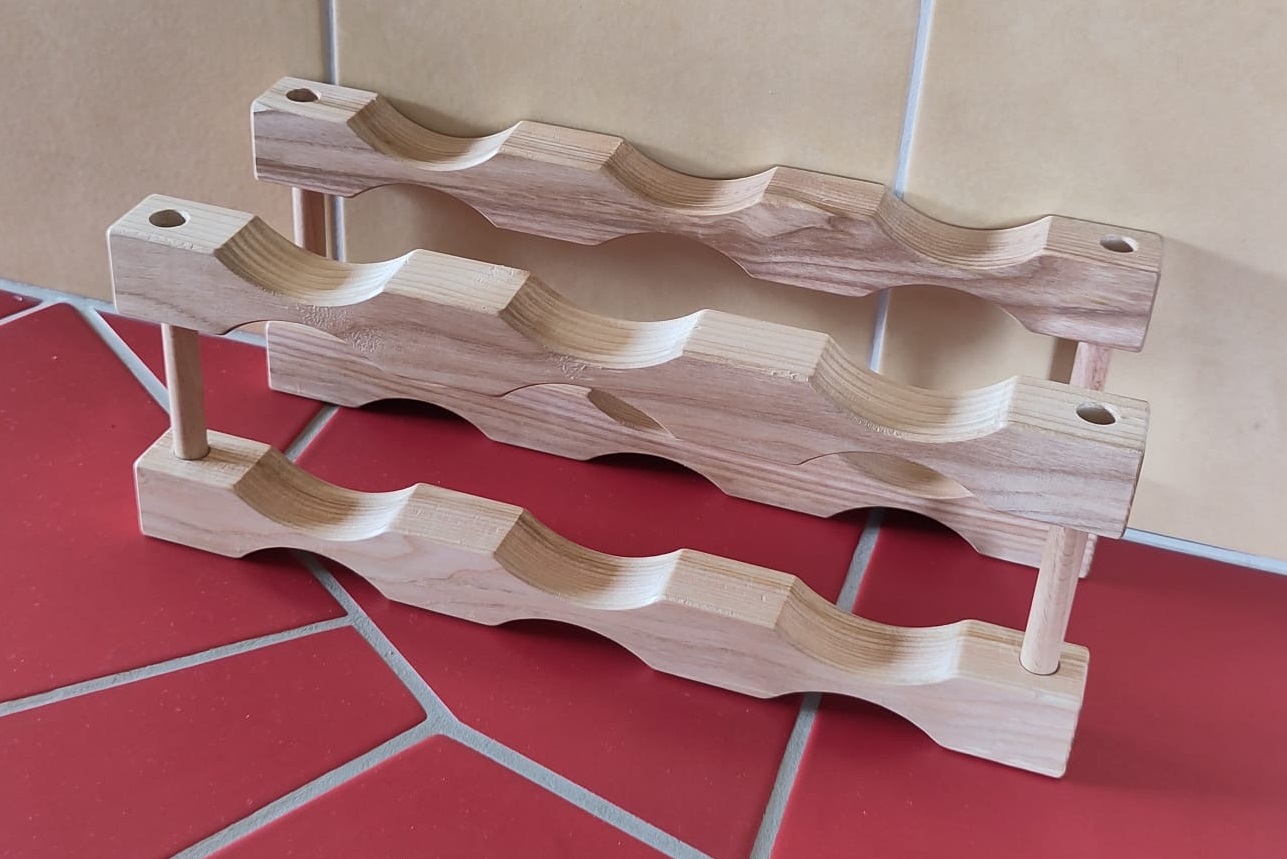 - Fassungsvermögen: Das Grundmodul besteht aus 4 Auflagen und 4 Holzstäbe (Abstandshalter/Distanzen), für die Lagerung von 6 Flaschen.