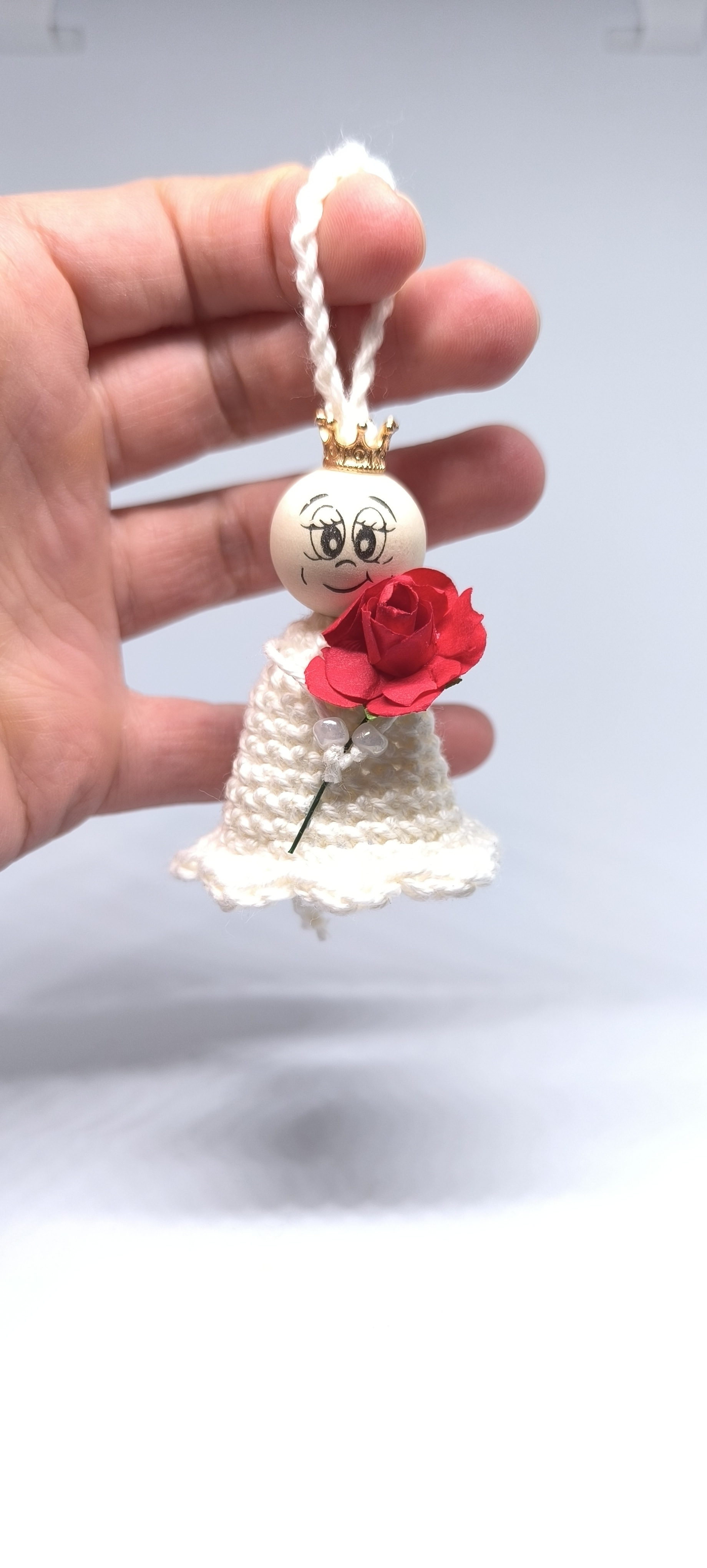 - Baumwollgarn (gehäkelt), Holzkugel (Kopf), Perlenelemente, je nach Modell dekorative Accessoires aus Holz, Plastik, Acryl, Papier oder Metall-Draht Dekorationsartikel – kein Spielzeug. Nicht geeignet für Kinder unter 3 Jahren (verschluckbare Kleinteile).