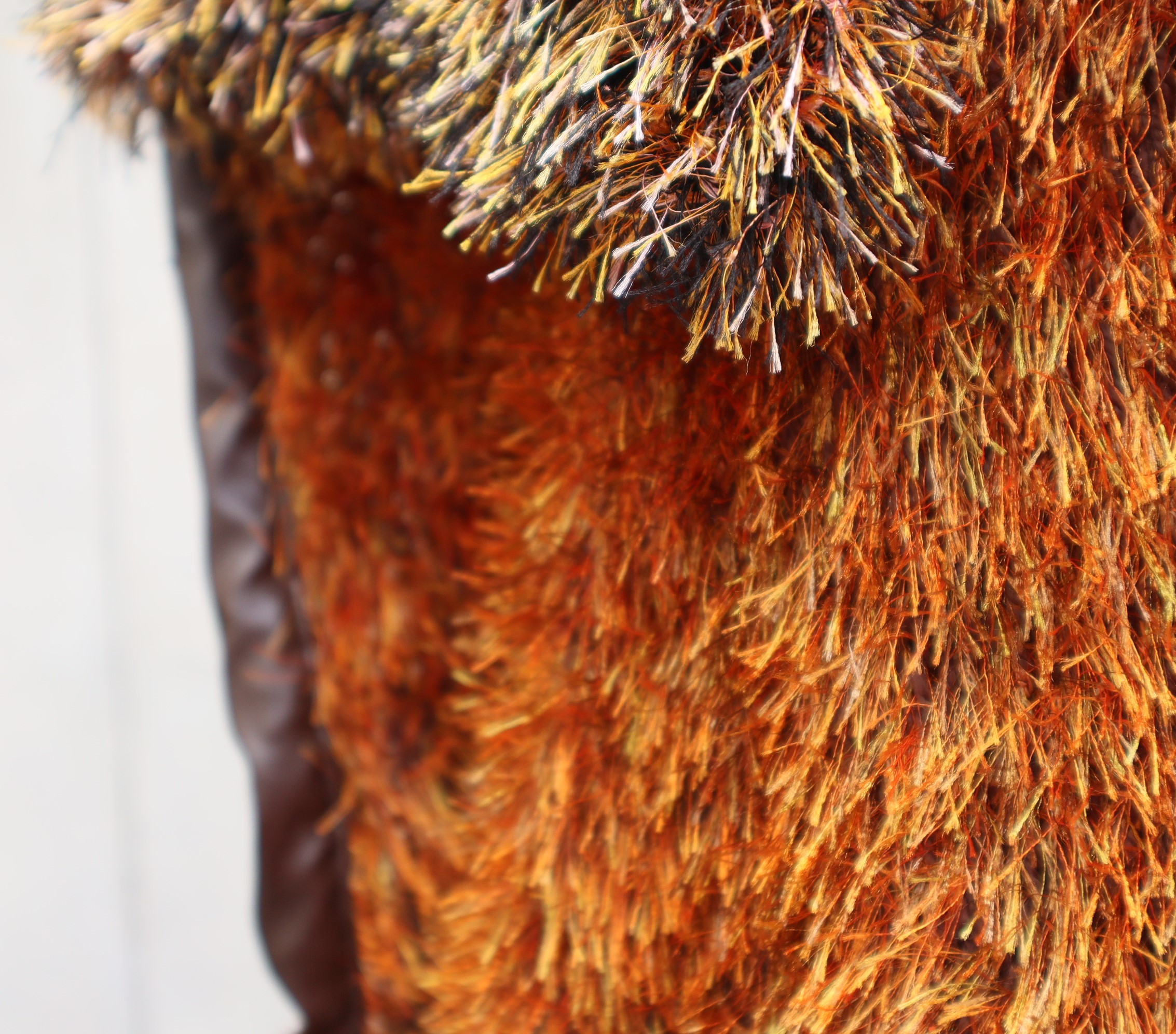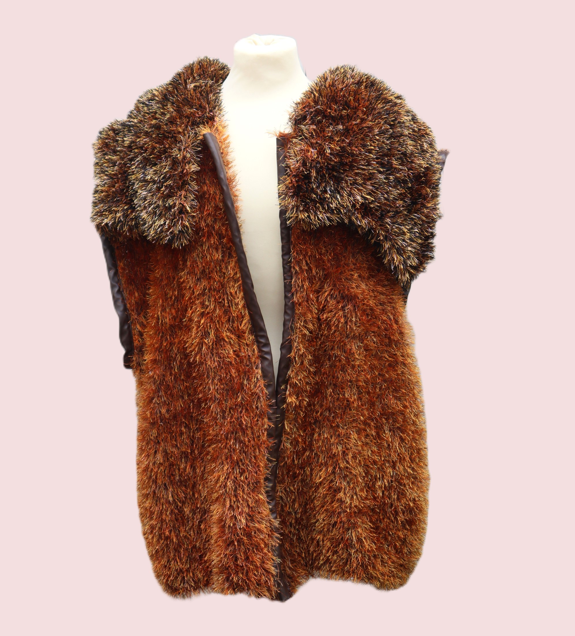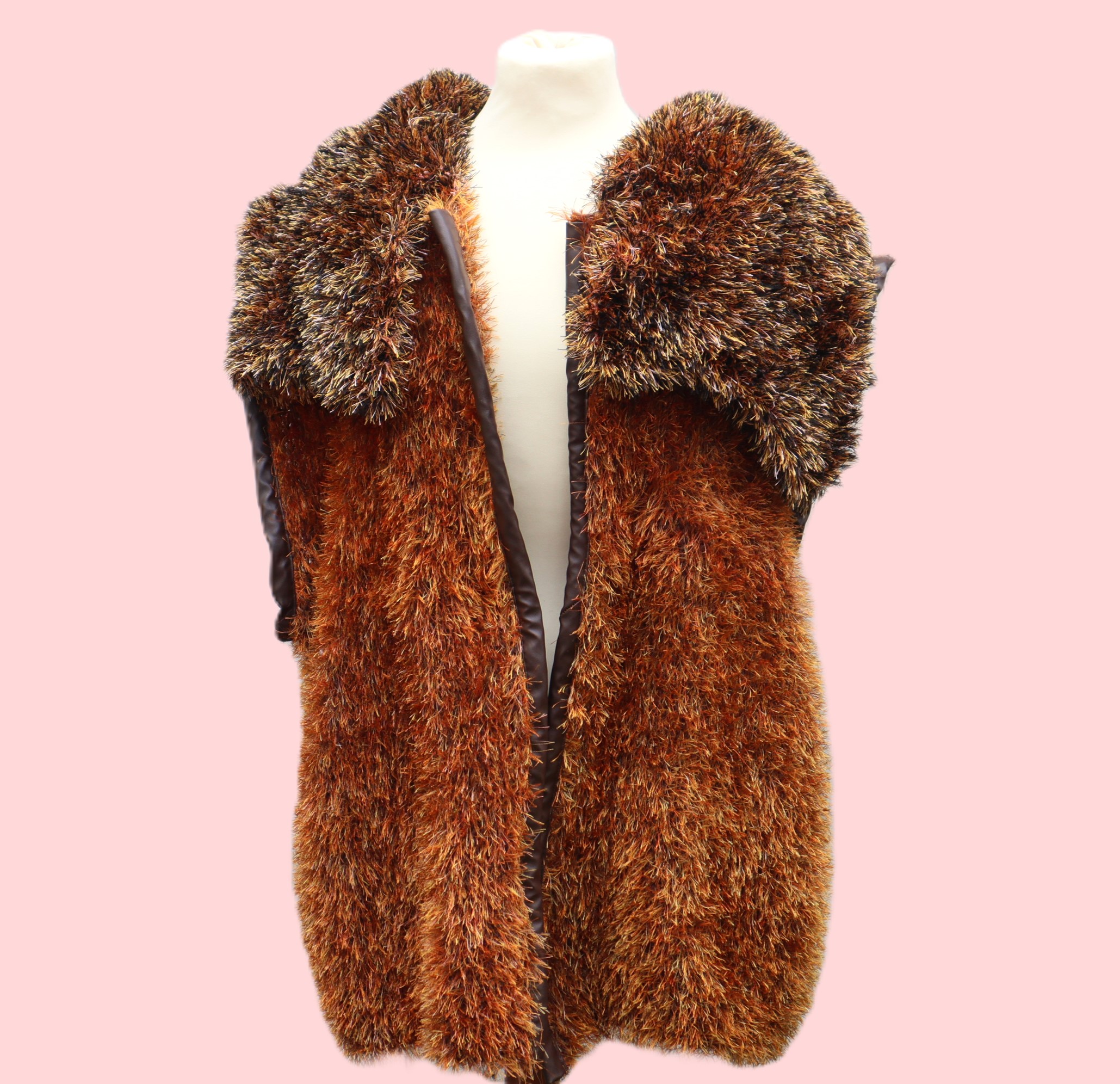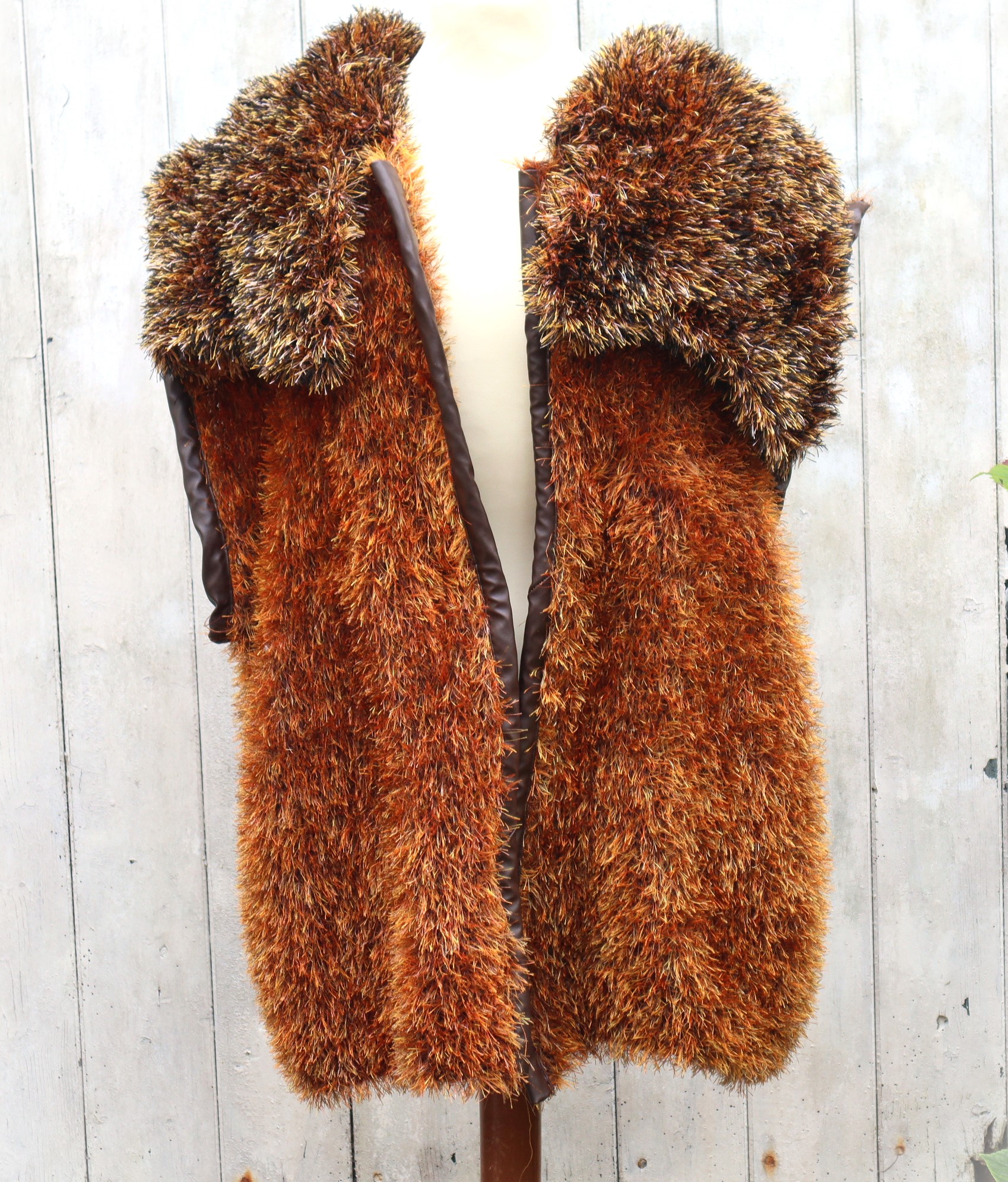 Tolle handgestrickte Weste in großer Größe aus einem schicken Fransengarn in braun Tönen. An diese Weste habe ich einen großen Kragen angesetzt. Die vordere Abschlußkante sowie die Armlöcher habe ich mit einem braunen Kunstleder eingefasst. Die Armlöcher sind schön groß, sodass man bequem eine Jacke darunter tragen kann.