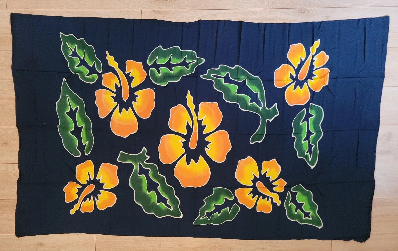 Sie kaufen 1 Damen-Wickelrock, handbemalt, mit Sarong-Schnalle zum Verschnüren, ohne Fransen, Motiv "Flower-Blumen". Farbe: dunkelblau mit gelb-grünen Blumen. Kollektion 2026.