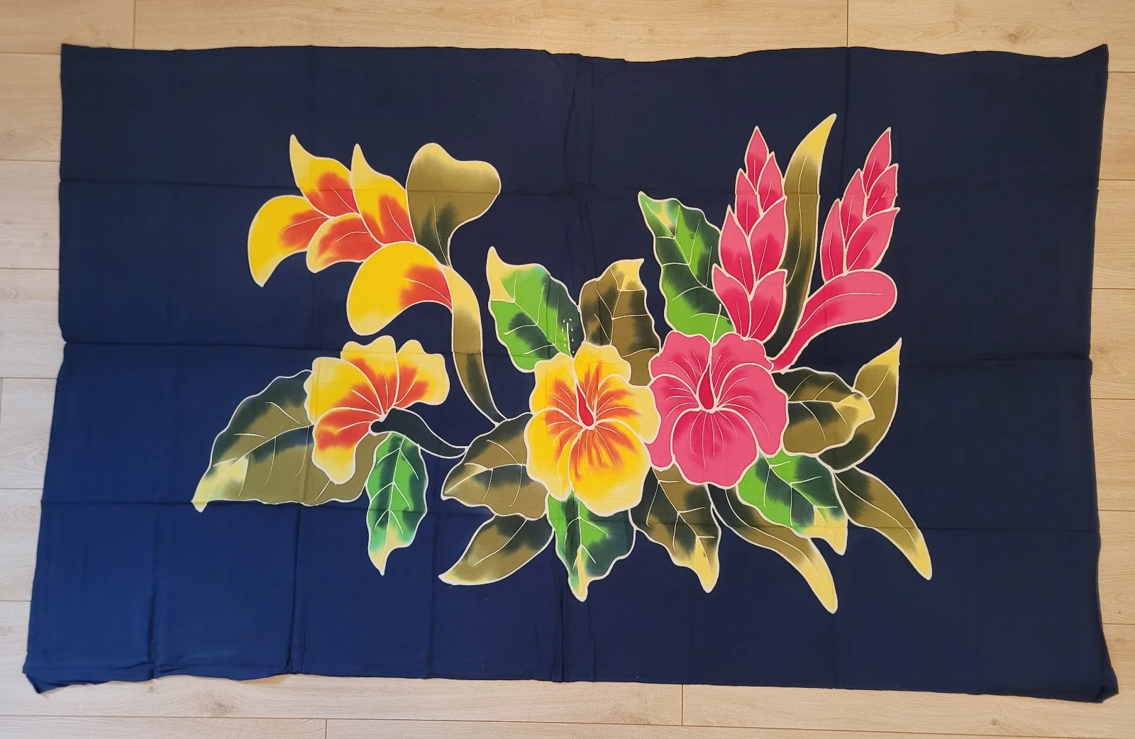 Sie kaufen 1 Damen-Wickelrock, handbemalt, mit Sarong-Schnalle zum Verschnüren, ohne Fransen, Motiv "Flower-Blumen". Farbe: dunkelblau mit bunten Blumen. Kollektion 2026.