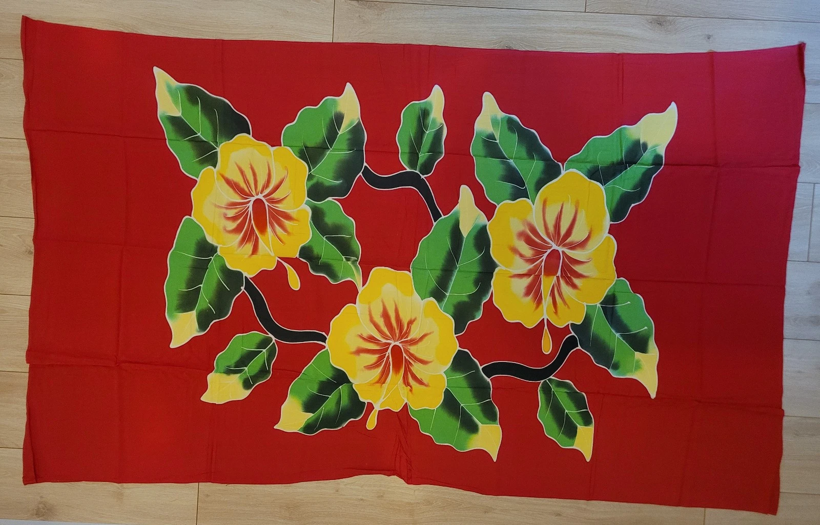 Sie kaufen 1 Damen-Wickelrock, handbemalt, mit Sarong-Schnalle zum Verschnüren, ohne Fransen, Motiv "Flower-Blumen". Farbe: weinrot mit gelb-grünen Blumen. Kollektion 2026.