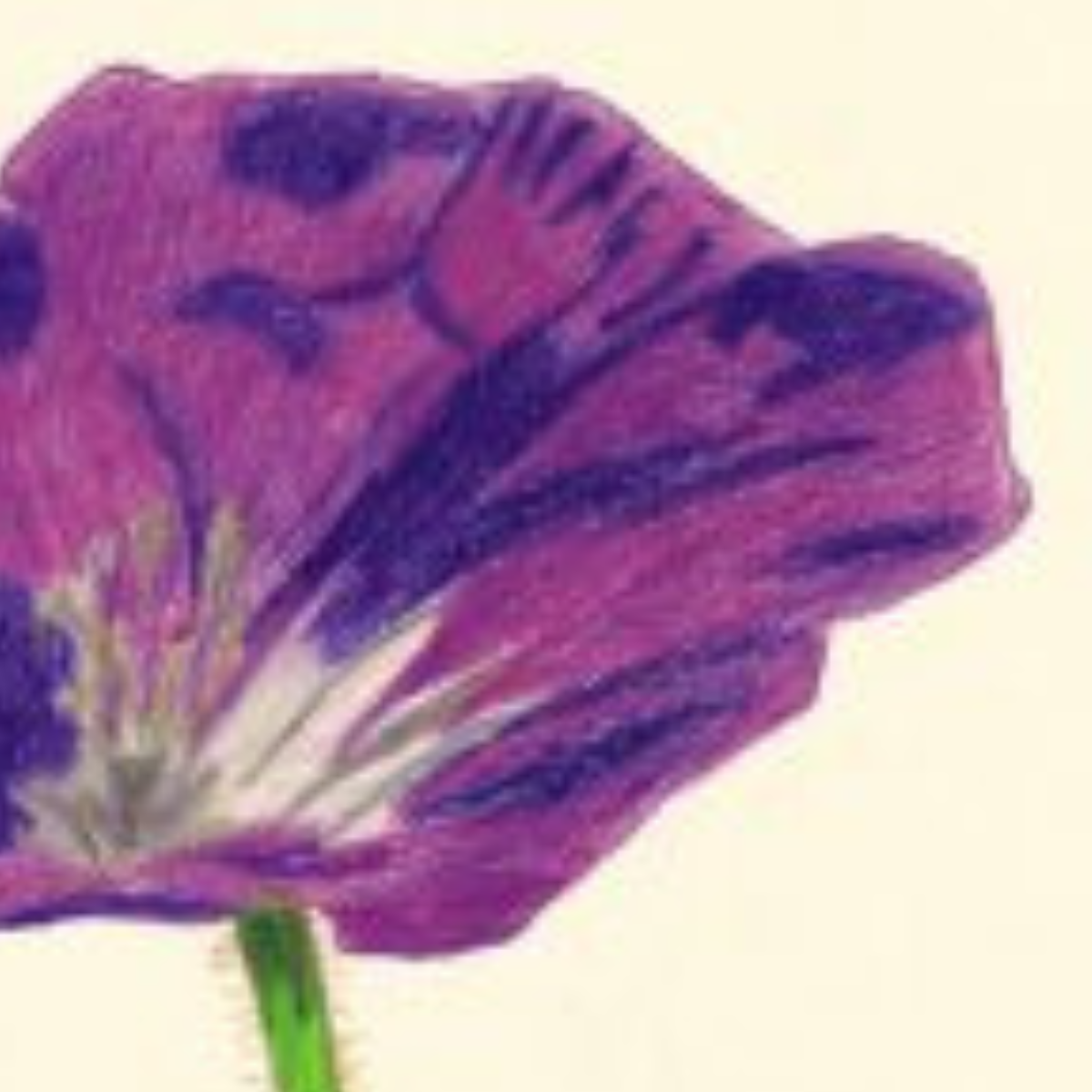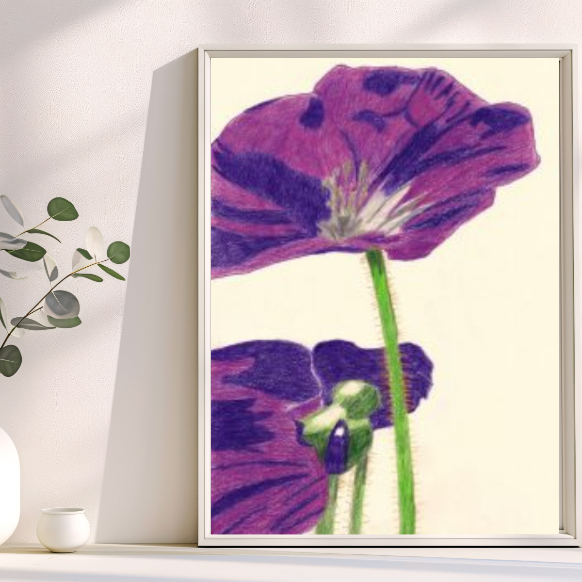 Mit hochwertigen Polychromos-Künstlernfarbstiften wurde jedes Blütenblatt behutsam ausgearbeitet. Das tiefe, lebendige Violett der Blüte bildet einen sanften Kontrast zum warmen, cremefarbenen Papier, das der Zeichnung eine zeitlose und edle Note verleiht. Die feinen Härchen am Stängel und die zarten Farbübergänge zeugen von Handarbeit, die sich Zeit für das Wesentliche nimmt.