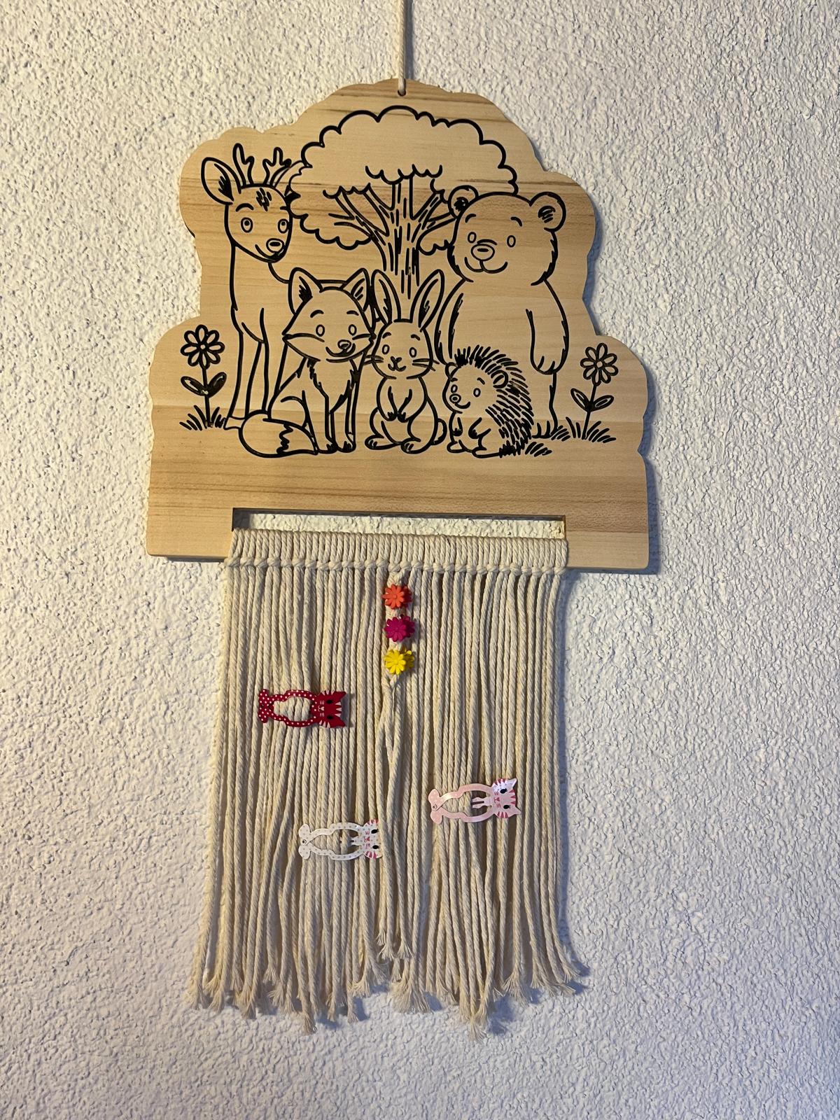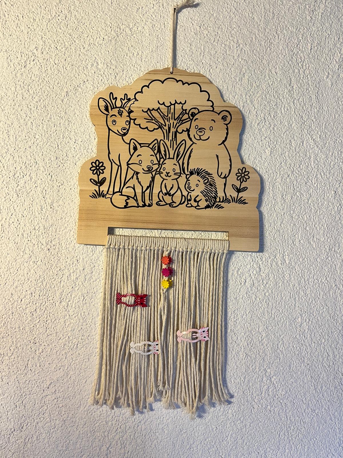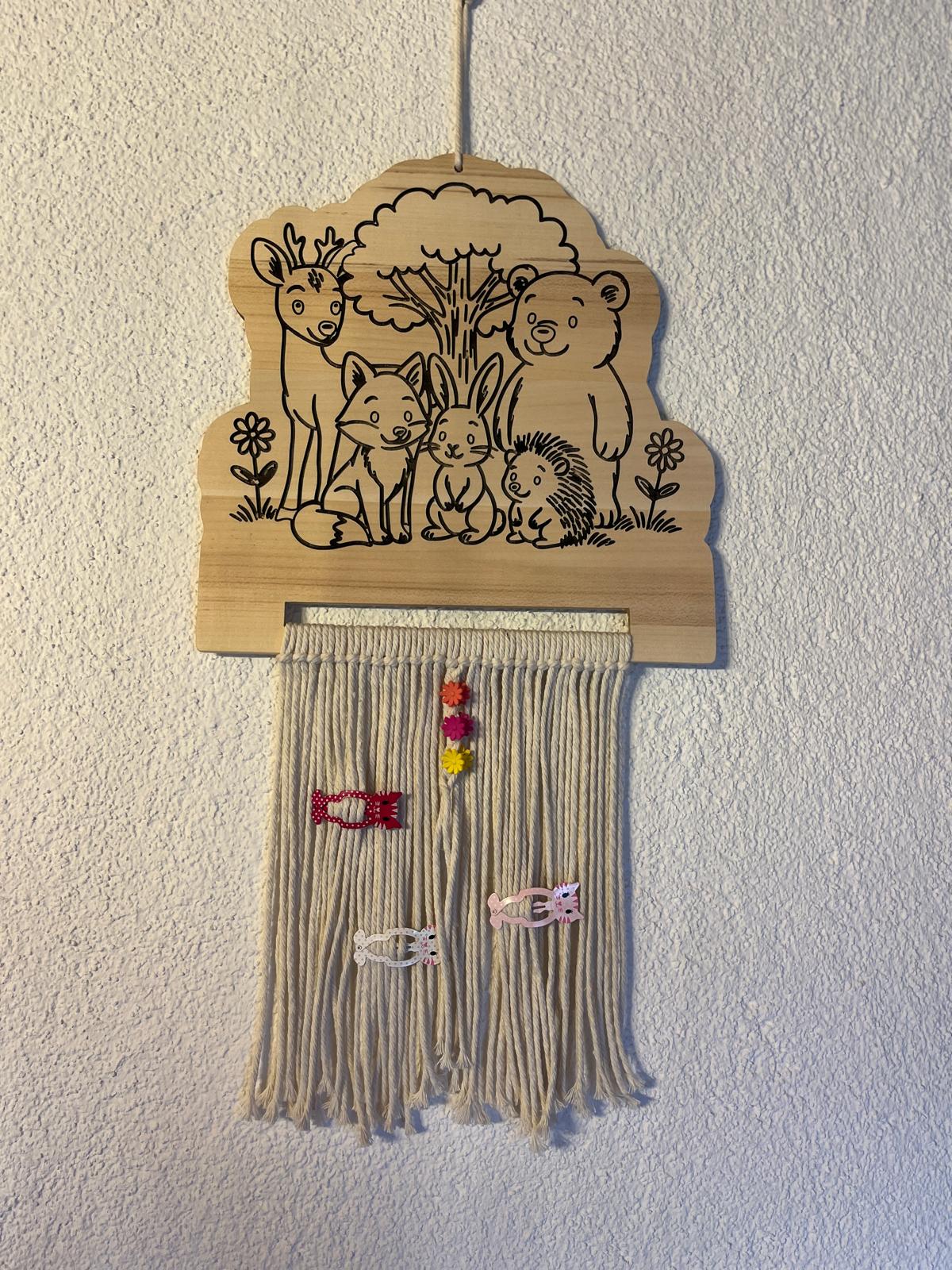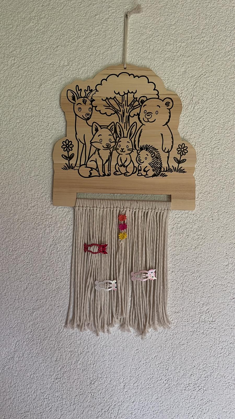 Mit viel Liebe zum Detail gefertigtes Motiv mit Wildtieren und mit Makramee-Bändern versehen, bietet er eine einzigartige und praktische Möglichkeit, Haarspangen, Haarklämmerchen, Schleifen und kleine Accessoires ordentlich und stilvoll aufzubewahren.