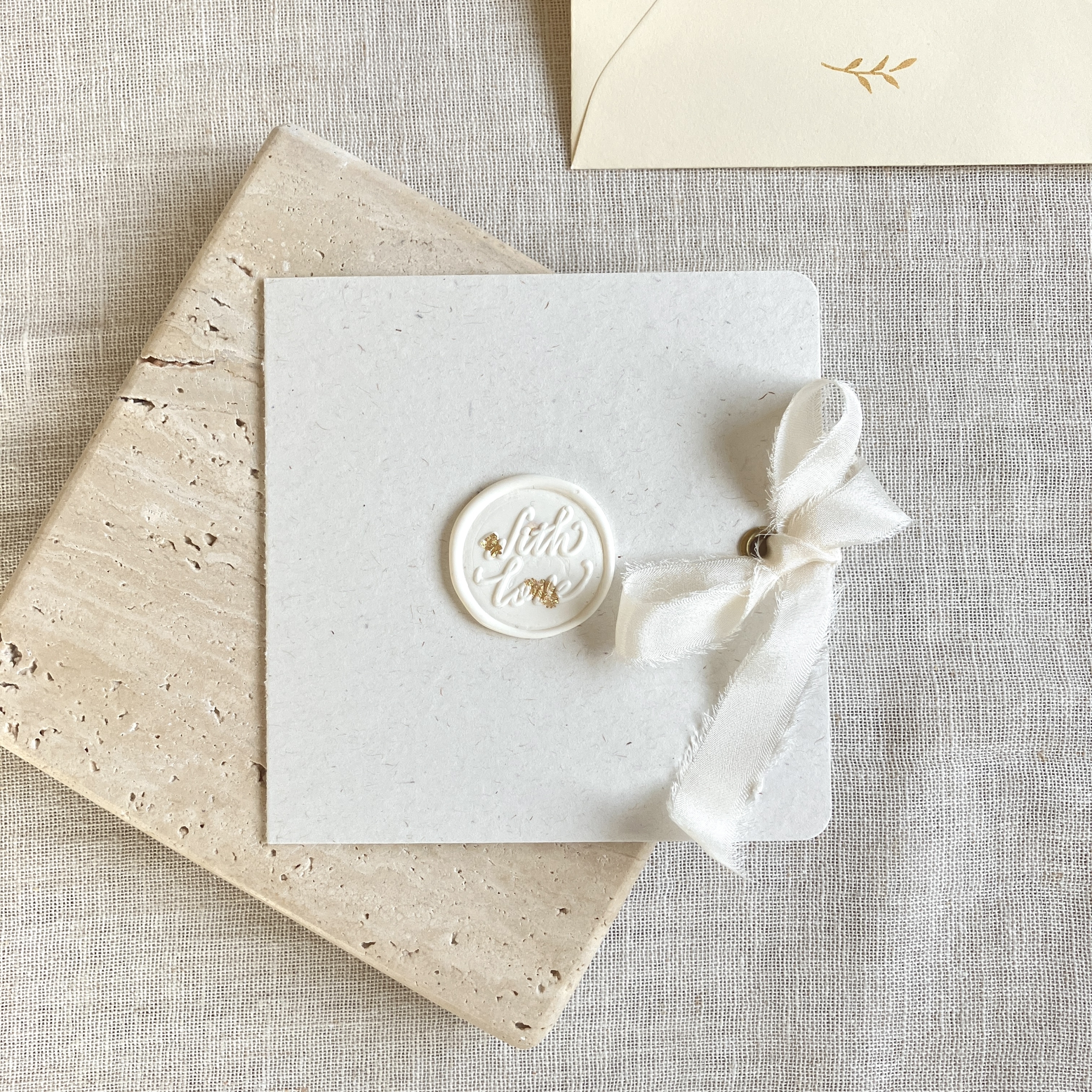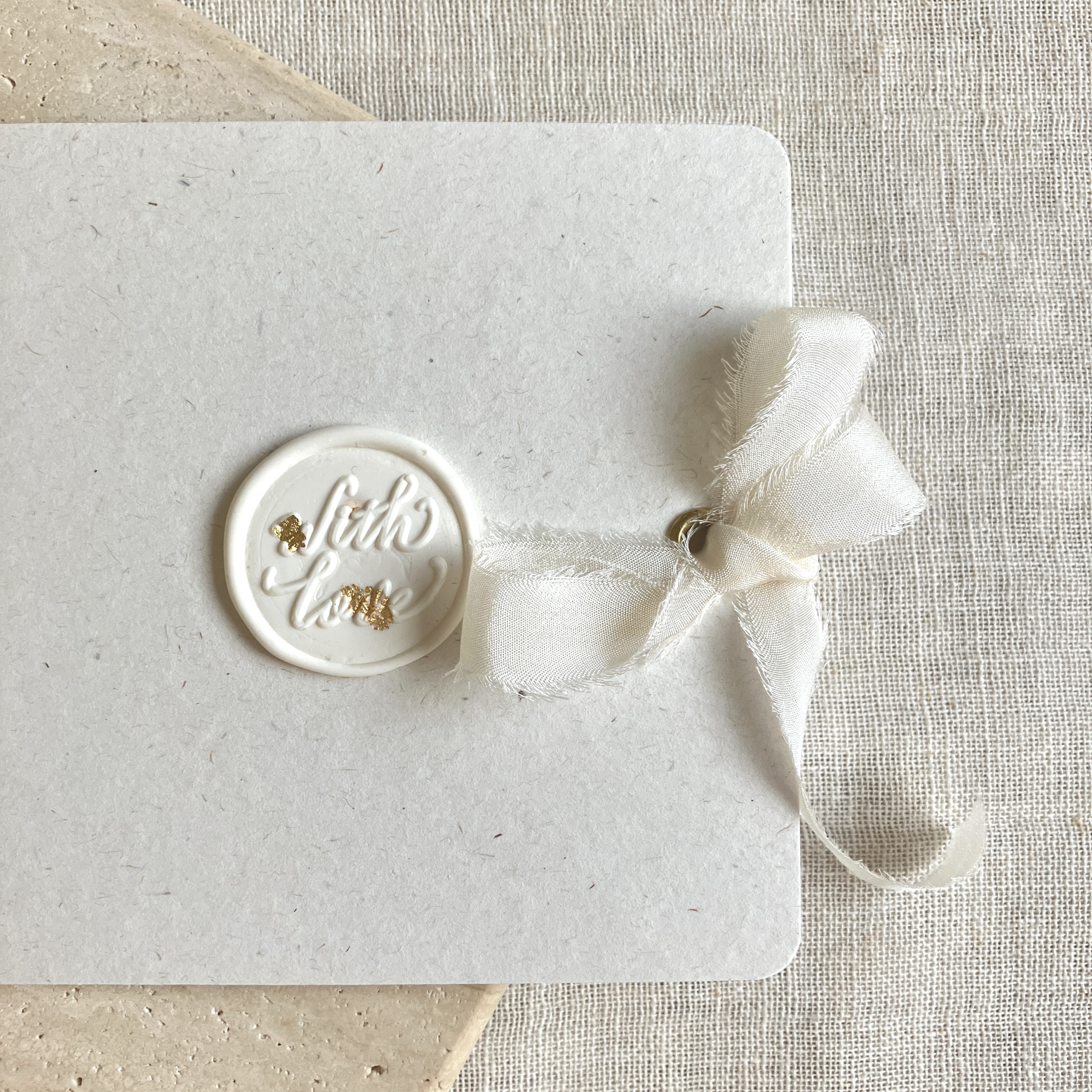 Jede Karte wird mit viel Liebe von mir einzeln handgefertigt: zugeschnitten, gefalzt, abgerundet, die Ösenveredelungen eingestanzt und das Wachssiegel gegossen. Abgerundet durch eine farblich passende, feine Seidenschleife erhältst du deine Karte zusammen mit einem cremefarbenen, dezent bestempelten Papierumschlag.