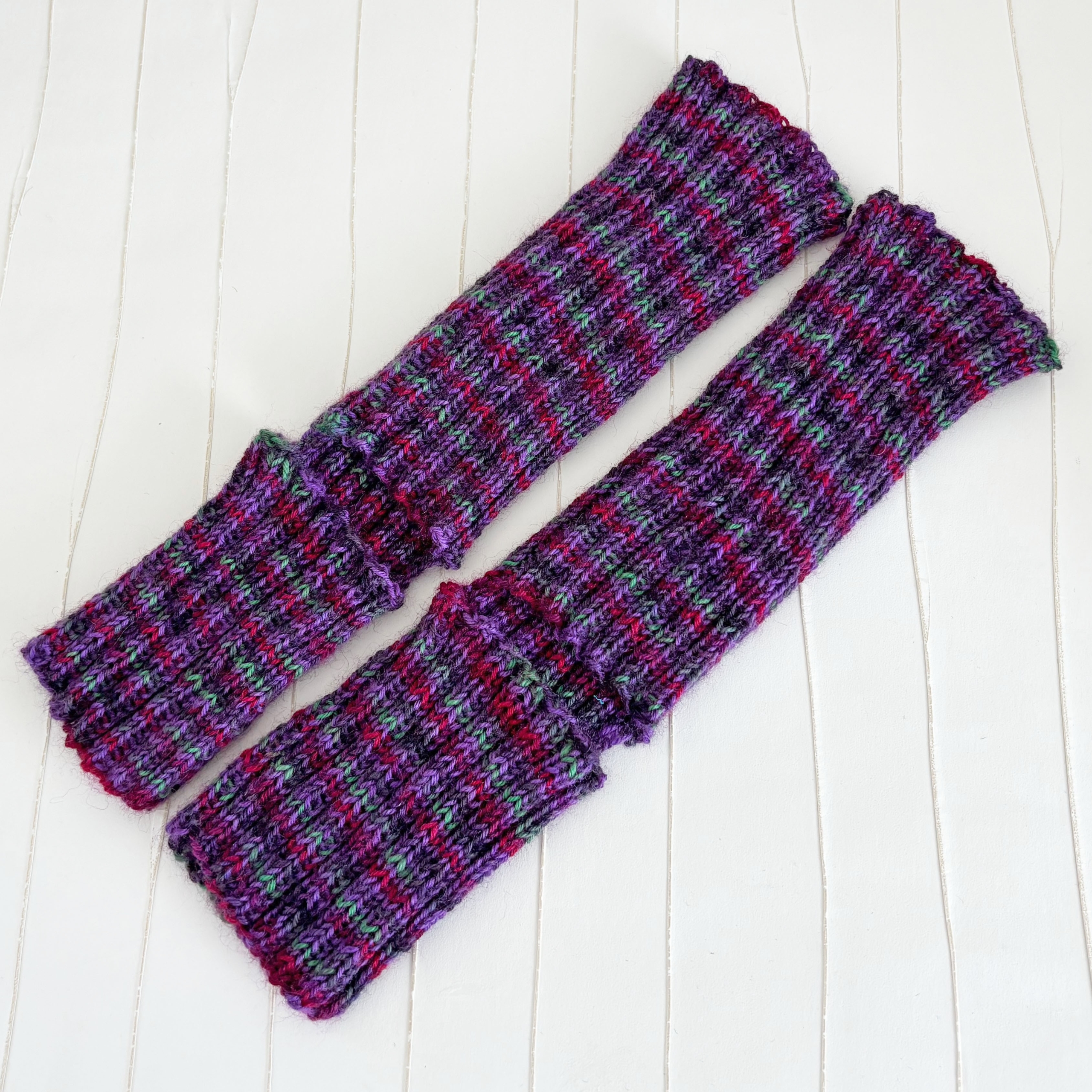 Die Socken sind in Rippen handgestrickt in Lila mit kleinen Abschnitten in Pink Grün und Dunkellila.