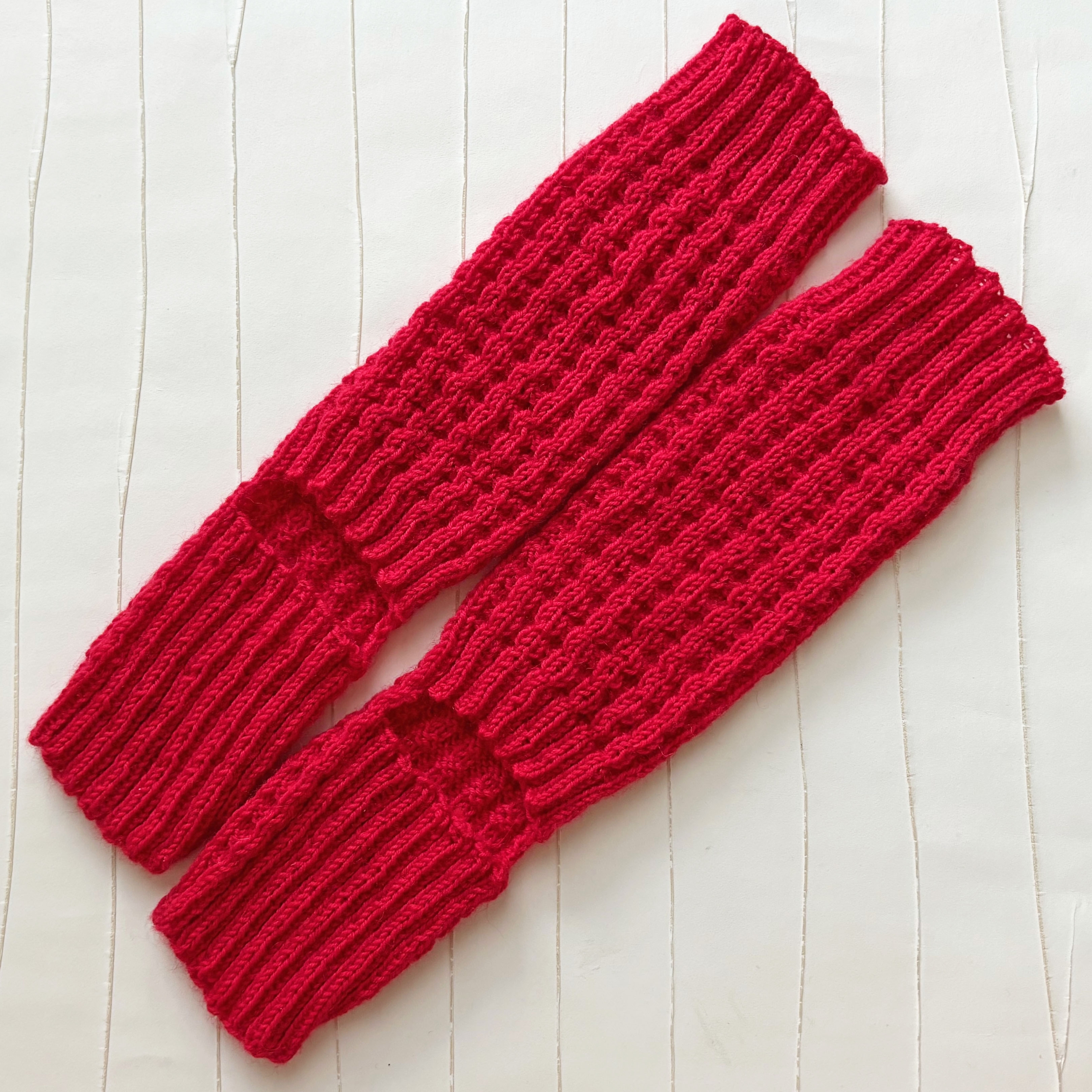 Die Wärmer sind in Waffelmuster handgestrickt.