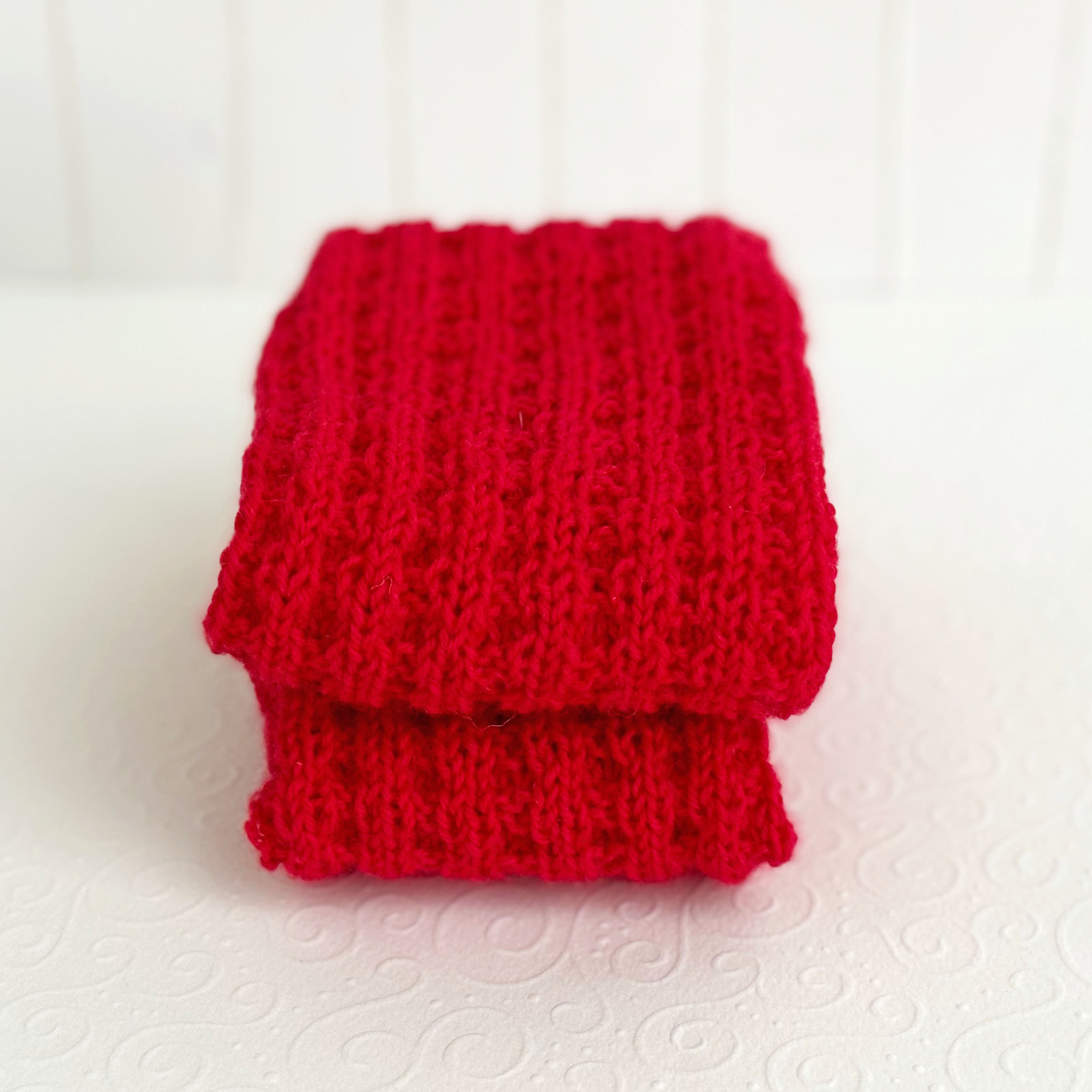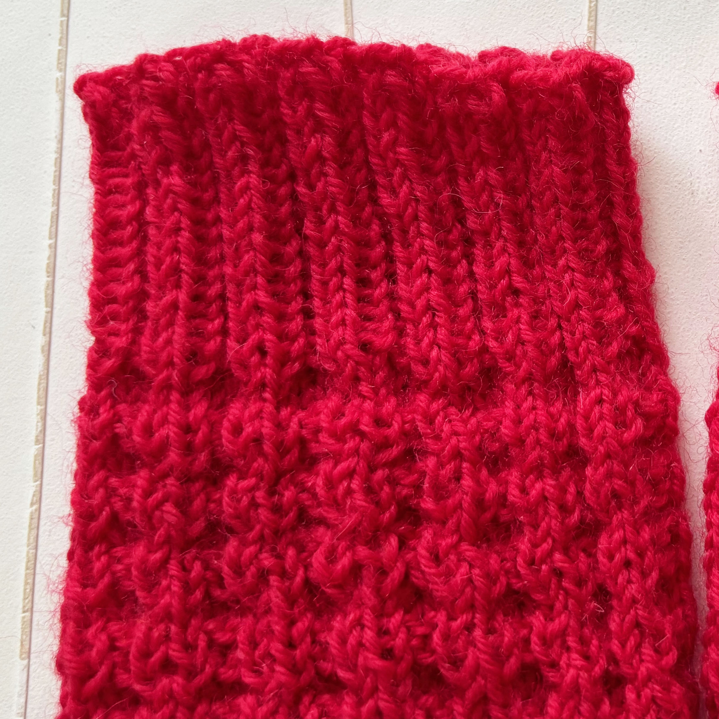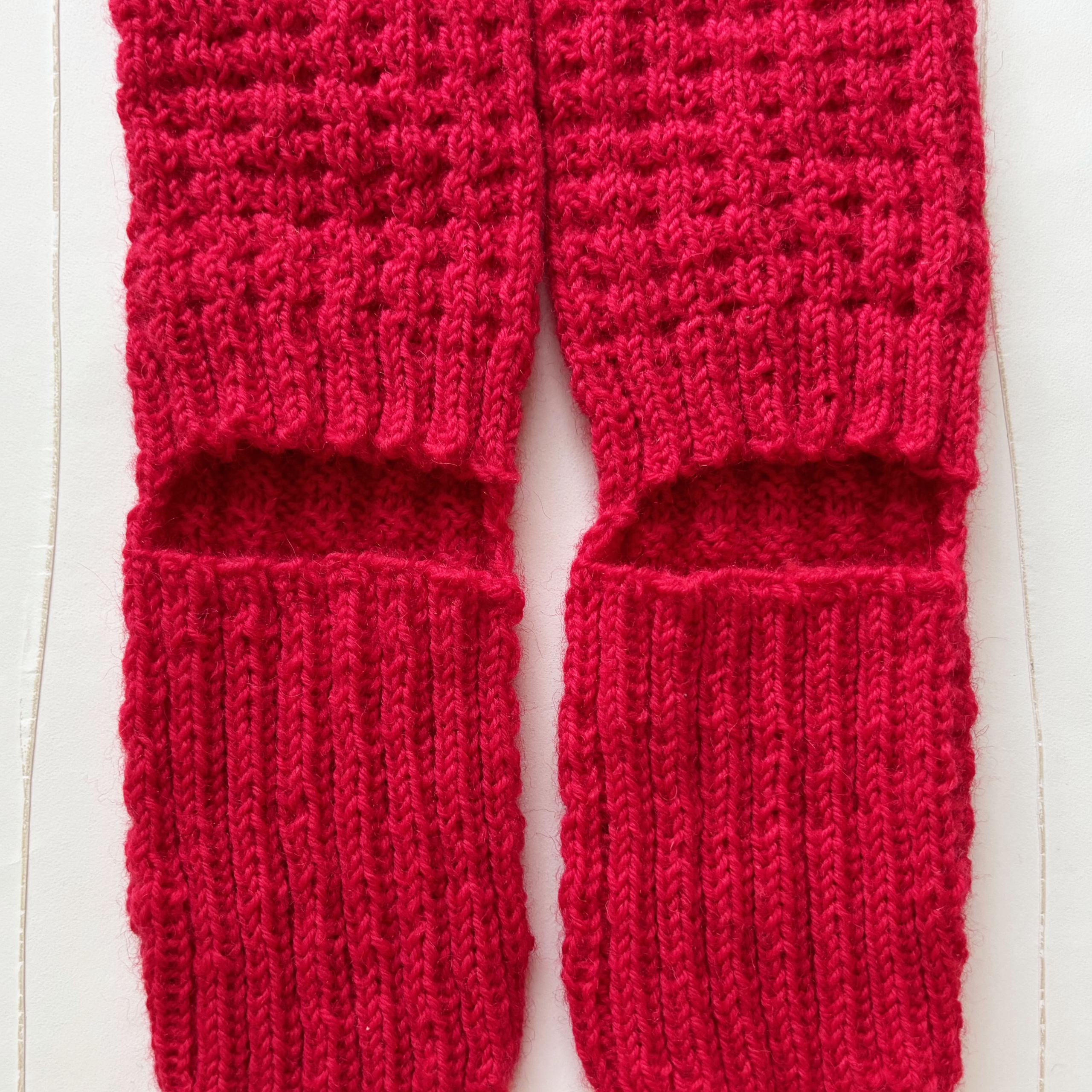 Rote Fußwärmer fersenlose Socken, offener Schnitt ohne Ferse und ohne Spitze.