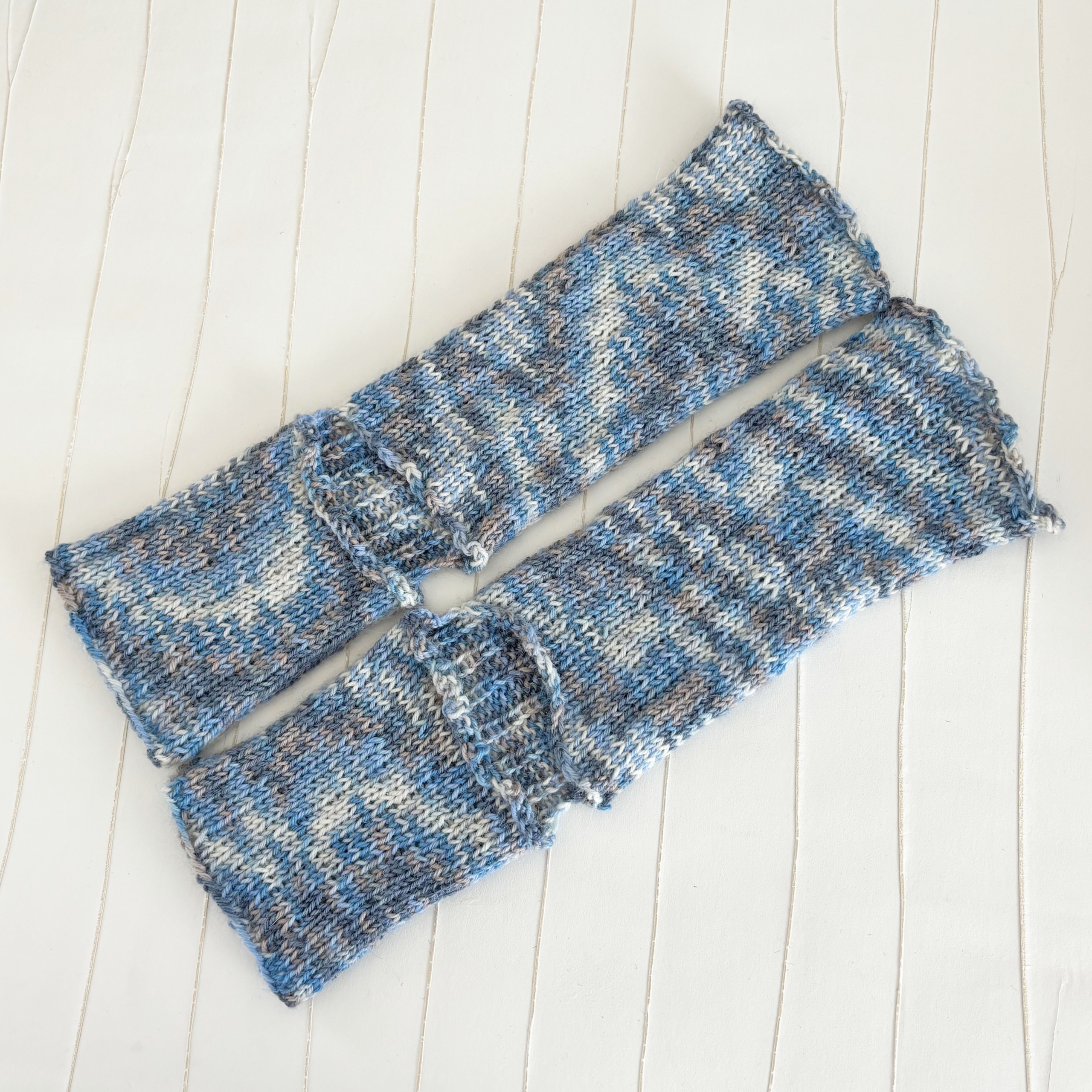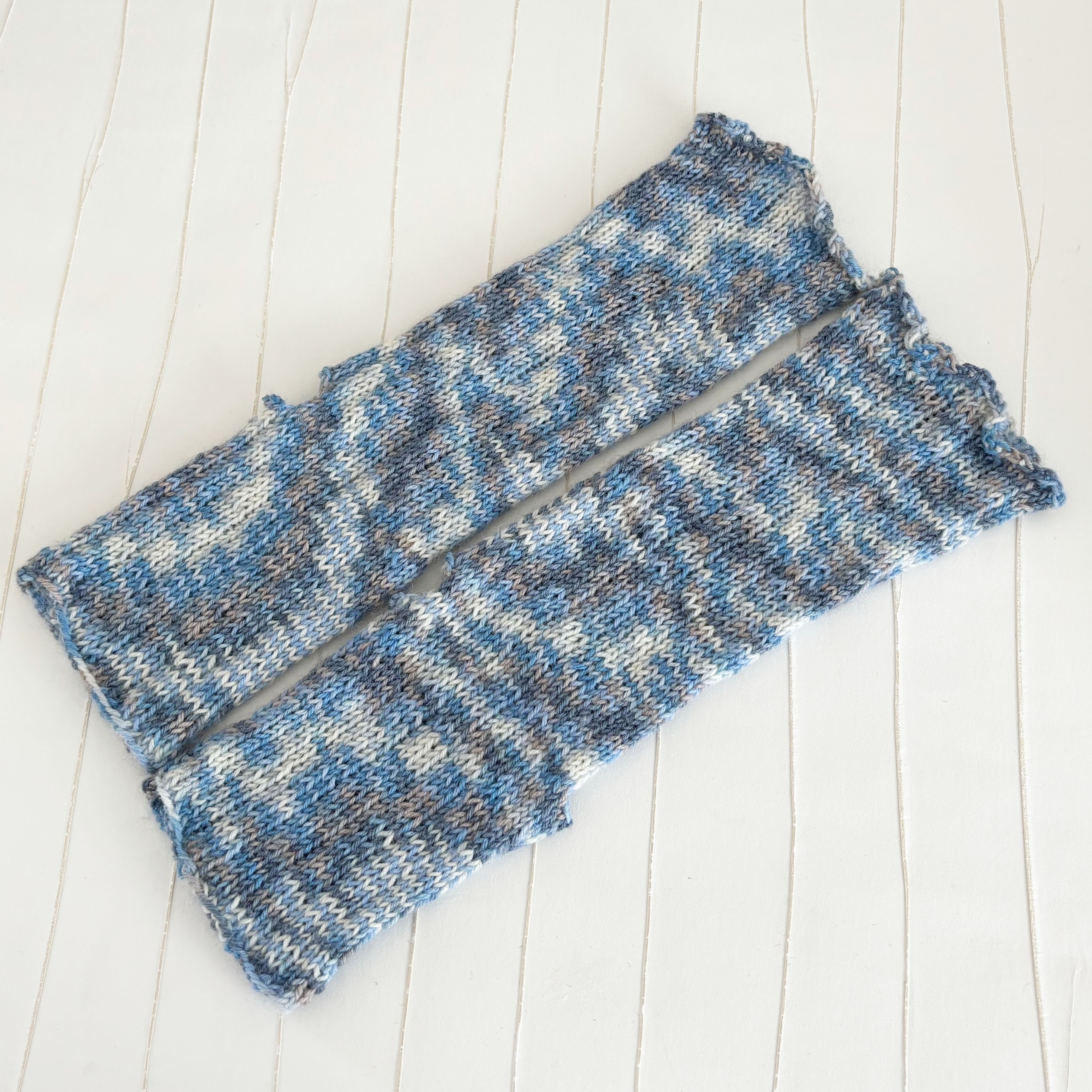 handgestrickt, der schöne Verlauf von Hellblau Grau und Weiß ergibt sich direkt aus dem Knäuel.