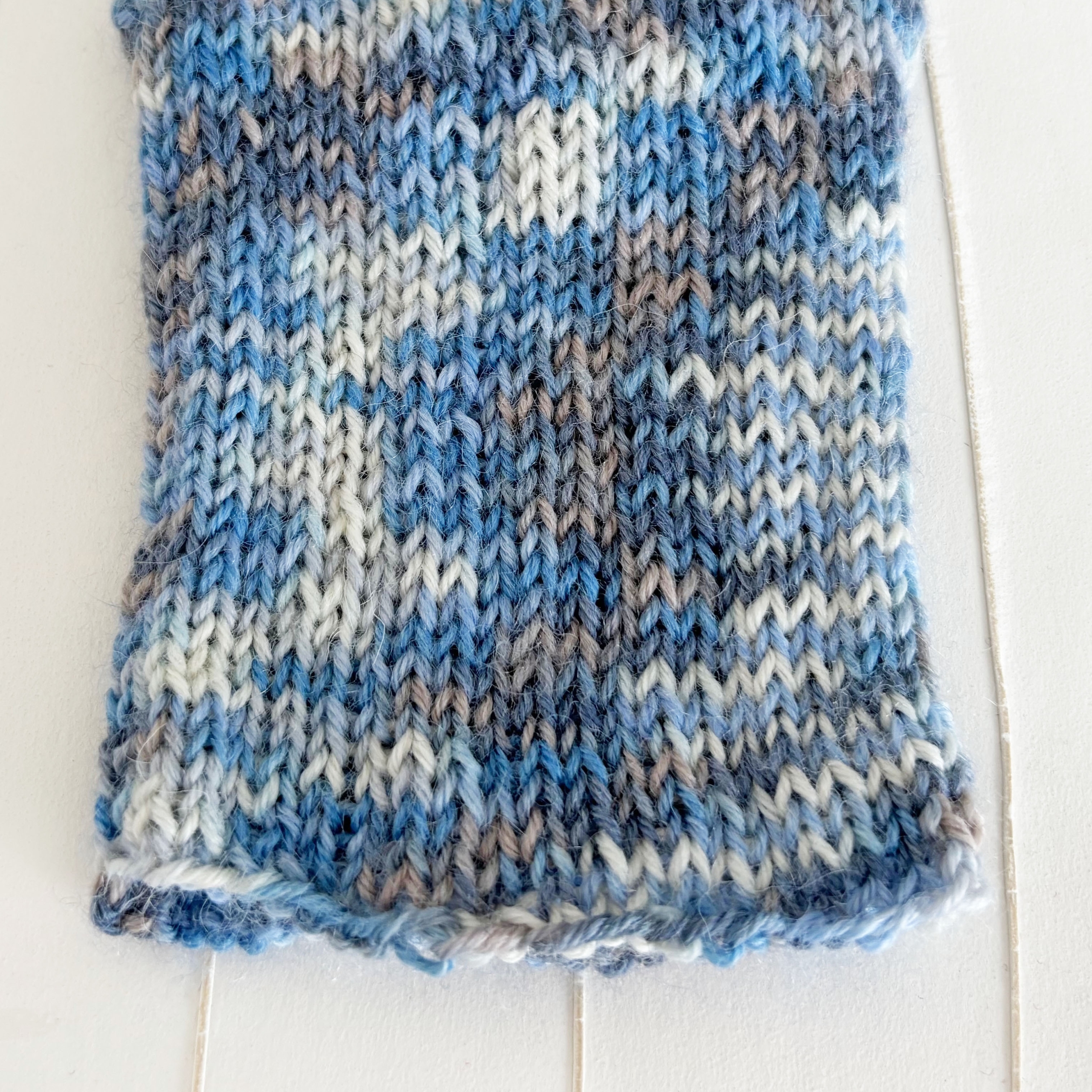 Sie wurden aus handgefärbtem Garn in flachen Rippen mit leicht gerollten Rändern