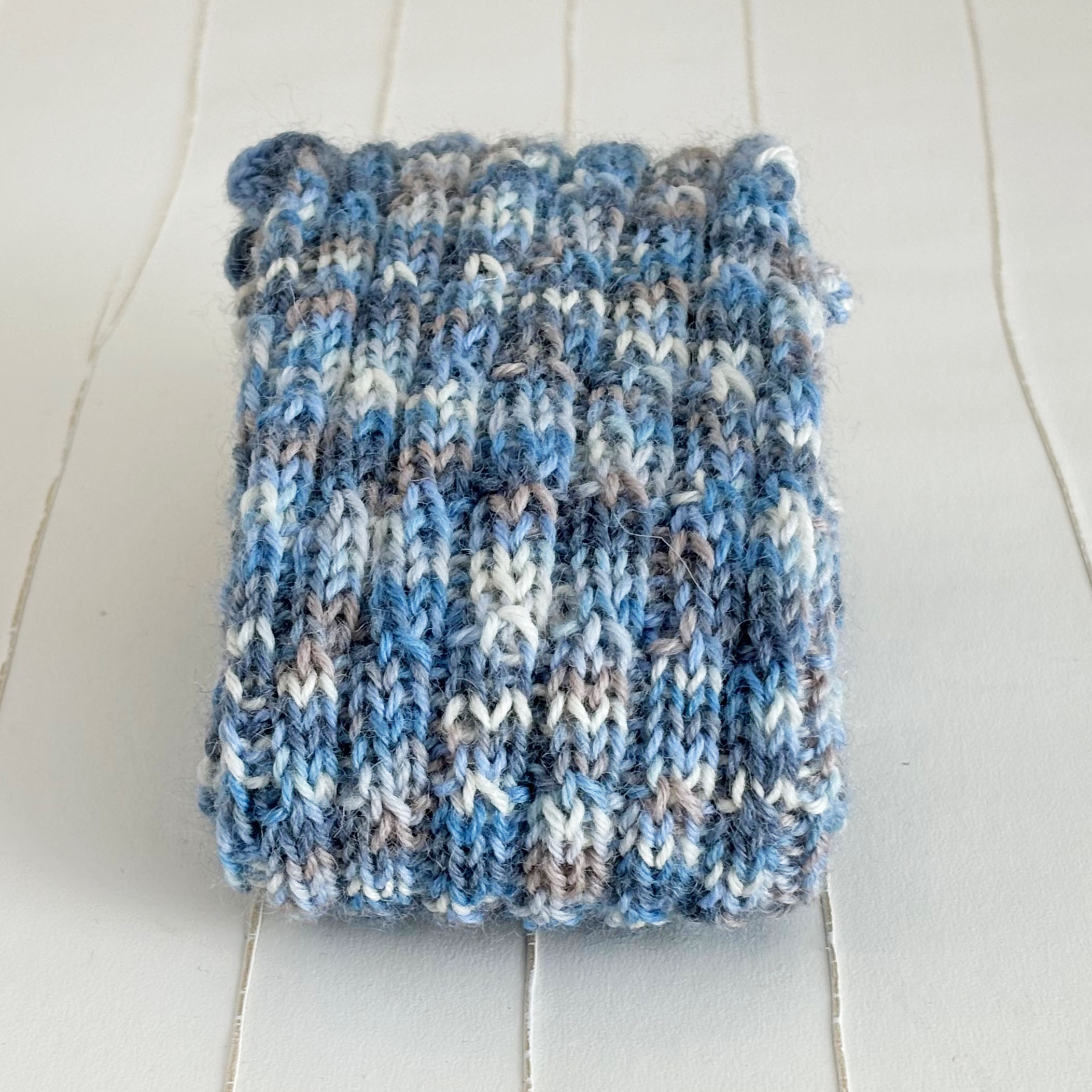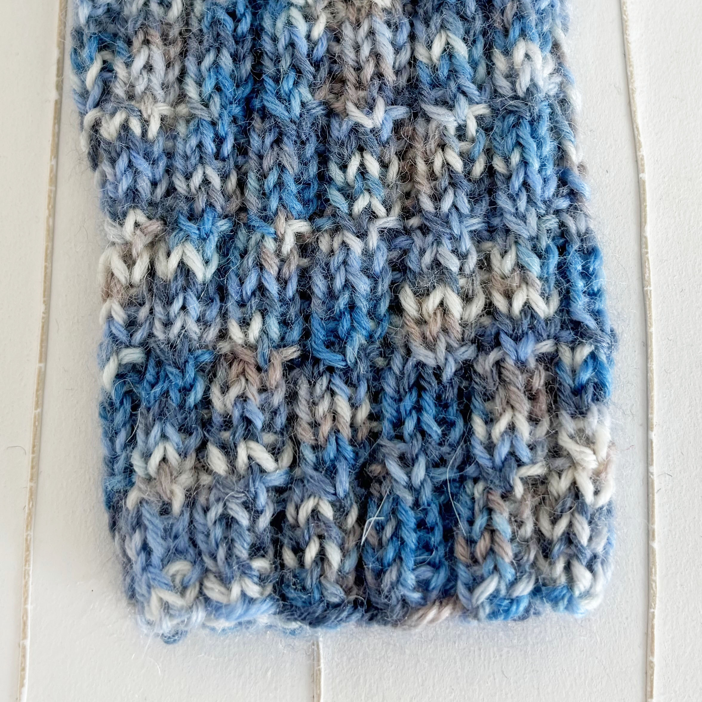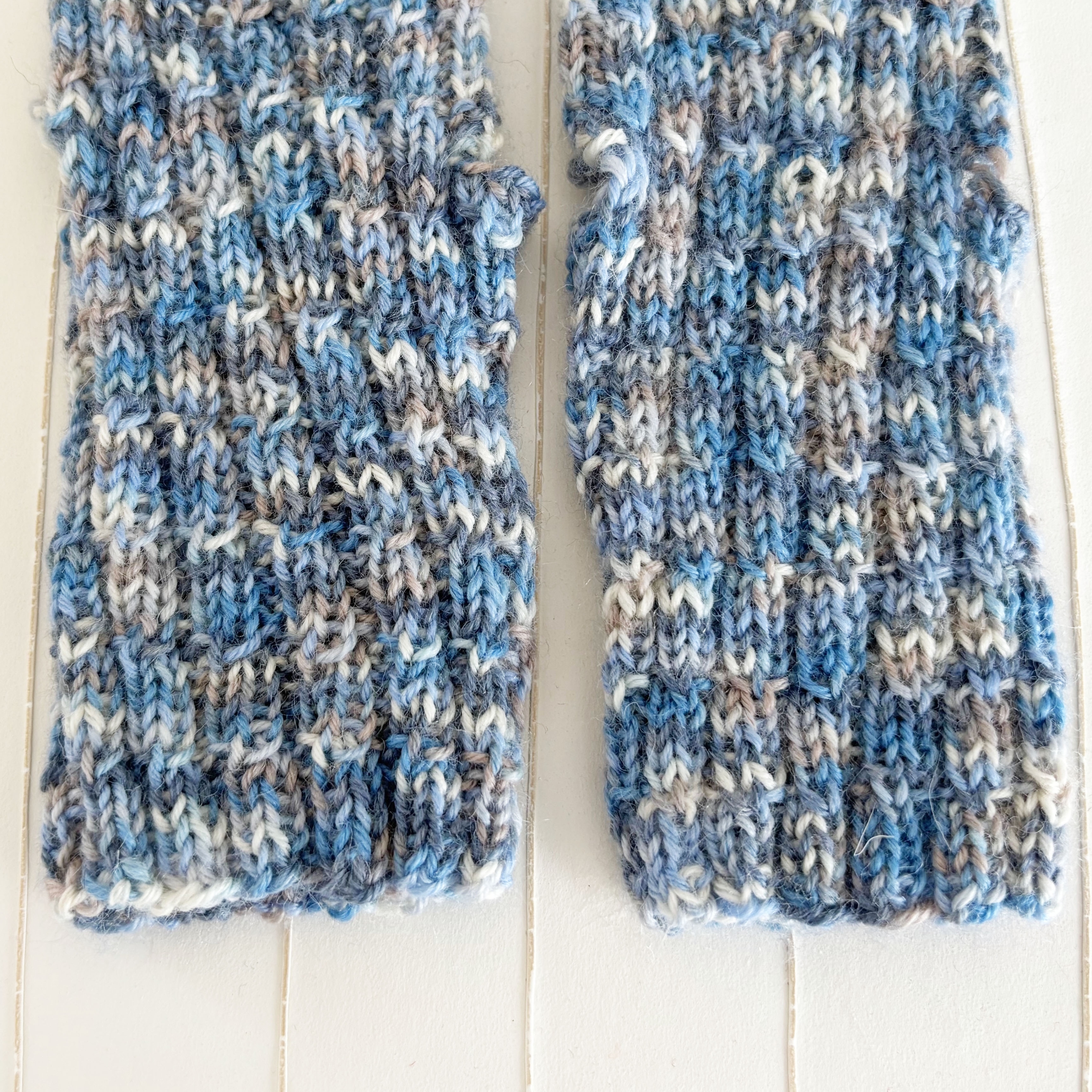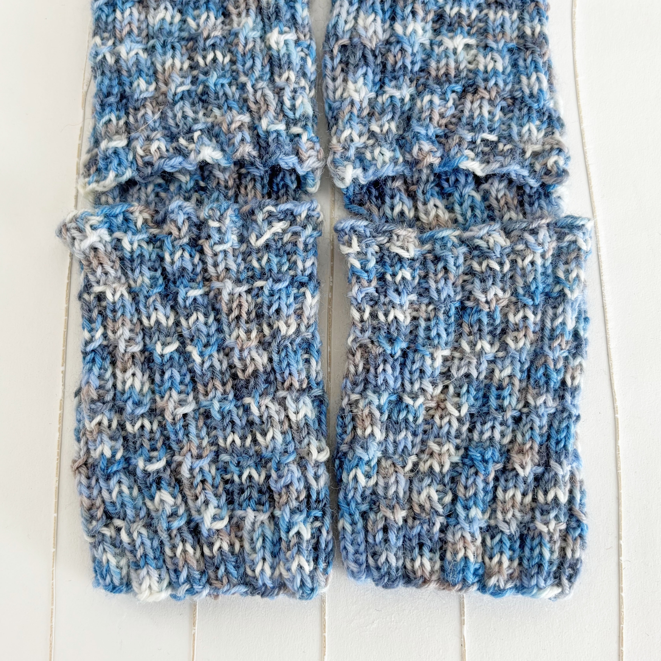 handgestrickt, der schöne Verlauf von Hellblau Grau und Weiß ergibt sich direkt aus dem Knäuel.