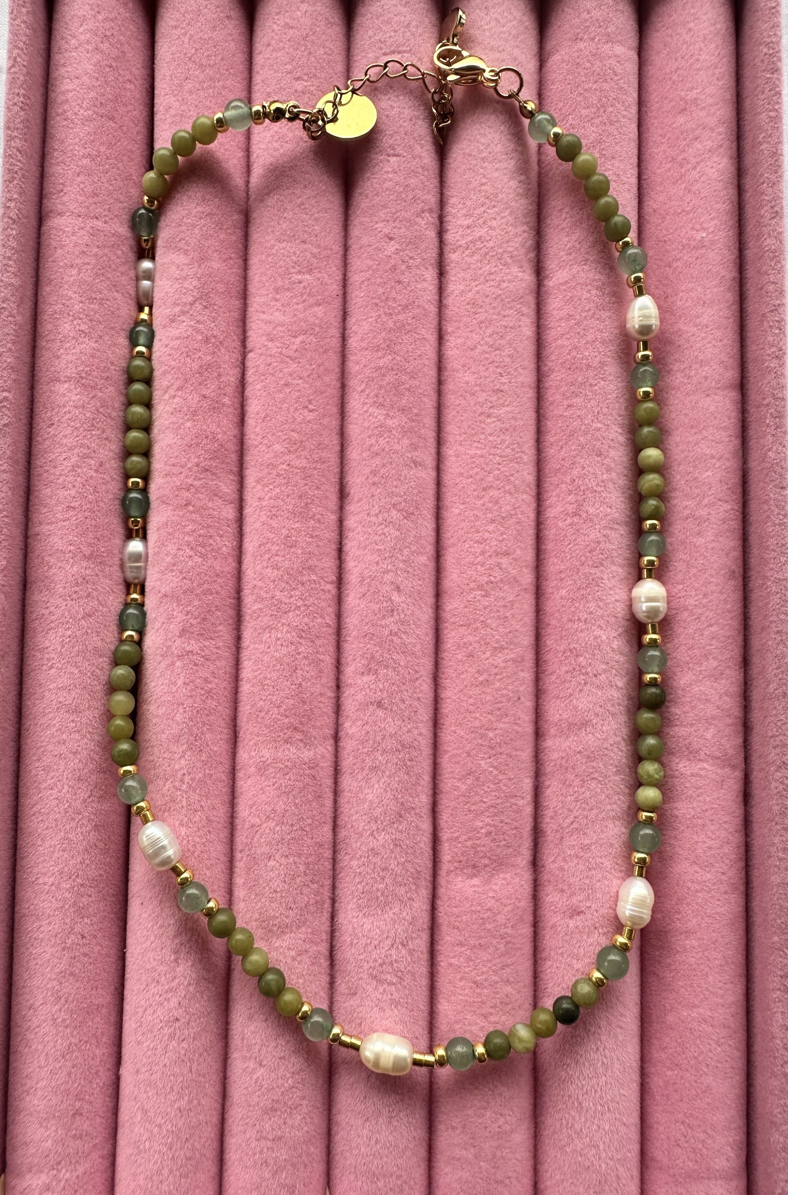 Materialien: echte Naturstein Jade 4 mm, Süßwasserperlen AA+, Edelstahl (gold, Karabiner + Verlängerung)