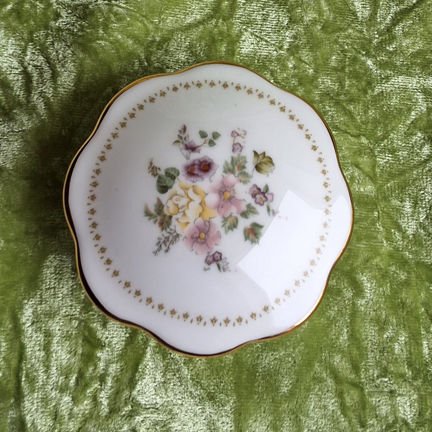 Blumen wie hingetupft, erstrahlen in zartem Pastell auf dem warmen Weiß. Dieses formschönen Porzellandöschens aus Bone China ist ein schönes Beispiel für englische Porzellankunst. Die weichen Rundungen der Blumenform des Porzellans, finden sich in den Blumen des zentalen Motives wieder und werden eingefasst durch einen schlichten Goldrand. Dem Übergang zwischen leicht gewölbtem Deckel und Deckelrand, wird durch eine dezente Kette aus lindgrünen Ornamenten ein Rahmen gesetzt.