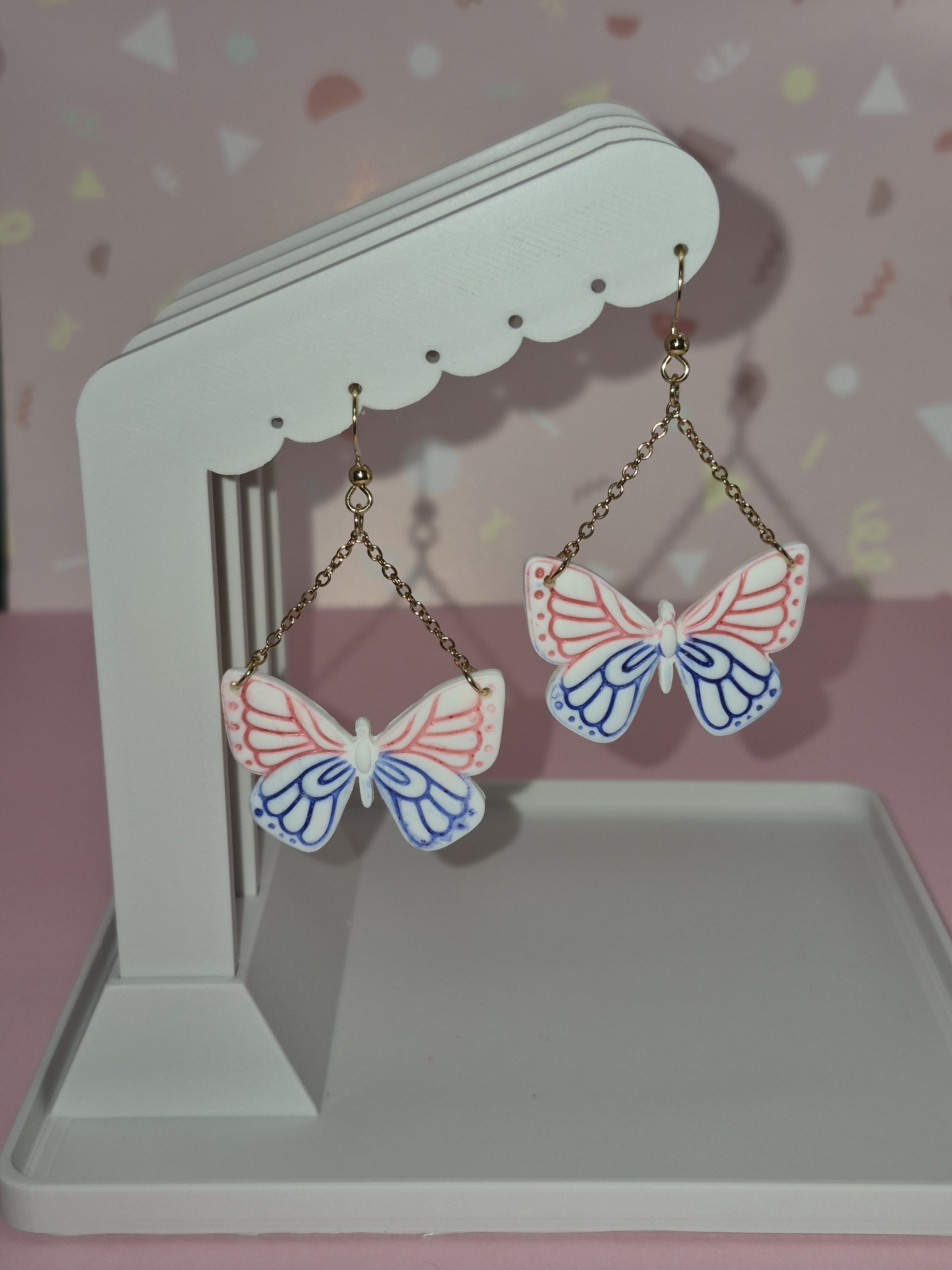 Der Stil ist eine Mischung aus Boho-Chic und moderner Romantik. Durch die V-förmige Kettenaufhängung bekommt der Schmetterling eine schöne Dynamik und bewegt sich sanft bei jeder Kopfbewegung. Die pastelligen Töne wirken frisch und feminin.