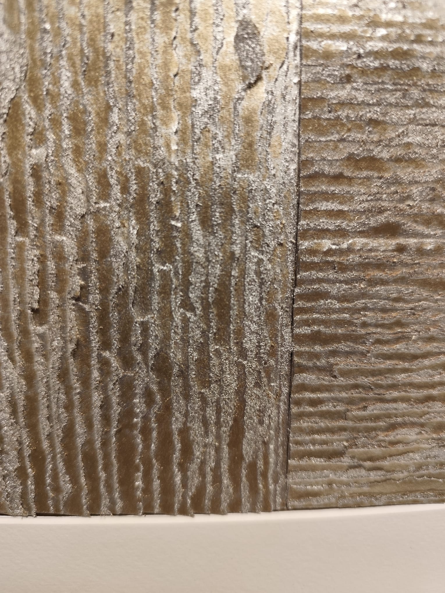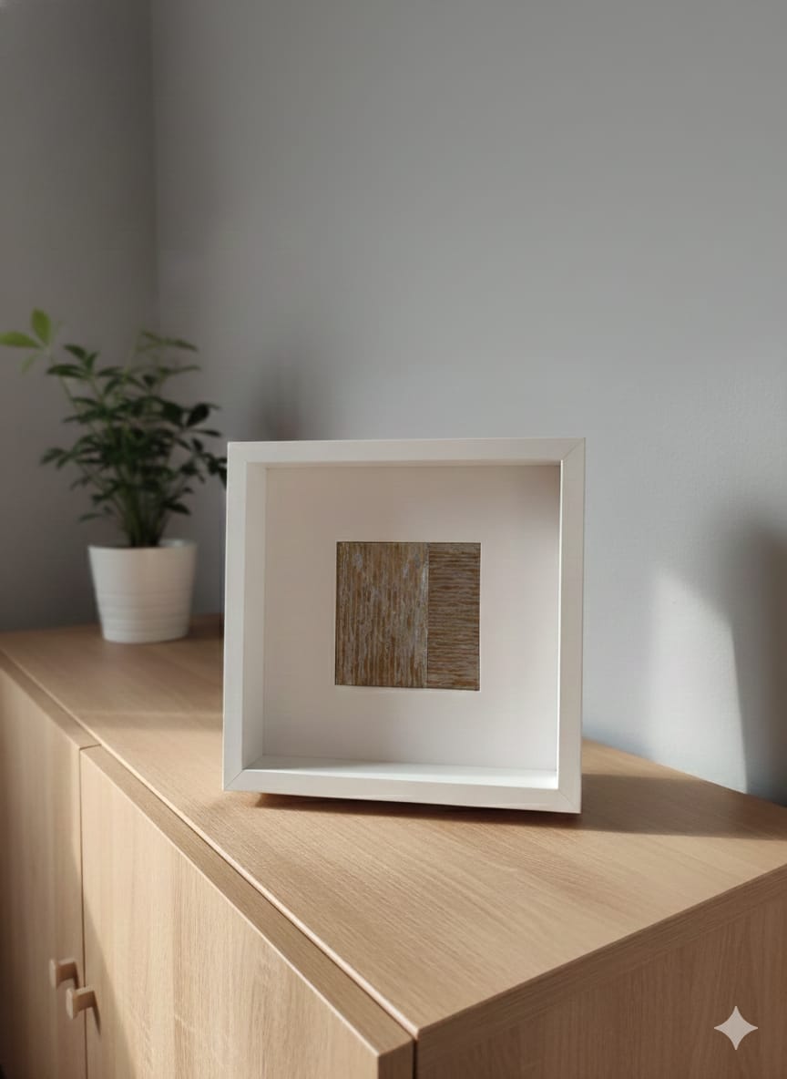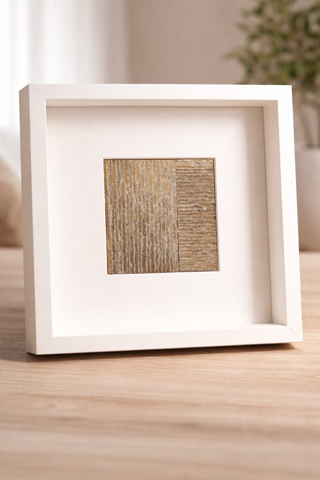 Dieses minimalistische Bild besticht durch seine klare Formsprache und natürlicher Textur. In einem weißen Schattenfugenrahmen gefasst, setzt es einen ruhigen, eleganten Akzent in Ihren Räumen. Es kann aufgehangen oder hingestellt werden.