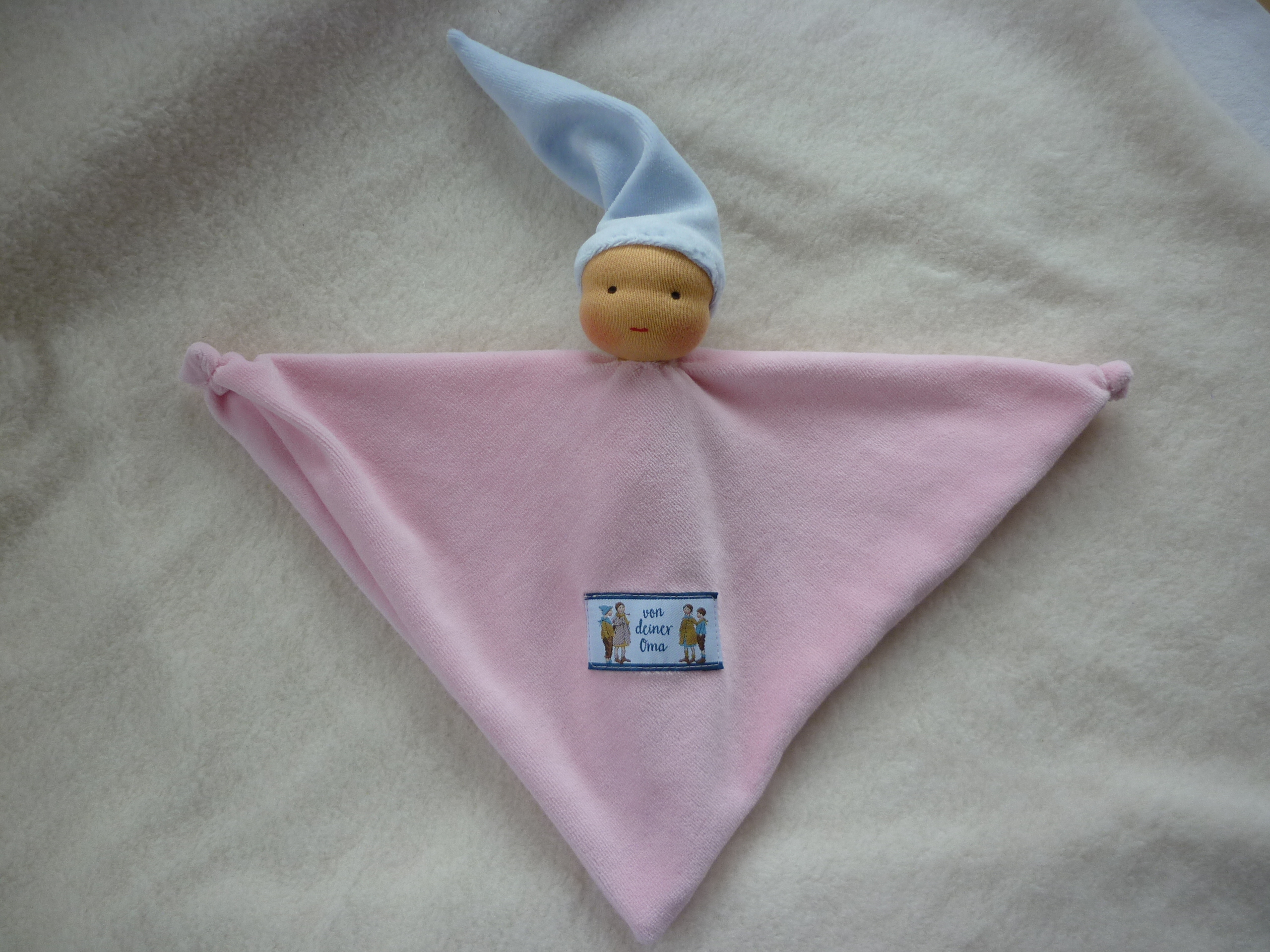Der Körper ist aus rosé Nickistoff genäht und nur der Rumpf weich gestopft. Der Kopf aus Puppentrikot ist mit Schafwolle gefüllt, Mund und Augen sind mit Stoffmalfarbe dezent gemalt, die hellblaue Zipfelmütze ist ebenfalls aus Nicki.