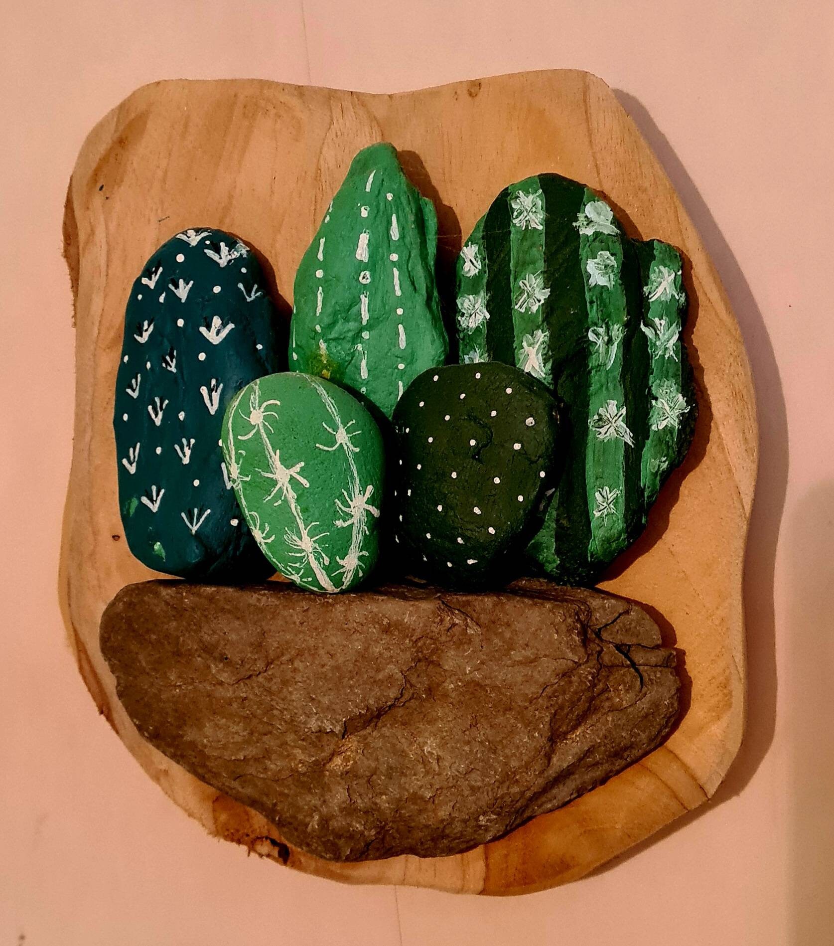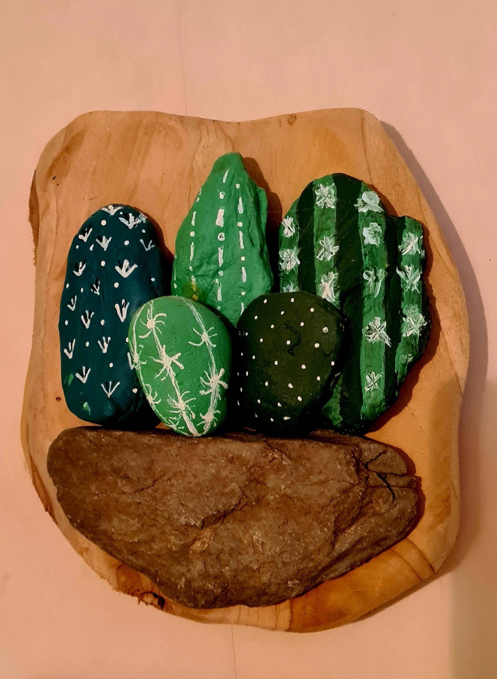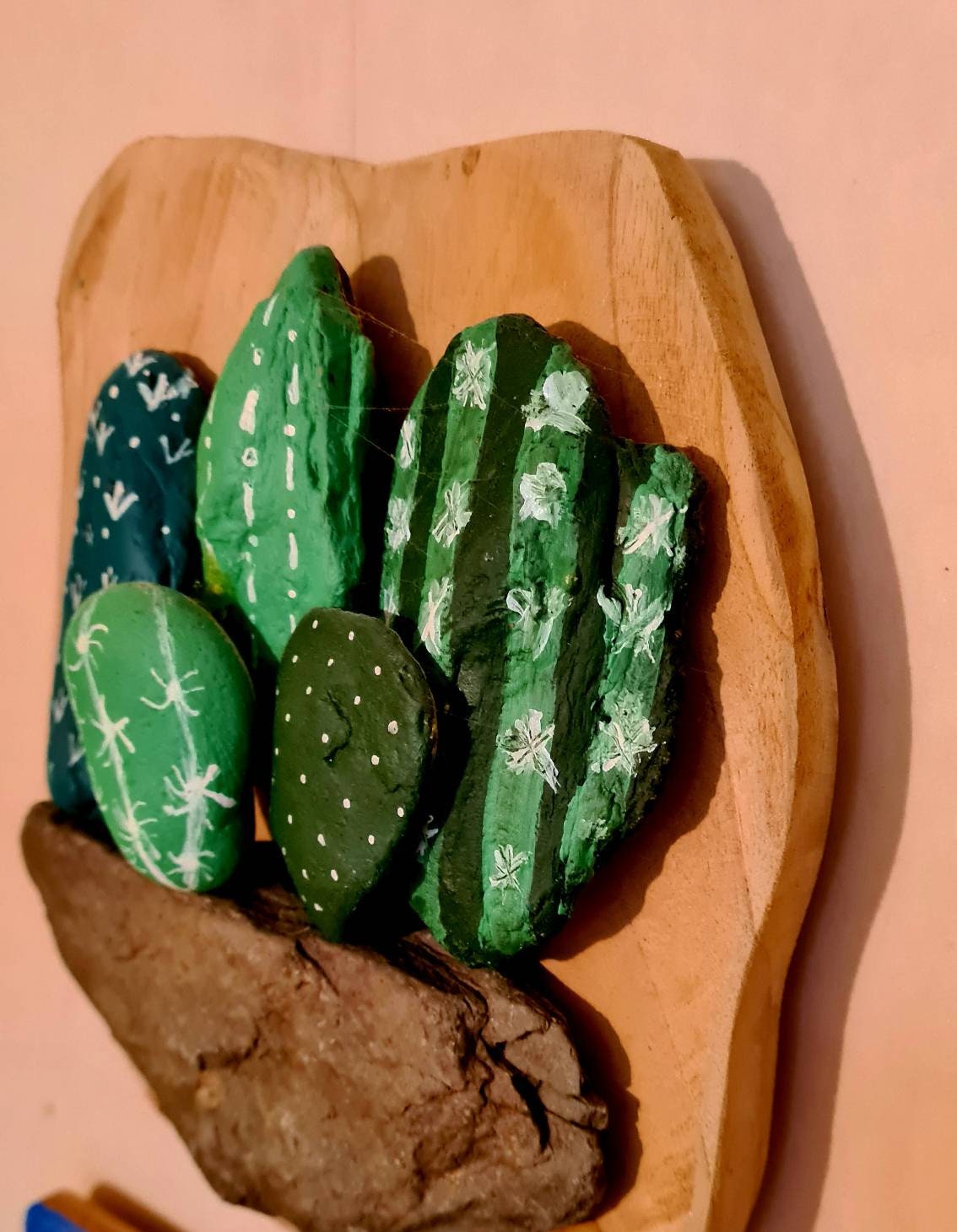 Steinbild in Form eines Kaktus, handgemalt auf Teakholzbrett, mit Aufhänger auf der Rückseite.