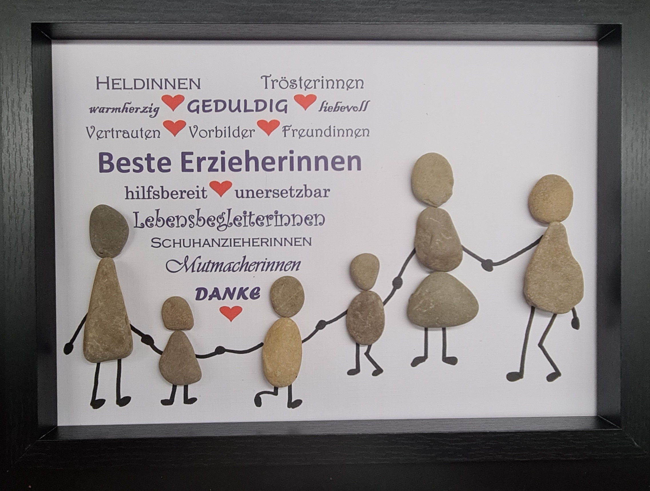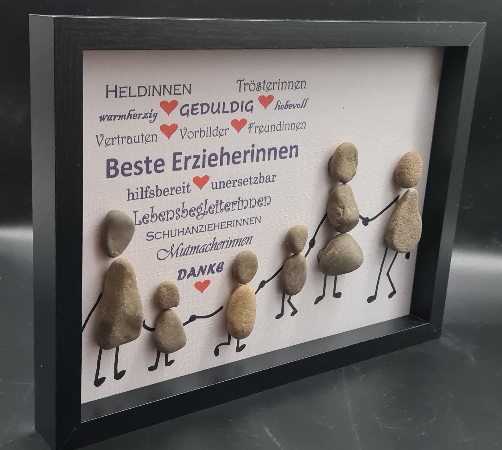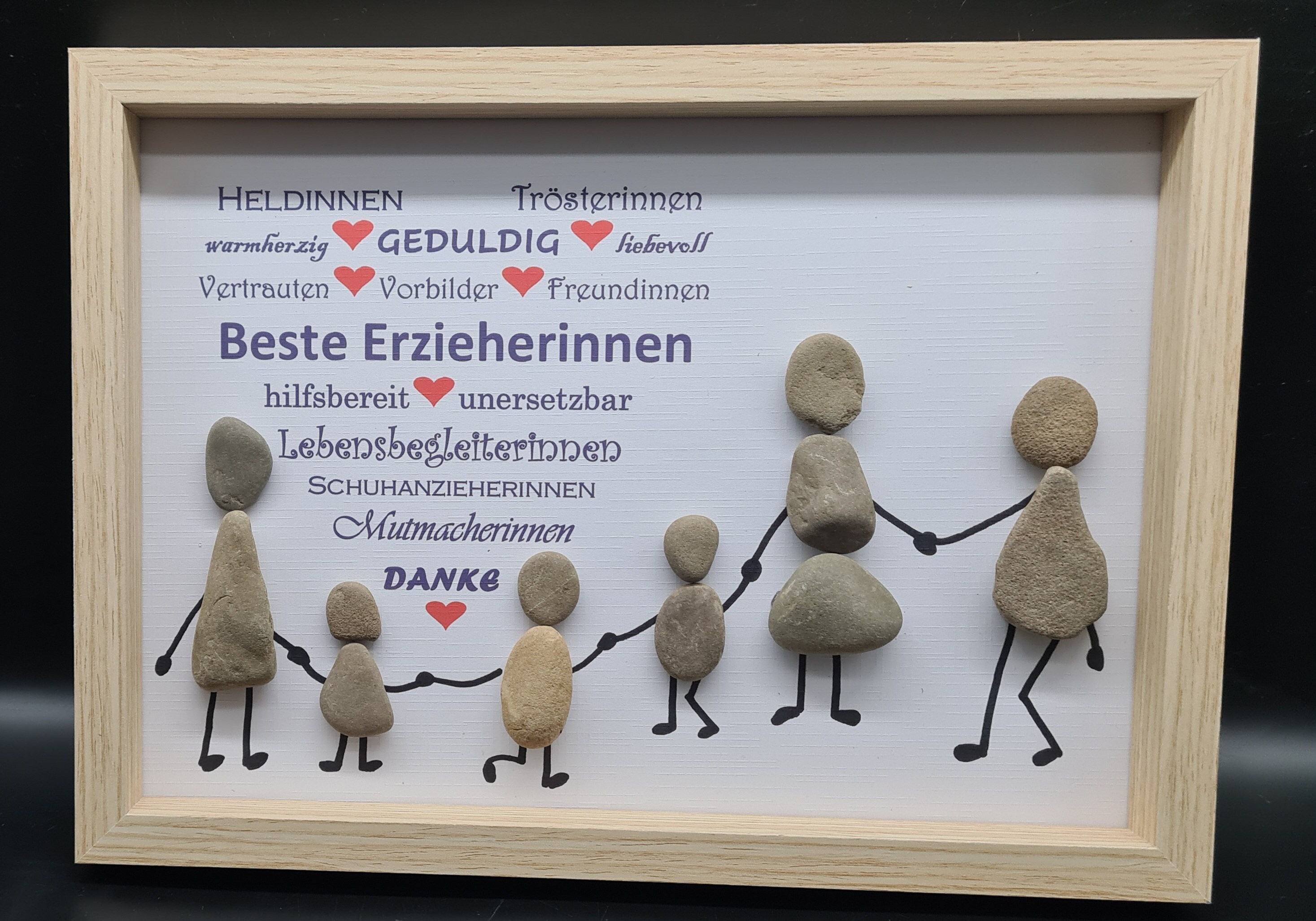 Liebevoll handgefertigtes Steinbild als Geschenk für die Erzieherinnen um Danke für die schöne Zeit zu sagen und zum Abschied vom Kindergarten. Die Anzahl der Kinder oder der Erzieherinnen ist auch variabel.