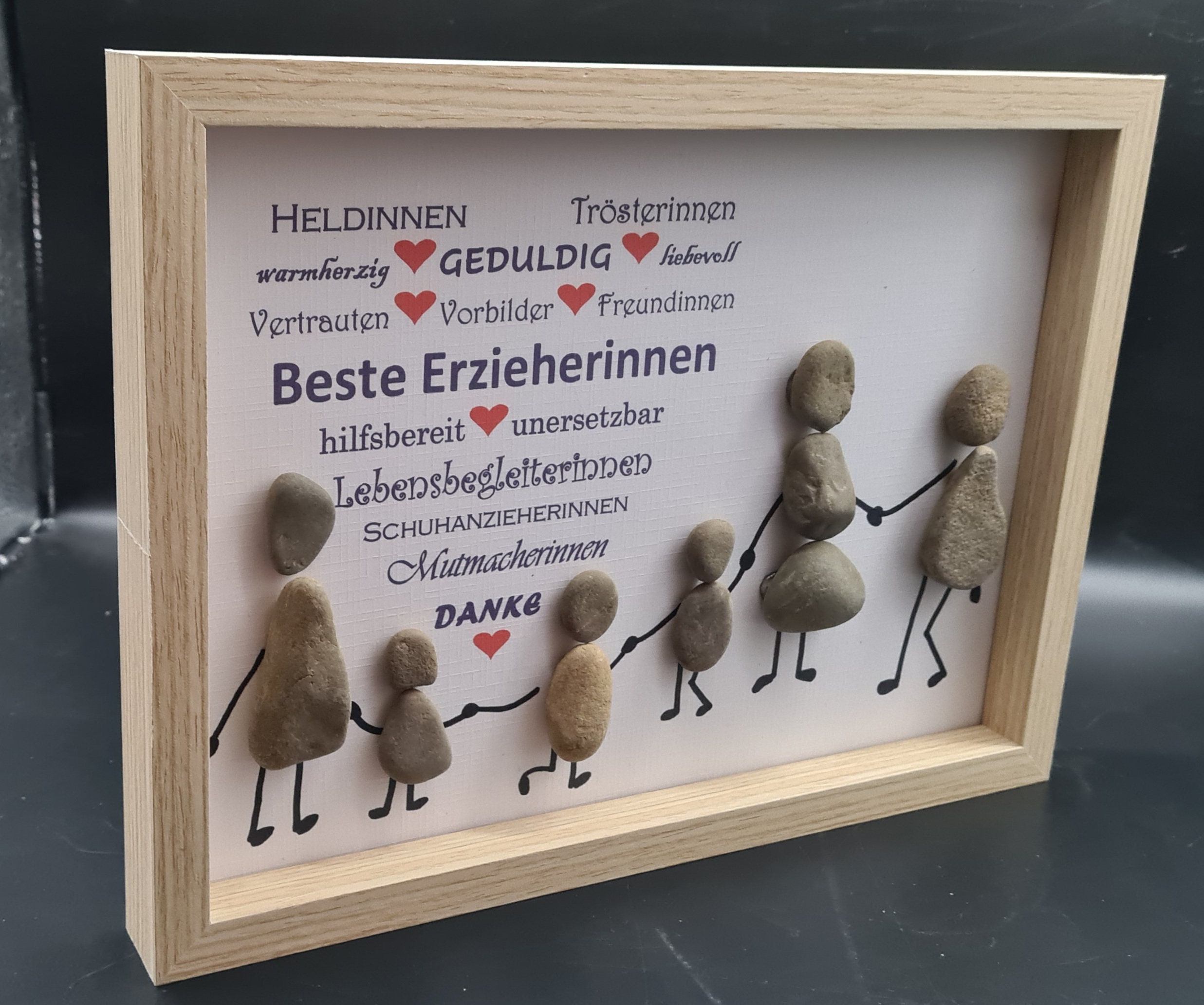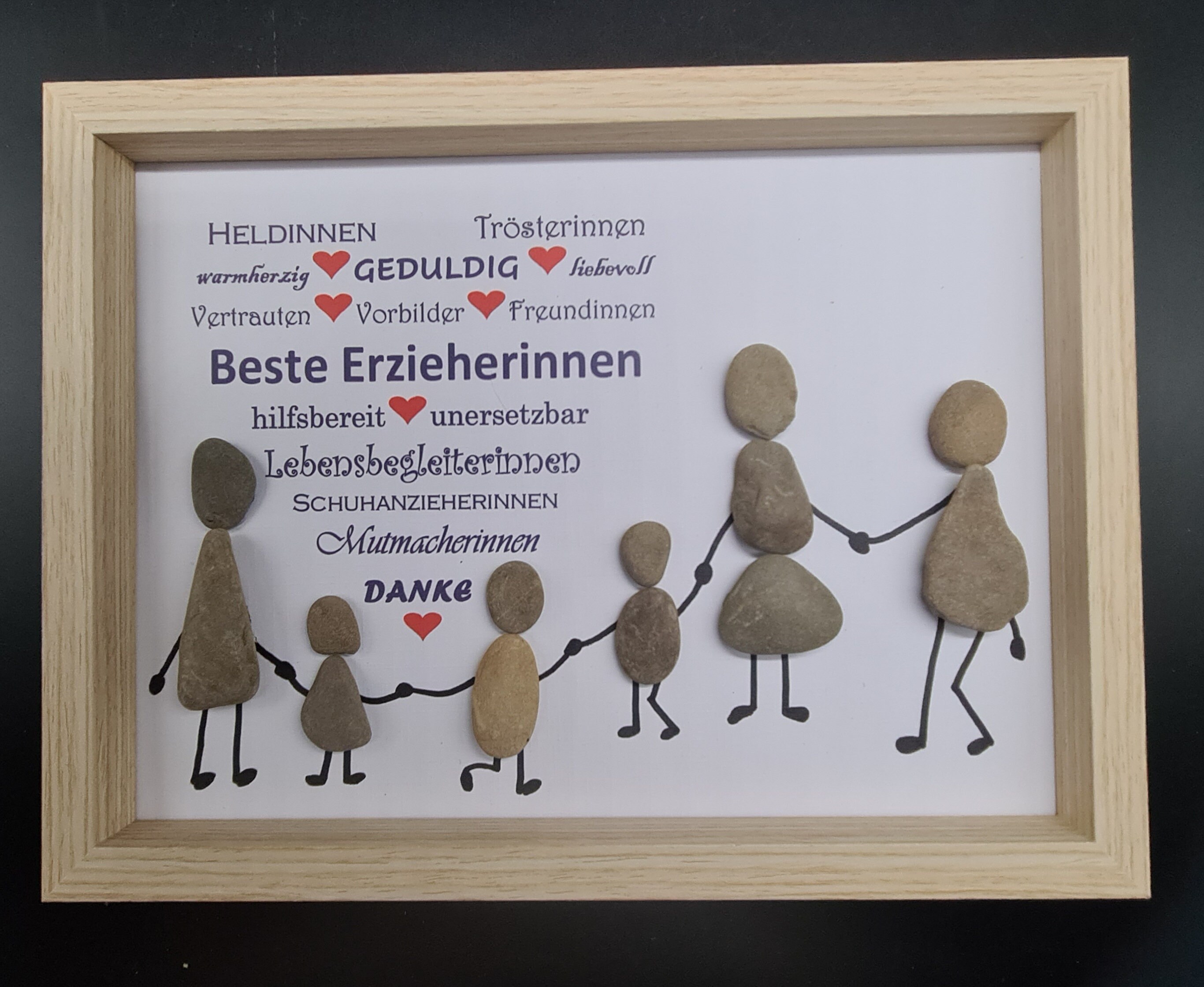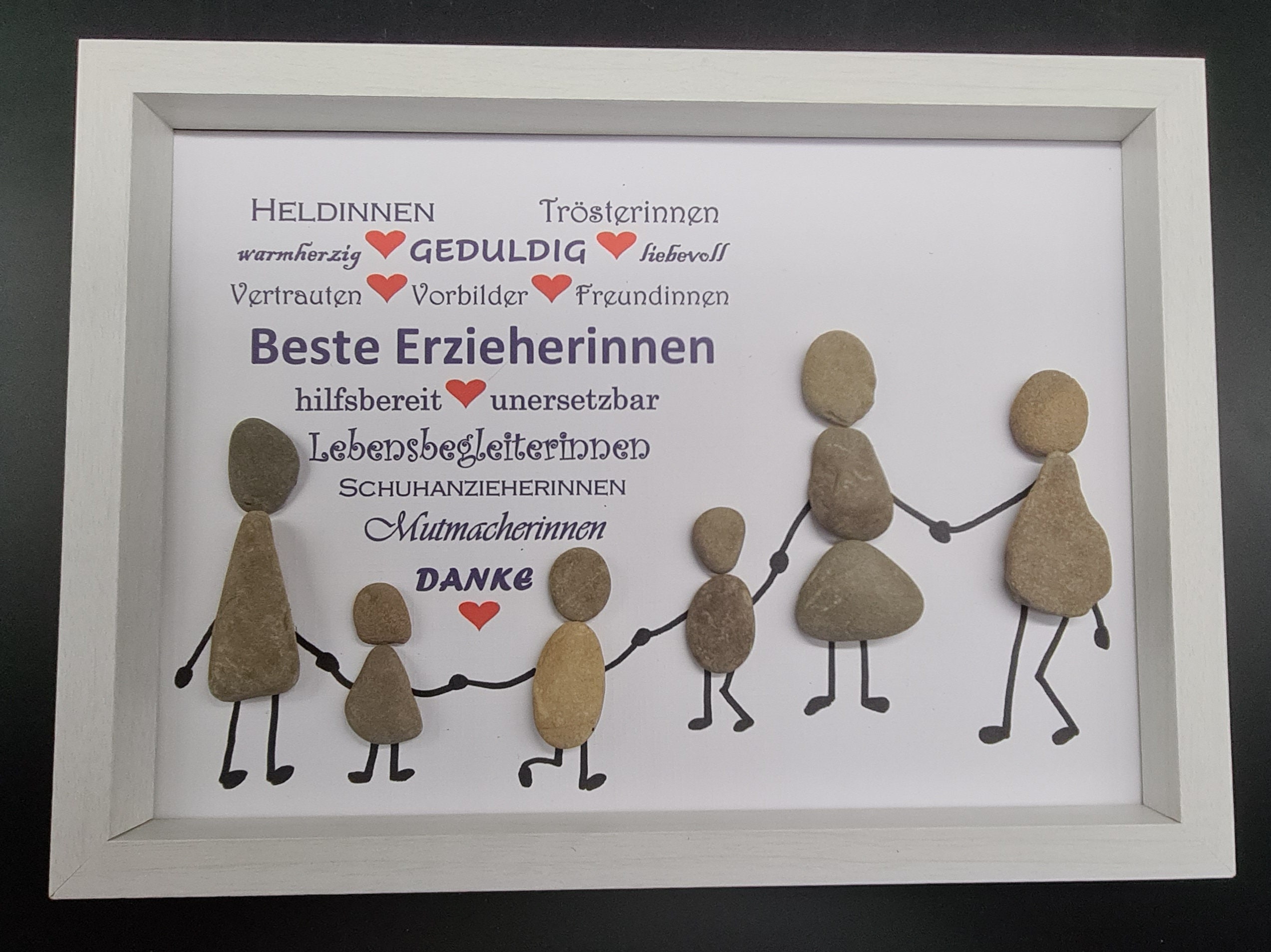 Liebevoll handgefertigtes Steinbild als Geschenk für die Erzieherinnen um Danke für die schöne Zeit zu sagen und zum Abschied vom Kindergarten. Die Anzahl der Kinder oder der Erzieherinnen ist auch variabel.